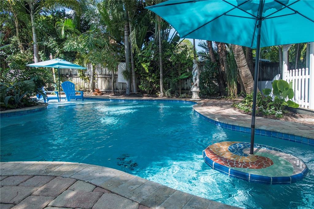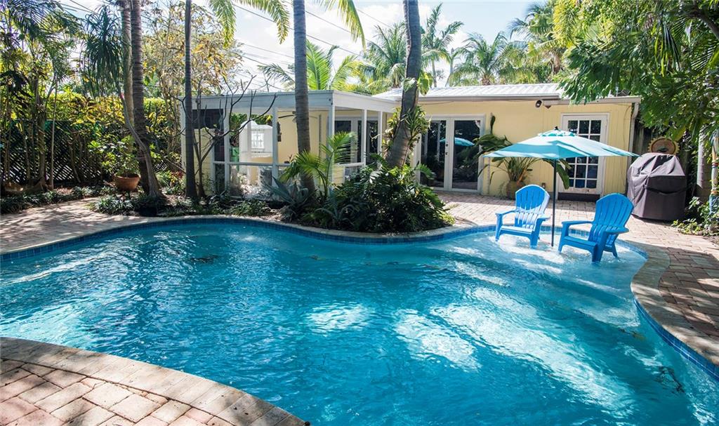 Imagine...in coveted East Fort Lauderdale...1.5 miles from the Atlantic Ocean, this 2/1 home was built in 1951 and lovingly restored with vintage woodwork, doors and floors. Dade County Pine flooring was recovered from a 1926 villa and installed in the living room, hallway and kitchen. 400+ sq ft Florida room with acid stained concrete floor and dry bar with wine cooler. Saltwater pool with a 6 inch deep shelf and a wrap around built in bench and a table in the pool, and there's even an outdoor fireplace!
