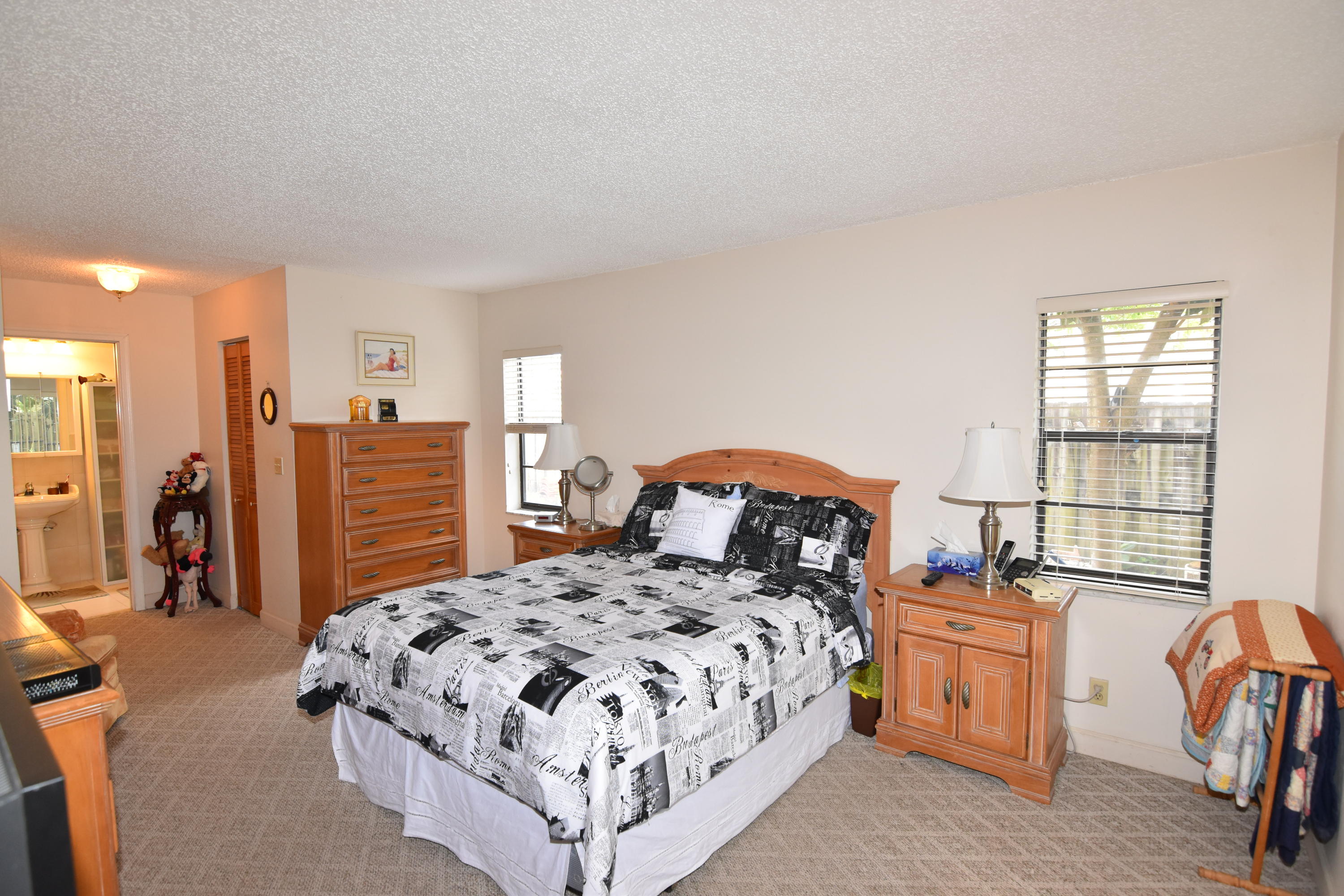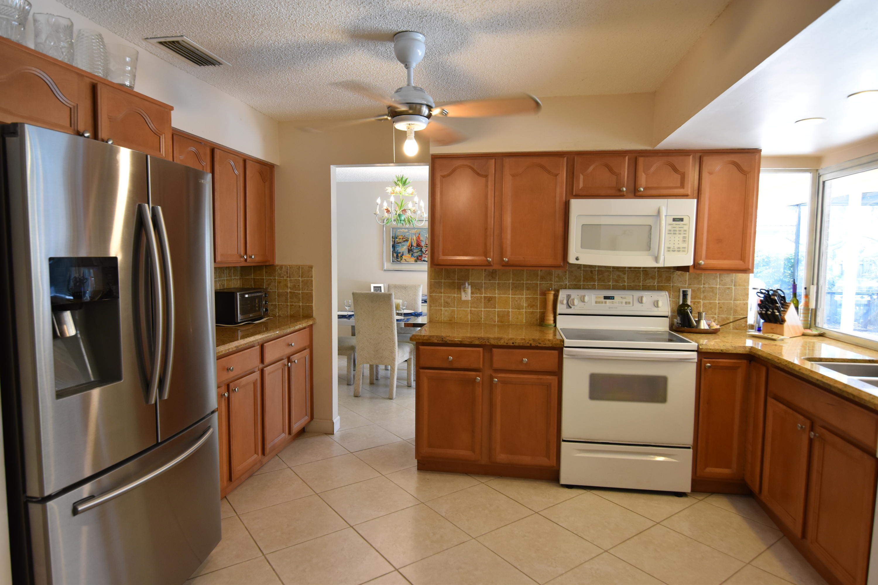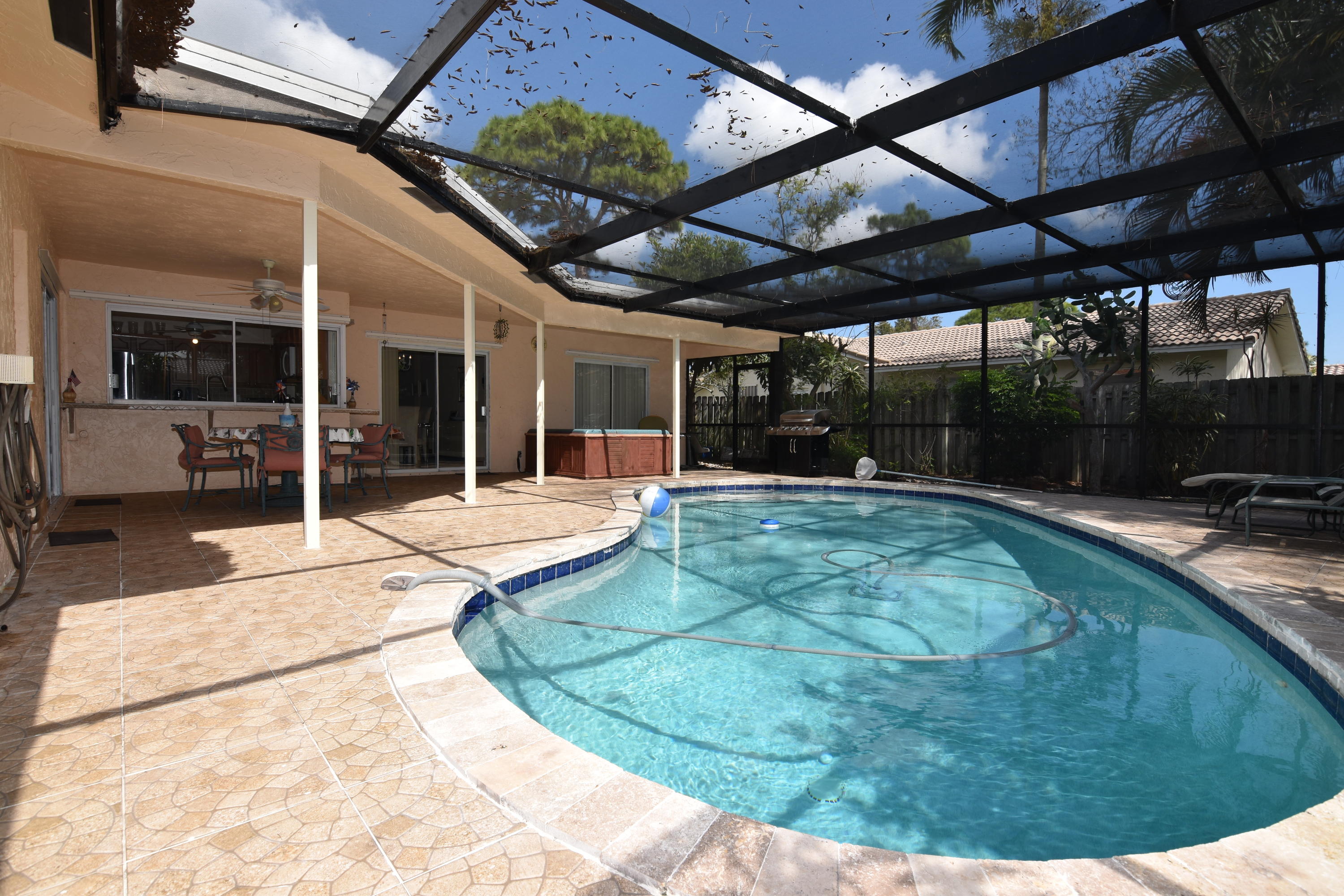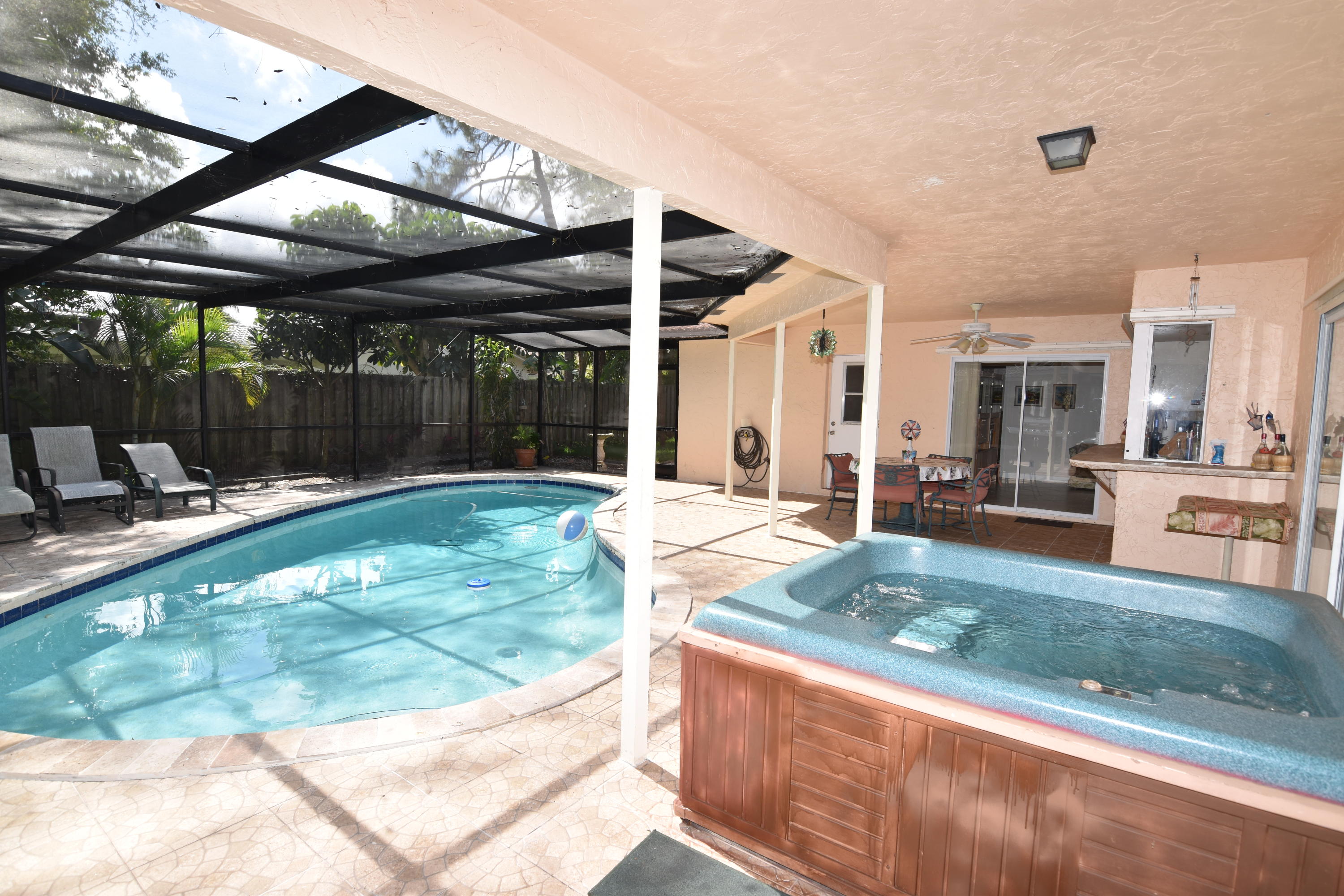 Do not miss this updated, 3 bedroom / 3 bath, split bedroom floor plan home in Timbercreek. The interior layout has a dining area, family room and living room. The kitchen has been updated with wood cabinetry, granite counters and tile backsplash. The large master suite has walk in & reach in closets, updated bath w/ step down shower and pedestal sink. The guest suite / 2nd bedroom has a totally renovated bath w/ shower and separate entrance. There is 18'' ceramic tile, on the diagonal in all the living areas. The cabana / guest bath has also been totally redone with dual vanities, newer tub and custom lighting. The screened, pool / patio area is very private and great for entertaining or just relaxing. The patio is all tiled and does have a large covered area. The entire yard is fenced.