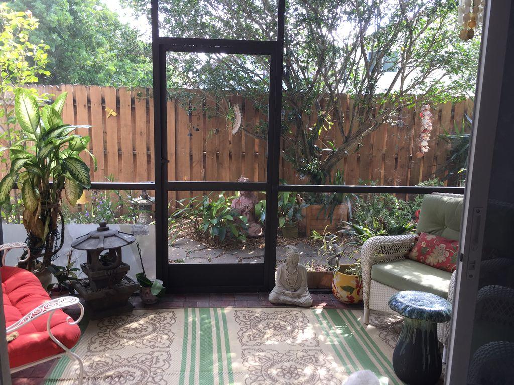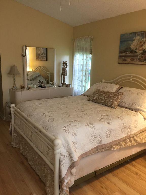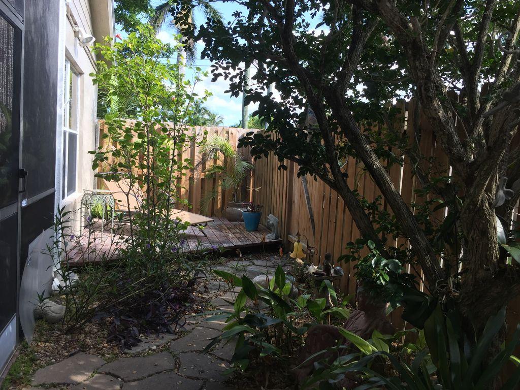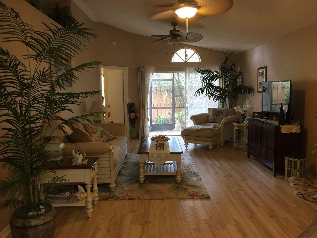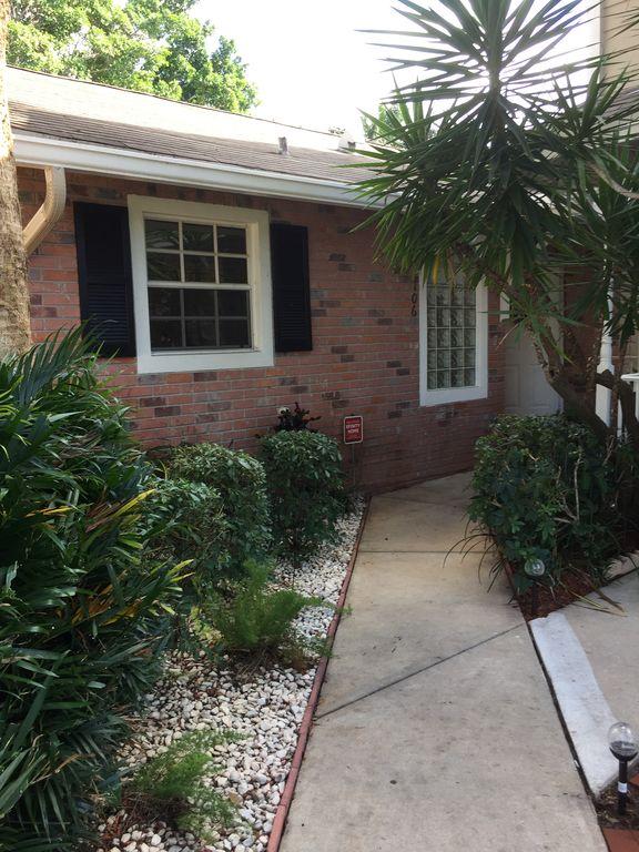 One story well maintained 2/2 . Attached only by private storage.Low assn fee covered new roof & exterior painting. Inside is clean, freshly painted, open feeling with cathedral ceilings. No-glare tinted windows. Glass block window treatment. New air condition. .Wood laminate flooring throughout. Nice sized screened patio and fenced private yard. Large private locked storage room, can be workroom. Assigned parking and lots of guest parking. All new remold, custom cabinets with granite counter tops, marble in master bath. Pets ok, Can rent first year.