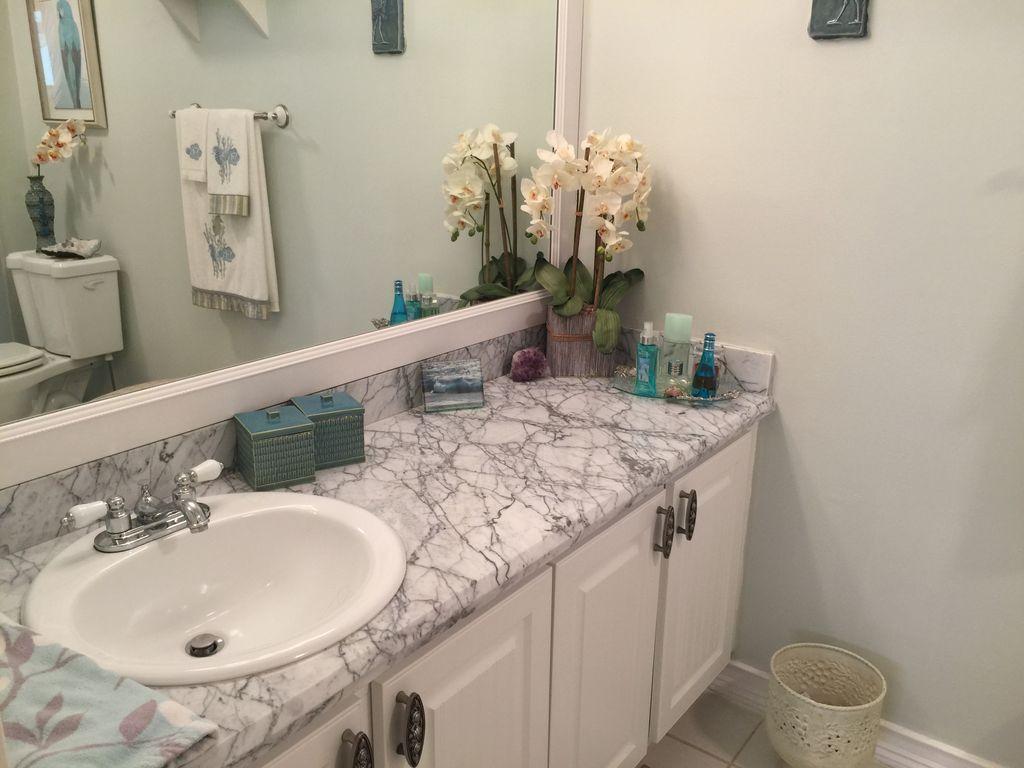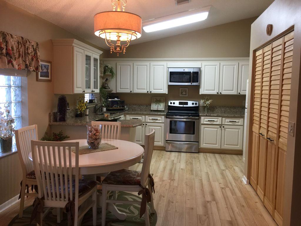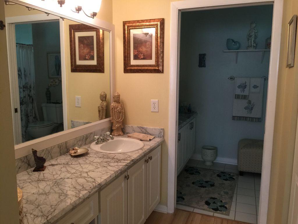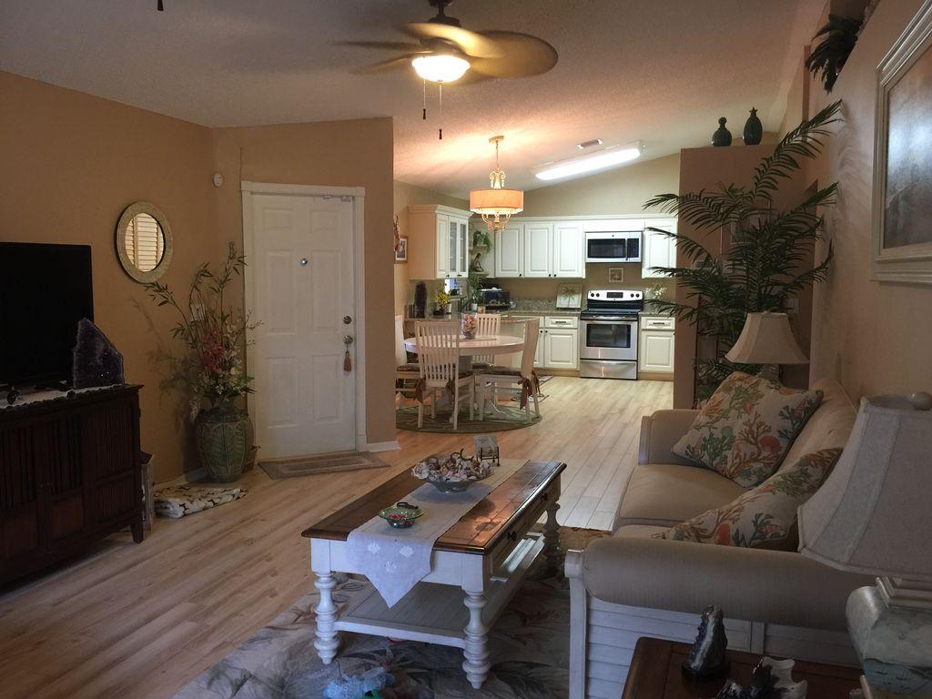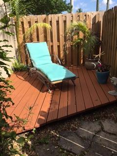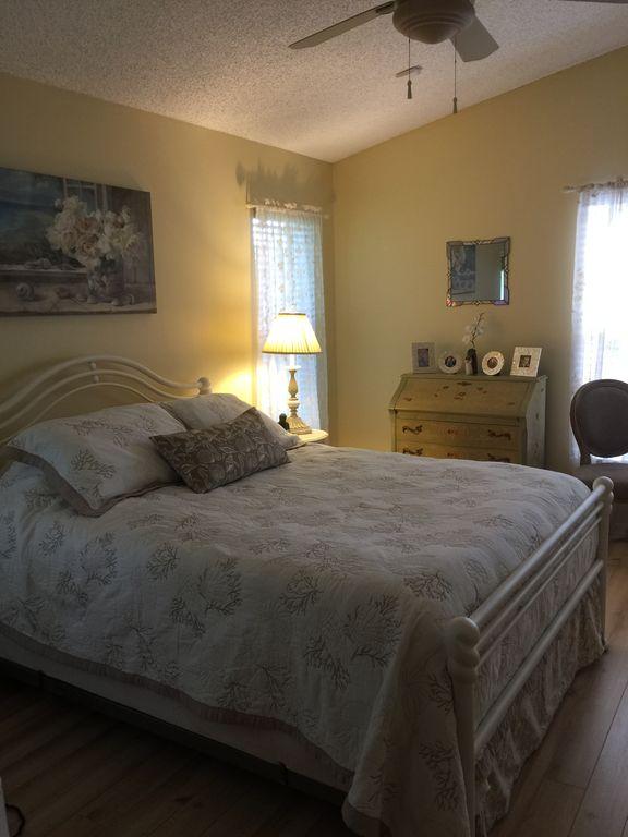 One story well maintained 2/2 . Attached only by private storage.Low assn fee covered new roof & exterior painting. Inside is clean, freshly painted, open feeling with cathedral ceilings. No-glare tinted windows. Glass block window treatment. New air condition. .Wood laminate flooring throughout. Nice sized screened patio and fenced private yard. Large private locked storage room, can be workroom. Assigned parking and lots of guest parking. All new remold, custom cabinets with granite counter tops, marble in master bath. Pets ok, Can rent first year.