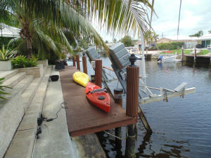 BRING YOUR CLIENTS TO THIS STUNNING 4BR OCEAN ACCESS HOME COMPLETE WITH A 10K LB BOAT LIFT AND ONE FIXED BRIDGE TO THE INTRACOASTAL. BOASTING 75 FT ON WATER, 39FT DOCK WITH ELECTRIC AND WATER, 2 CAR GARAGE, CIRCULAR STAMPED CONCRETE DRIVEWAY, NEW HURRICANE IMPACT WINDOWS IN FRONT AND HURRICANE SHUTTERS (PANELS AND ACCORDIANS) FOR OPENINGS. LARGE POOL AND HOT TUB WITH TRAVERTINE DECK AND STUNNING OUTDOOR LIVING AREA WITH PRIVACY OF TALL BAMBOO-LINED FENCE, COCONUTS AND LUSH TROPICAL LANDSCAPING. BOTH BATHROOMS COMPLETELY REDONE, NEW DARK HARDWOOD ENGINEERED FLOORS THROUGHOUT, ROOF APPROX 11 YRS, A/C 8 YRS. ABSOLUTE MOVE IN CONDITION. PROFESSIONALLY DECORATED AND SHOWS LIKE A MODEL.