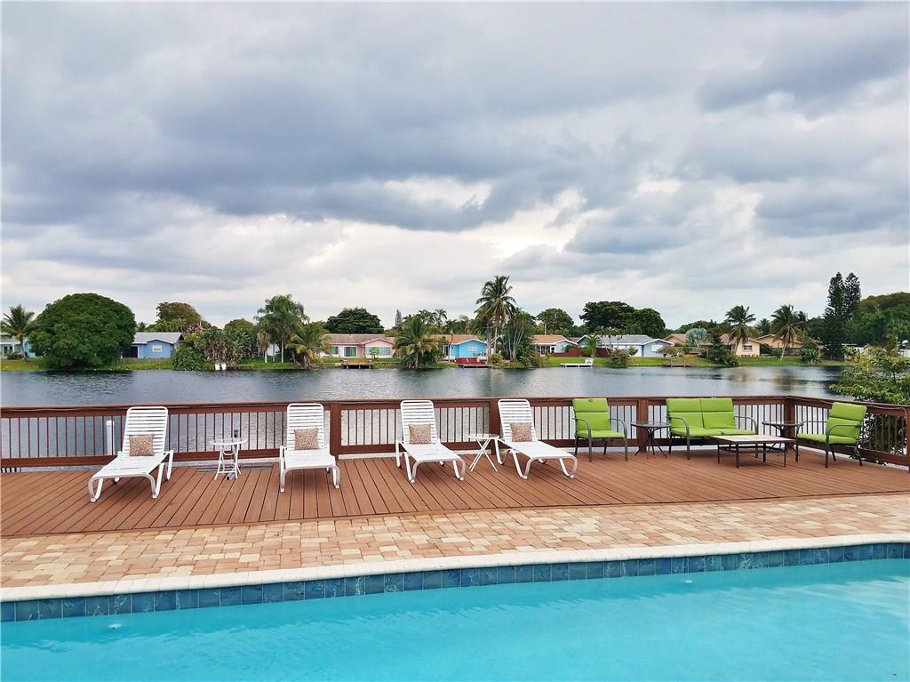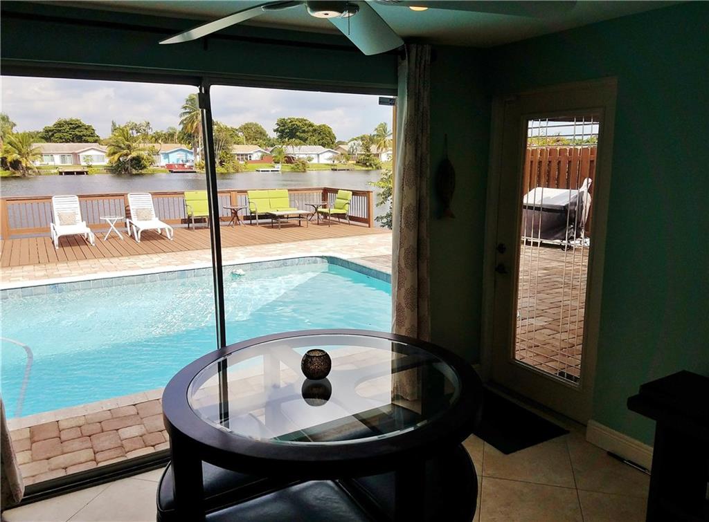 Beautiful updated LAKEFRONT home, with lovely neutral tile throughout. Very open concept with great kitchen. Updated bathrooms, Master shower with windows overlooking Lake. Private courtyard off the master bedroom. 3rd bedroom has been opened to a tv/music room off the kitchen. Oversized heated pool with waterfall. Massive deck, Pergola and entertaining areas. Huge Dock for your Kayak. Hurricane windows. Plantation shutters. 1 car garage. Paver, double driveway. AMAZING HOME