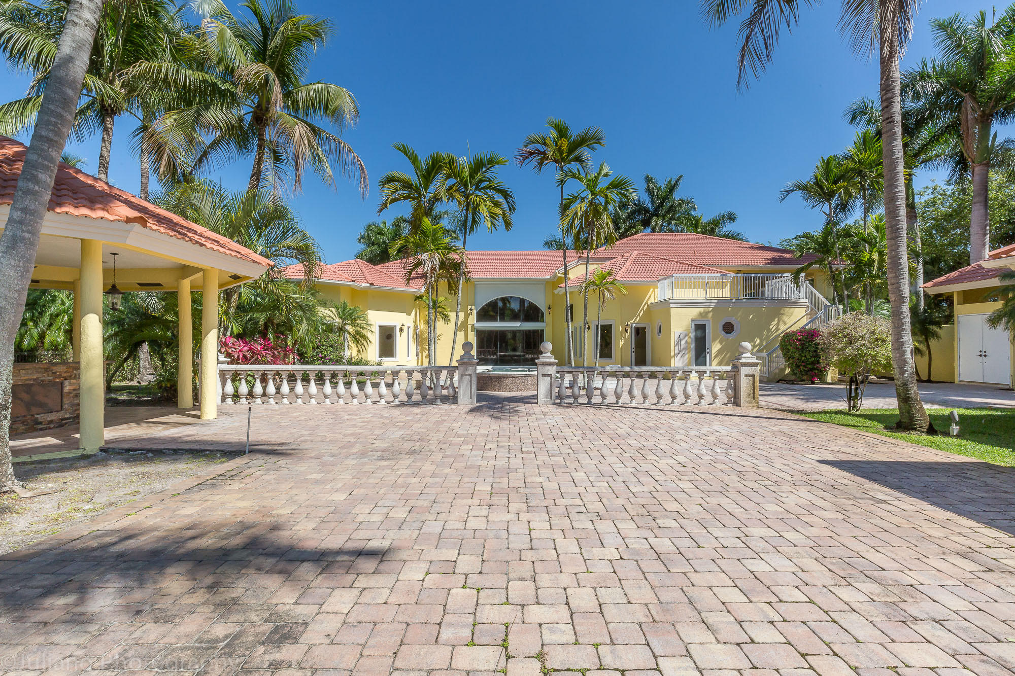 Anyone entering the main house is immediately captivated by the 2 enormous crystal chandeliers hanging from the 21 foot high ceilings, as well as the large impact windows offering a full view of the pool and backyard. The 36 x 36 marble floors flow throughout almost every room in the house with the exception of a few which have rich hardwood instead. Directly off to the left is the fully upgraded kitchen. The open kitchen is outfitted with granite counter tops, custom wood cabinetry, a center island, and all stainless-steel Miele appliances. Appliances included with purchase are the enormous fridge and freezer hidden behind elegant wood paneling, dual ovens, stove top, and 2 wine coolers. Opposite the kitchen is the entrance to the home office...