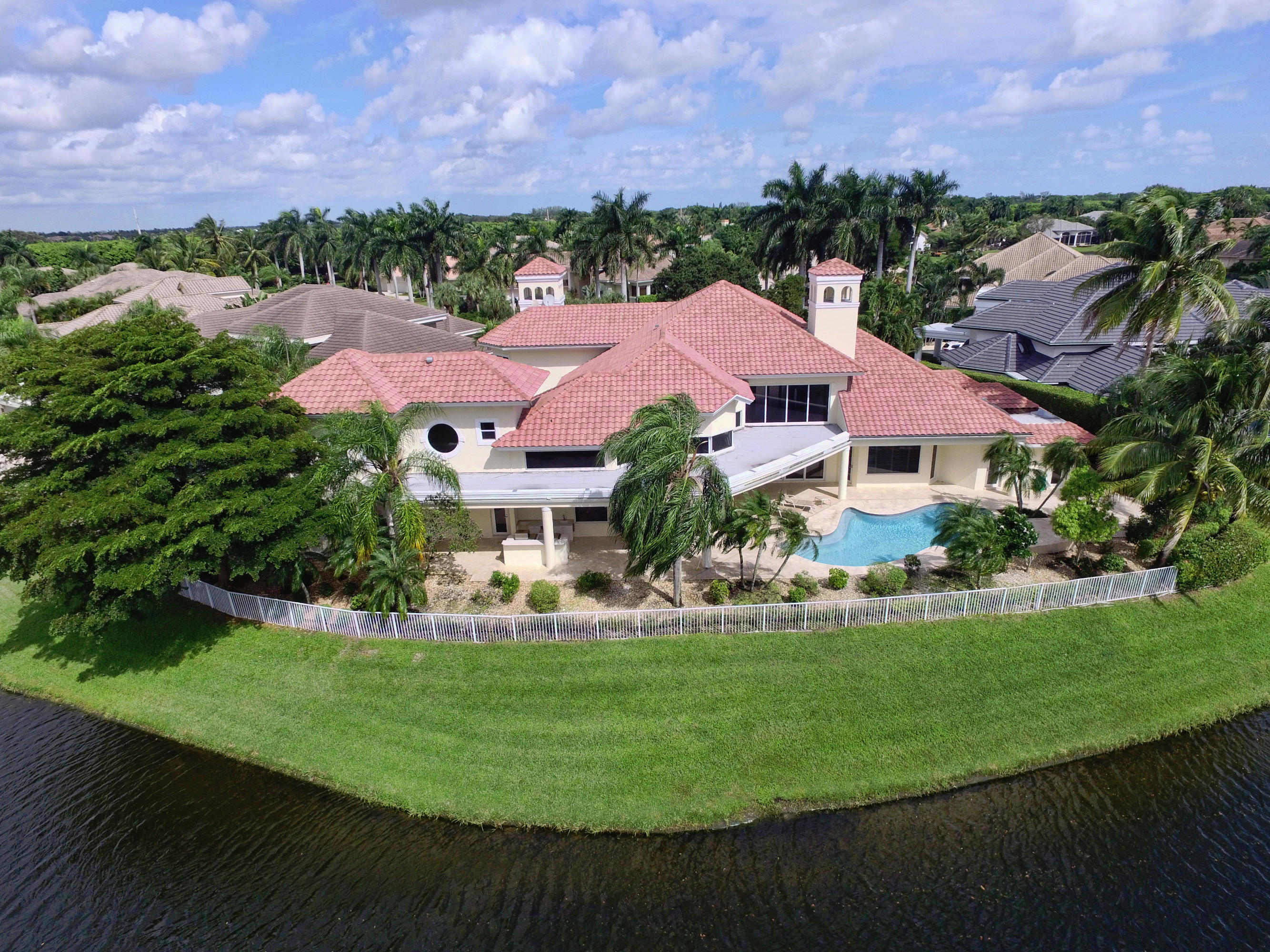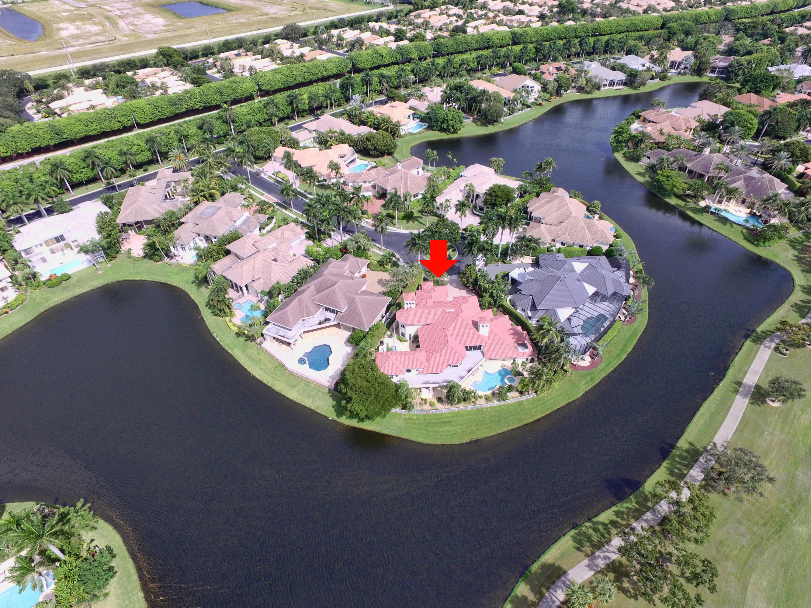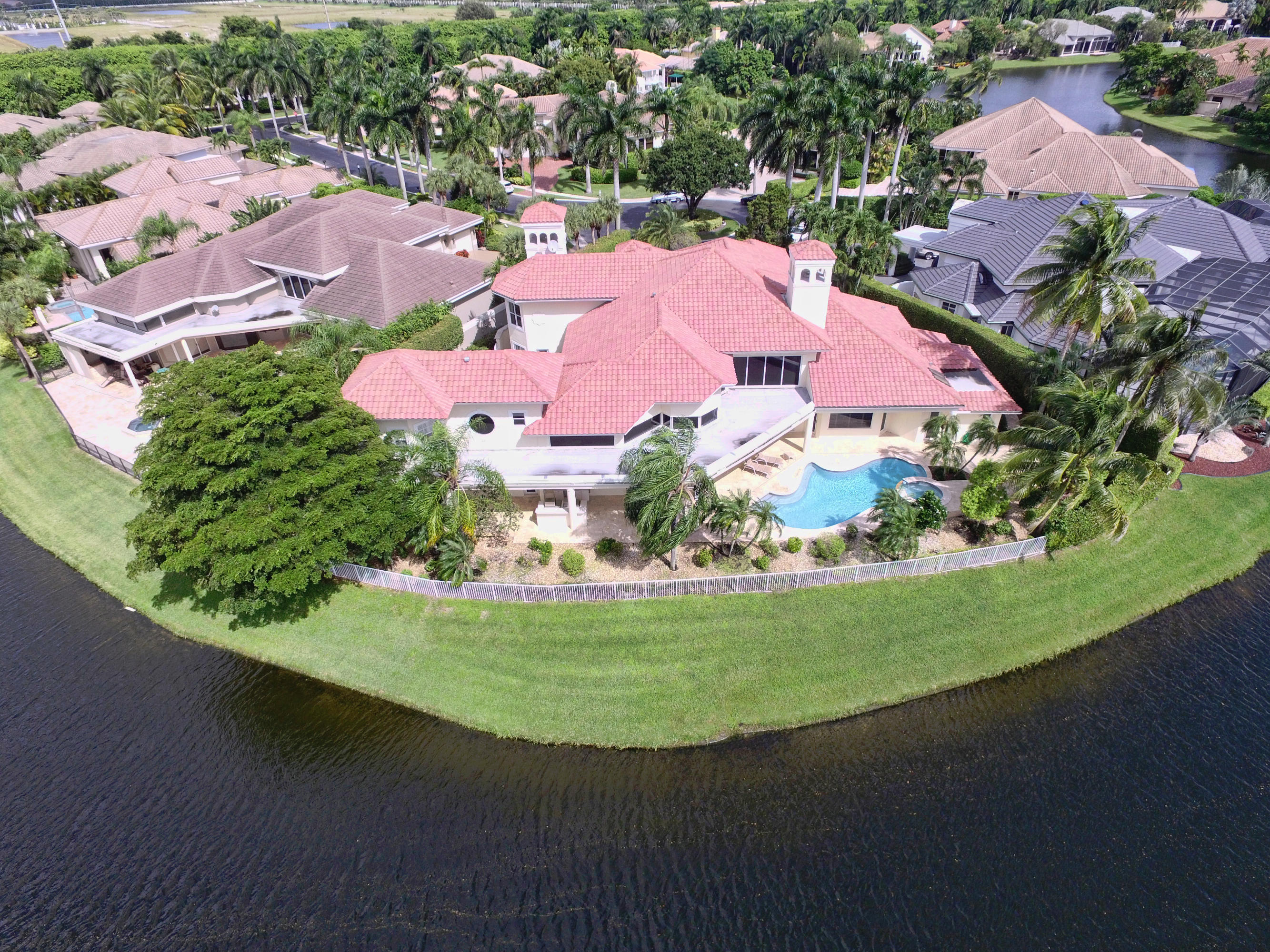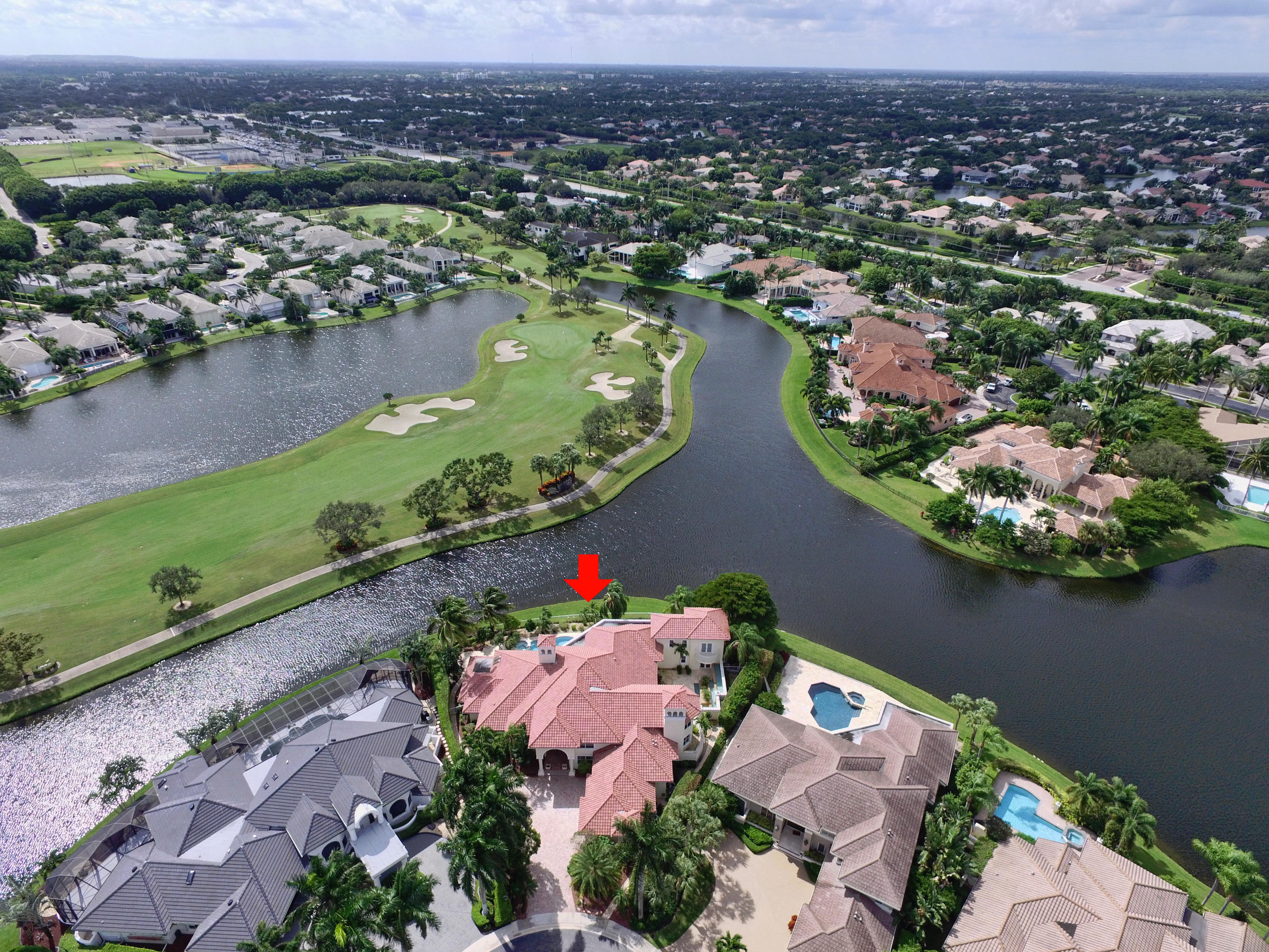 WHAT A SPECTACULAR 5 BEDROOM, 7.5 BATH ESTATE HOME LOCATED ON A POINT LOT IN THE AWARD WINNING COUNTRY CLUB AT BROKEN SOUND. THIS MAGNIFICENT HOME SITS ON 200 FT. OF WATER WITH AN AMAZING GOLF COURSE VIEW. SOME OF ITS FEATURES INCLUDE A LARGE PRIVATE 2 STORY/2 BATH GUEST HOUSE, NEWER ROOF, IMPACT GLASS, LOTS OF WINDOWS WITH LOTS OF LIGHT, NEW SOUND SYSTEM, UPDATED SECURITY SYSTEM, HIS & HER MASTER BATHS, HIS & HERS LARGE WALK IN CLOSETS, AND A PRIVATE OFFICE TO FINISH OFF THE MASTER WING. VOLUME CEILINGS & WIDE OPEN FLOOR PLAN EMPHASIZE THE SPACIOUSNESS OF THIS DRAMATIC HOME. THE UPSTAIRS MEDIA ROOM, BAR, & GAME ROOM ALONG WITH THE NEW MARBLE DECKING, NEWLY SURFACED LARGE POOL, SUMMER KITCHEN, LUSH LANDSCAPING AND PRIVATE COURTYARD WITH CASCADING FOUNTAIN AND STONE WALL WILL MAKE