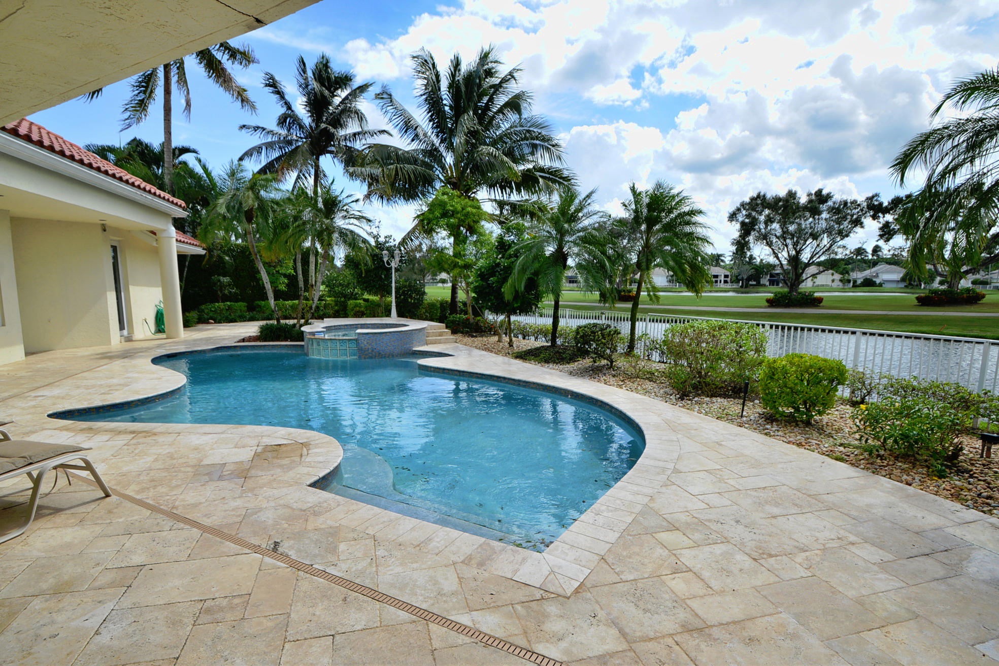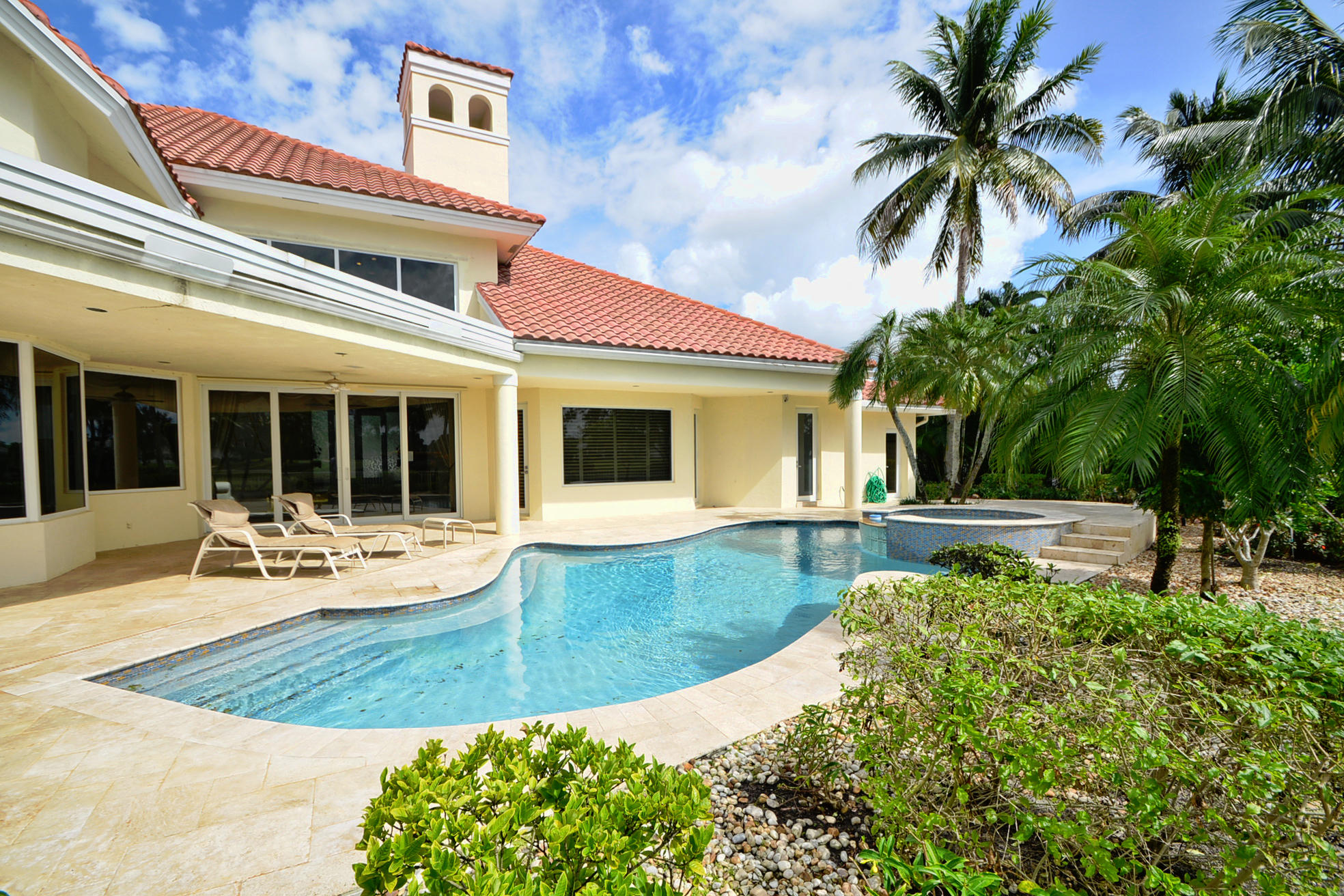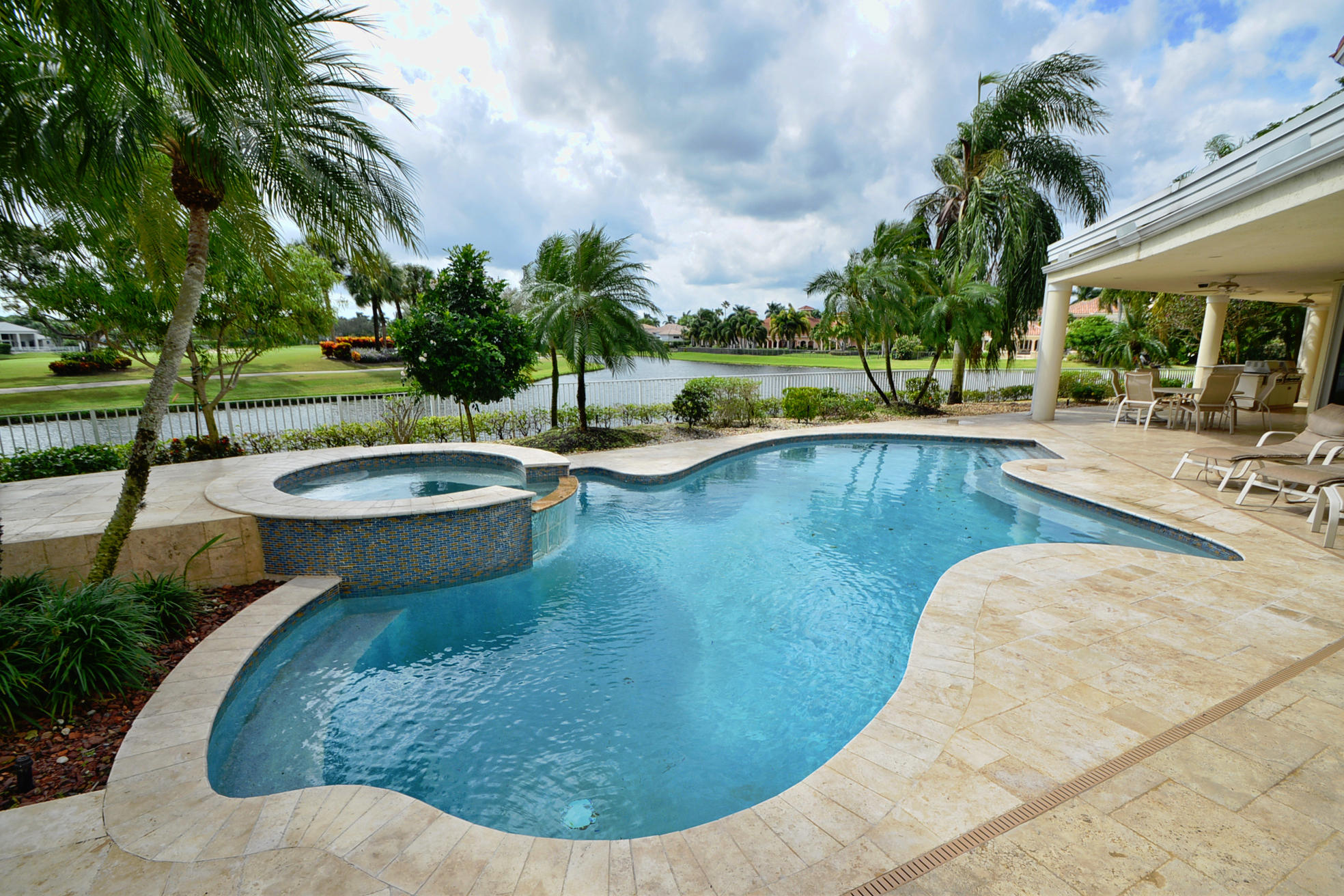 WHAT A SPECTACULAR 5 BEDROOM, 7.5 BATH ESTATE HOME LOCATED ON A POINT LOT IN THE AWARD WINNING COUNTRY CLUB AT BROKEN SOUND. THIS MAGNIFICENT HOME SITS ON 200 FT. OF WATER WITH AN AMAZING GOLF COURSE VIEW. SOME OF ITS FEATURES INCLUDE A LARGE PRIVATE 2 STORY/2 BATH GUEST HOUSE, NEWER ROOF, IMPACT GLASS, LOTS OF WINDOWS WITH LOTS OF LIGHT, NEW SOUND SYSTEM, UPDATED SECURITY SYSTEM, HIS & HER MASTER BATHS, HIS & HERS LARGE WALK IN CLOSETS, AND A PRIVATE OFFICE TO FINISH OFF THE MASTER WING. VOLUME CEILINGS & WIDE OPEN FLOOR PLAN EMPHASIZE THE SPACIOUSNESS OF THIS DRAMATIC HOME. THE UPSTAIRS MEDIA ROOM, BAR, & GAME ROOM ALONG WITH THE NEW MARBLE DECKING, NEWLY SURFACED LARGE POOL, SUMMER KITCHEN, LUSH LANDSCAPING AND PRIVATE COURTYARD WITH CASCADING FOUNTAIN AND STONE WALL WILL MAKE