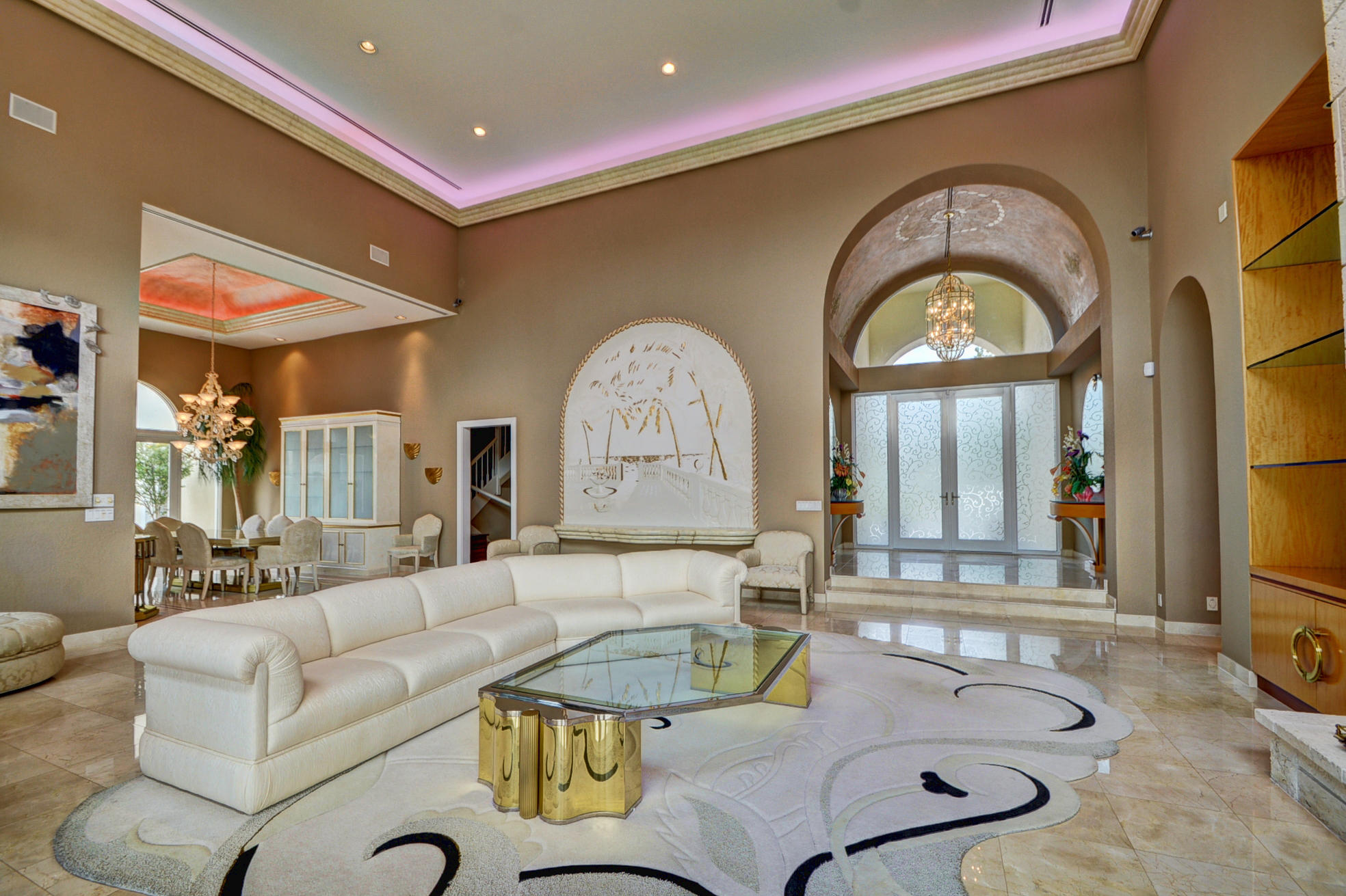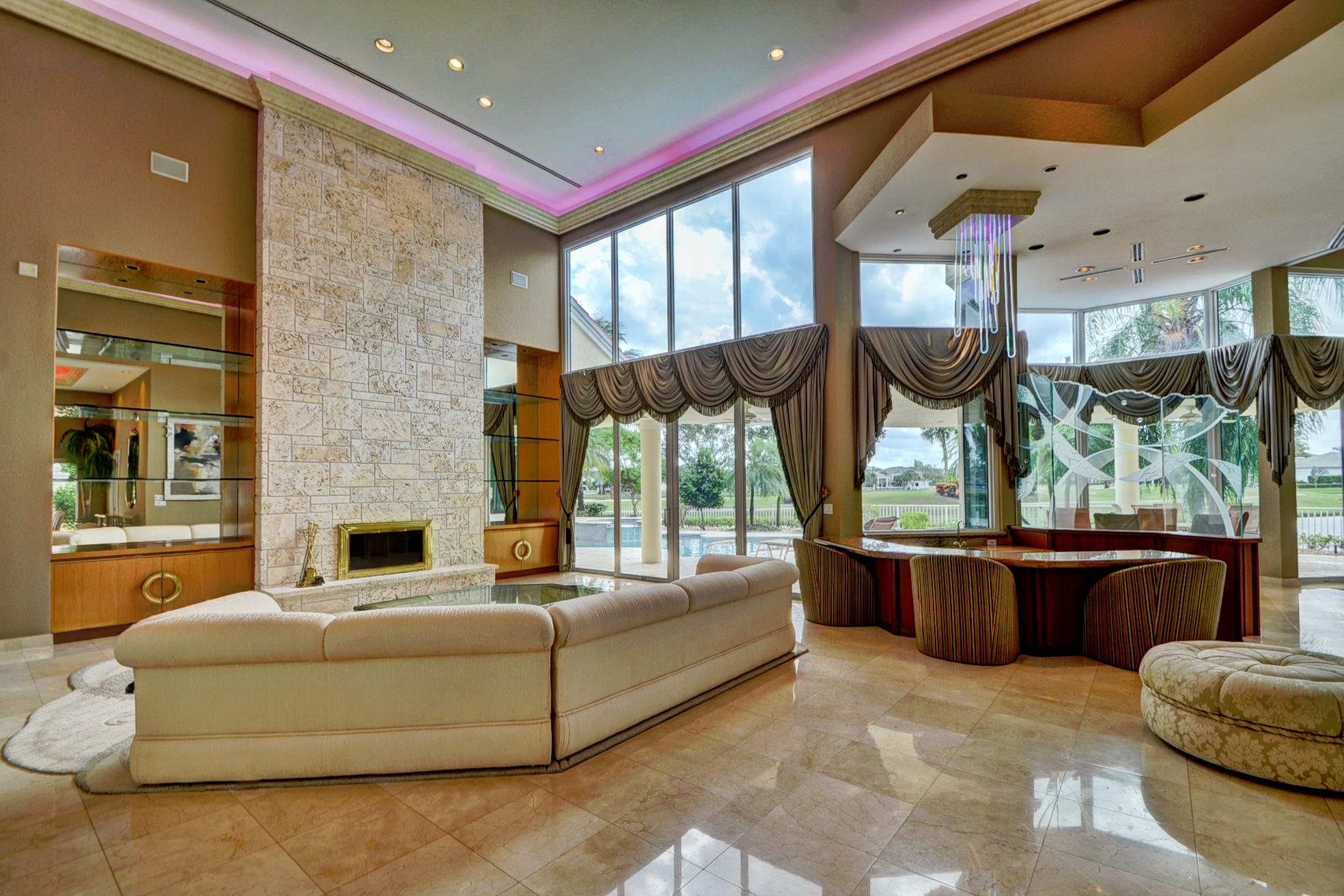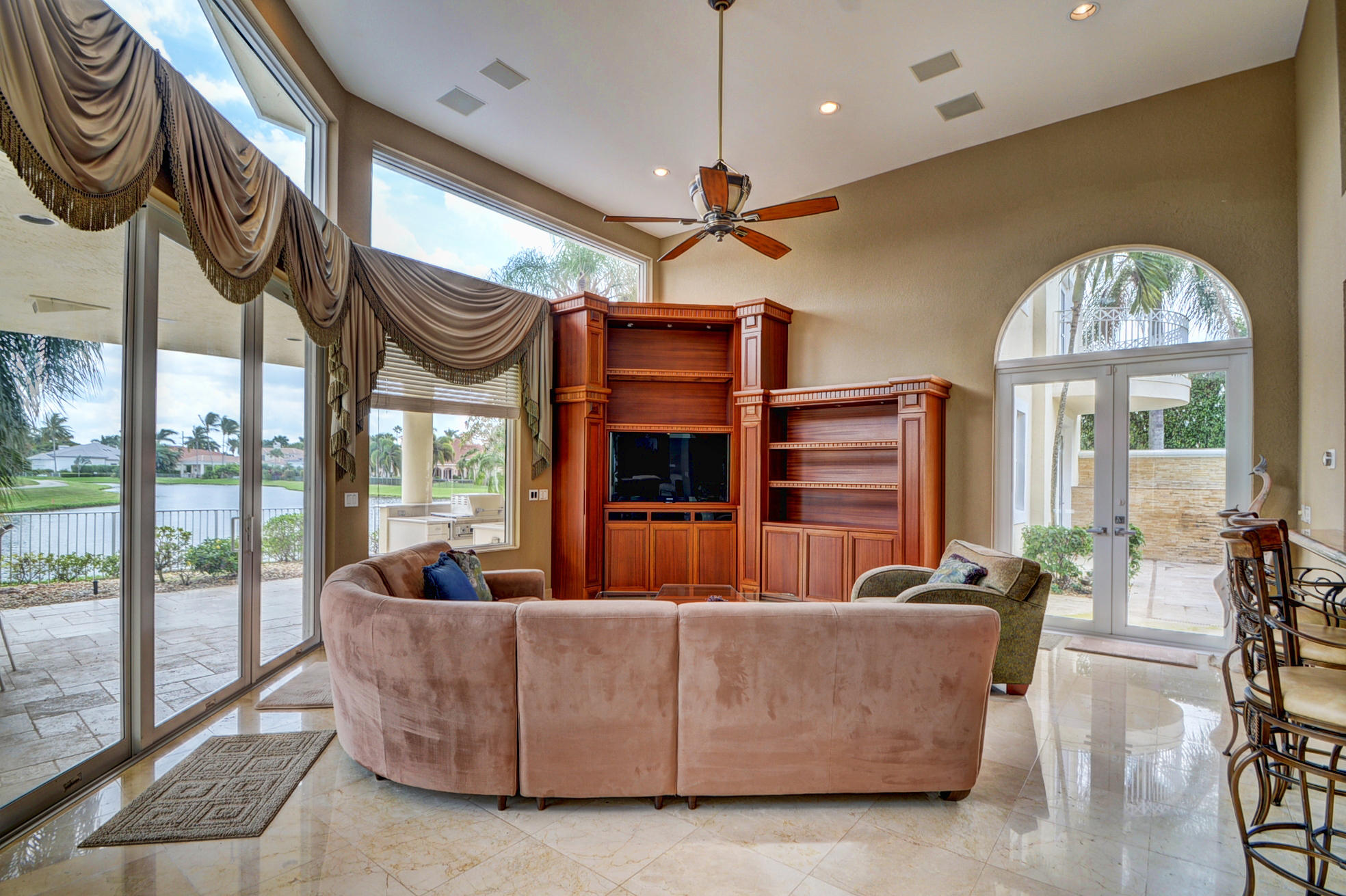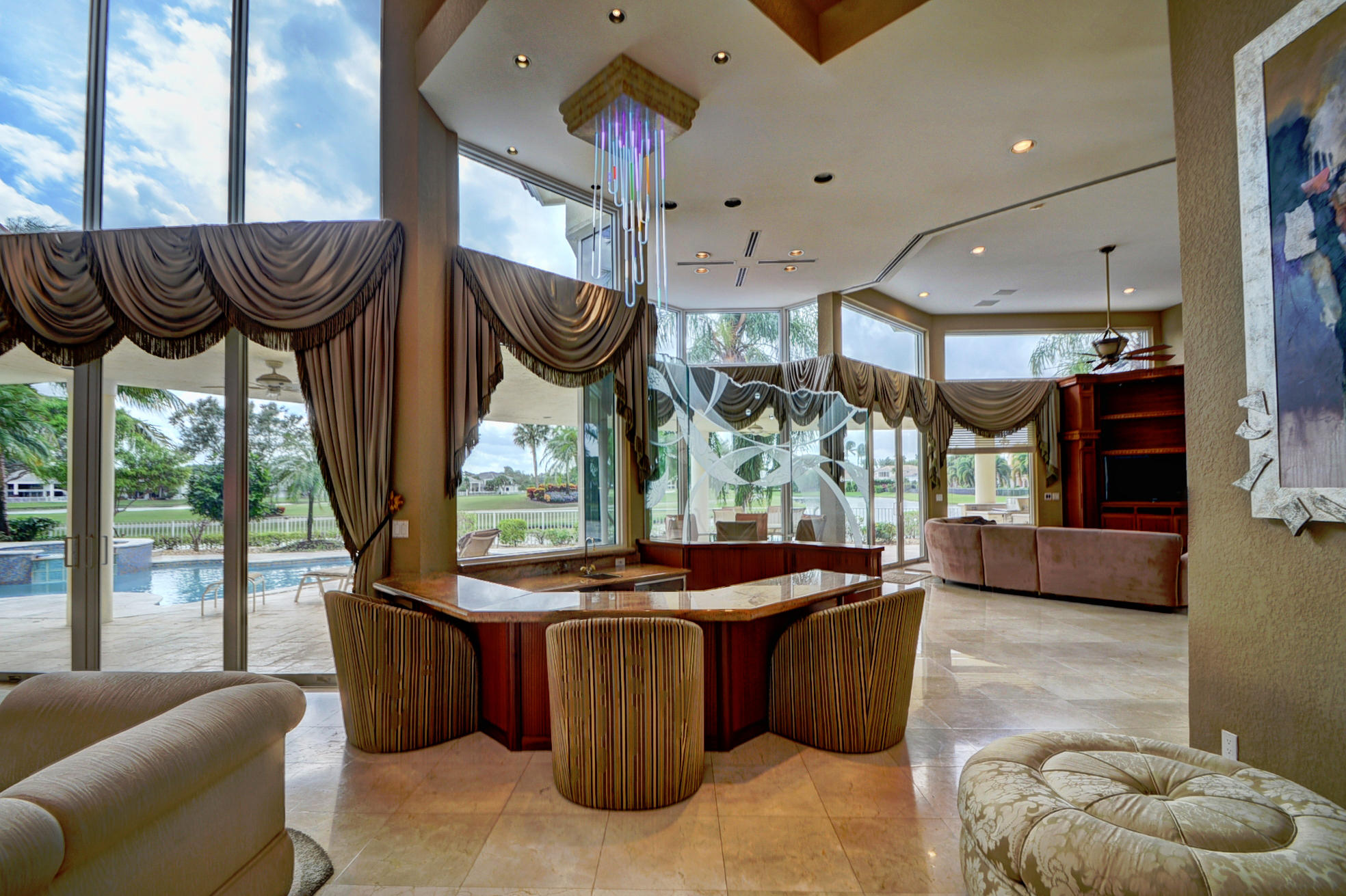 WHAT A SPECTACULAR 5 BEDROOM, 7.5 BATH ESTATE HOME LOCATED ON A POINT LOT IN THE AWARD WINNING COUNTRY CLUB AT BROKEN SOUND. THIS MAGNIFICENT HOME SITS ON 200 FT. OF WATER WITH AN AMAZING GOLF COURSE VIEW. SOME OF ITS FEATURES INCLUDE A LARGE PRIVATE 2 STORY/2 BATH GUEST HOUSE, NEWER ROOF, IMPACT GLASS, LOTS OF WINDOWS WITH LOTS OF LIGHT, NEW SOUND SYSTEM, UPDATED SECURITY SYSTEM, HIS & HER MASTER BATHS, HIS & HERS LARGE WALK IN CLOSETS, AND A PRIVATE OFFICE TO FINISH OFF THE MASTER WING. VOLUME CEILINGS & WIDE OPEN FLOOR PLAN EMPHASIZE THE SPACIOUSNESS OF THIS DRAMATIC HOME. THE UPSTAIRS MEDIA ROOM, BAR, & GAME ROOM ALONG WITH THE NEW MARBLE DECKING, NEWLY SURFACED LARGE POOL, SUMMER KITCHEN, LUSH LANDSCAPING AND PRIVATE COURTYARD WITH CASCADING FOUNTAIN AND STONE WALL WILL MAKE