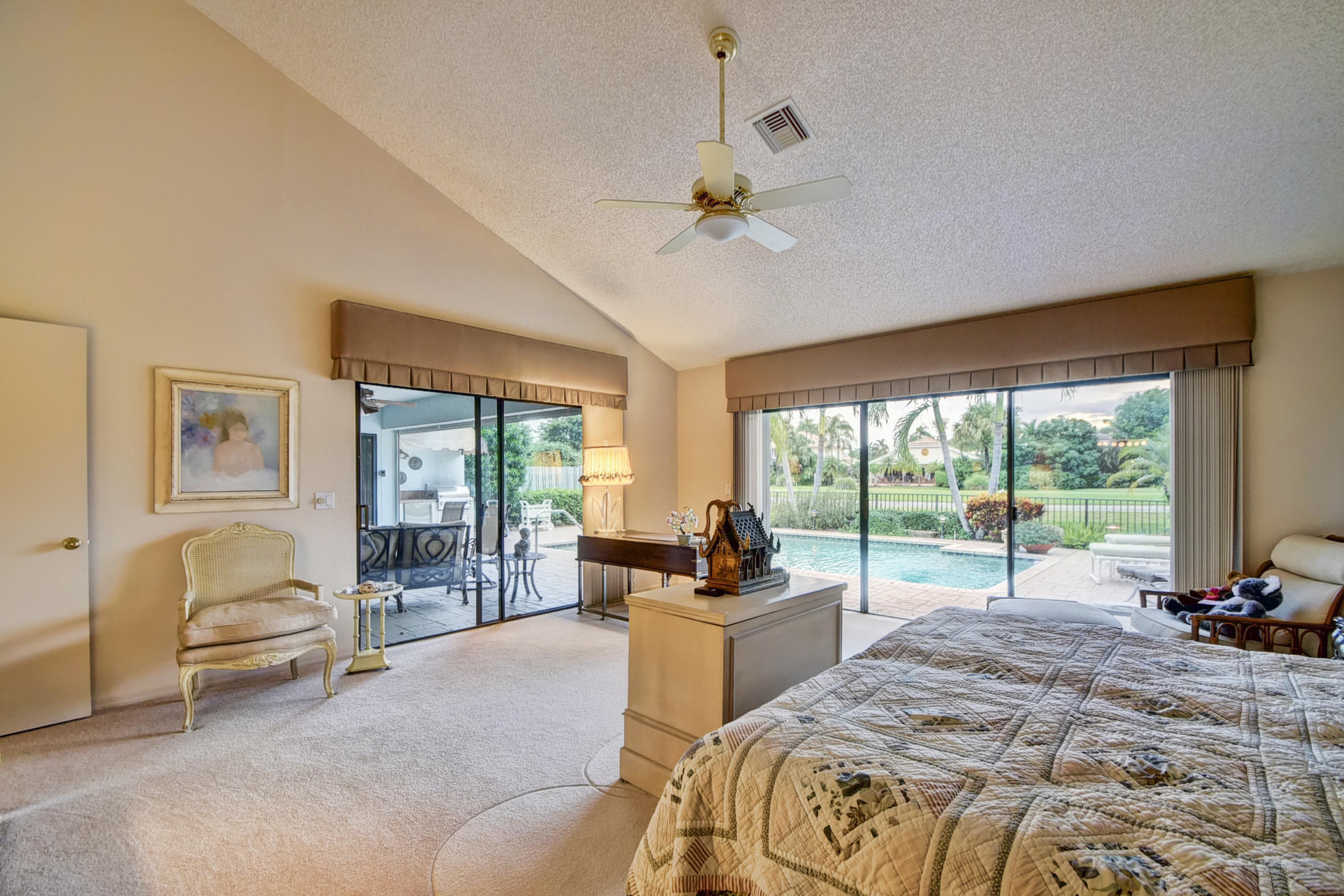 Chapel Creek free standing patio home with western exposure over looking water and the golf course. B Model 3 bedroom, 5 bath double master floor plan. Tiled living areas. Kitchen atrium removed for an expanded and updated kitchen with separate cooking island. Master bathroom area converted into private his and hers separate bathrooms. Custom bar with sink and ice maker. Open pool & patio area with separate covered porch and barbecue area. Hurricane and storm shutters. Furnishings negotiable.