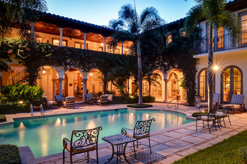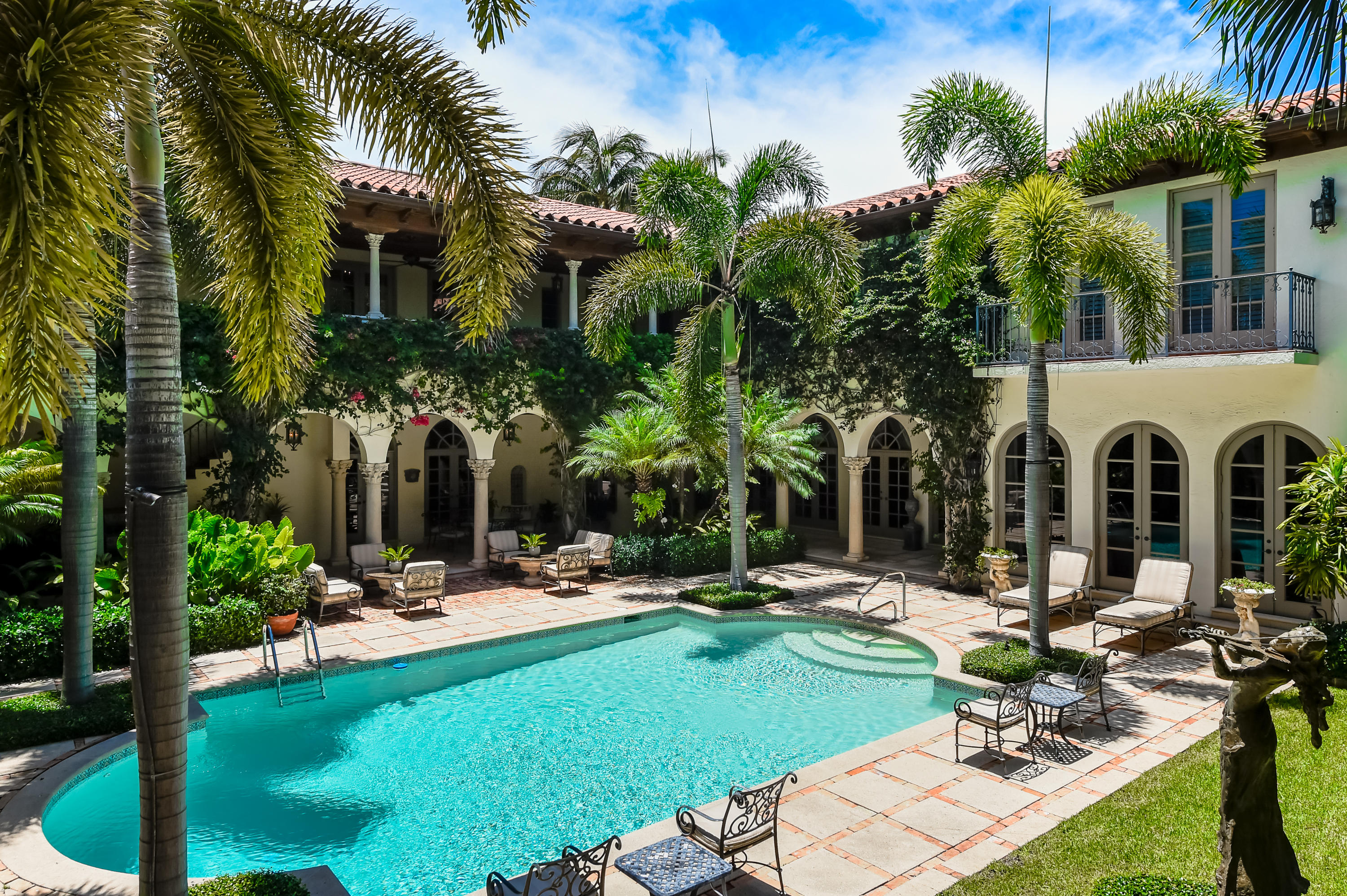 The epitome of Palm Beach's grace and beauty, this Venetian-Inspired villa is situated on Prestigious El Vedado Road, one of the three streets of the Estate Section called the Elegant Els sought after for their historic character, seclusion, and prime in-town location near world famous Worth Avenue. Designed around a magnificent courtyard the well-proportioned floor plan of 12,600+/- sq ft provide eight bedrooms and eight and a half-baths which include the staff quarters and a separate guest house/cabana. French doors across both sides of the L-shaped layout open up the interiors to loggias that surround the courtyard, making outdoor entertaining a way of life in this idyllic oasis of tranquility. Other features, include an elevator and three-bay garage.