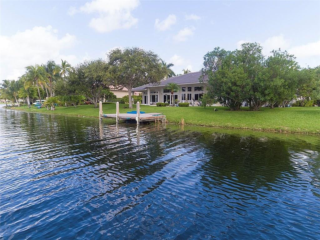 Spectacular lakefront home with dock, a rare find! Unobstructed sweeping views of 125 acre navigable lake. Aprx half acre lot with 100ft on water. 6 BRs + maids room, office & computer room. Updated, upgraded from 24 inch marble to impact doors & windows + newer roof! State of the art custom kitchen incl. 6 burner gas cooktop, huge great room with entertainment bar, dining room & large breakfast rm. Enormous patio, 20x40 pool & outdoor kit. Circular drive with porte-cochere. Exclusive & 24 hr guard gated