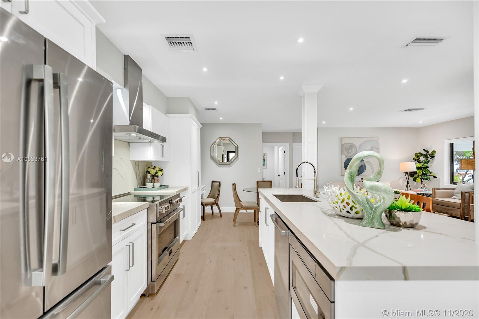 Stunning 4 bedroom, 2 bathroom home with detached 1 bedroom/1 bathroom guest suite and garage on quiet Coral Gables street with "no thru" traffic! This open concept home is perfect for entertaining! Extensive renovations include gorgeous kitchen with quartz countertops and new stainless steel appliances, carrara marble tile in main home bathrooms, all new impact windows and doors, AC, and electrical...and last but not least, an amazing driveway that gives this home the wow factor! 7500 sq ft lot with room for a pool. Come see for yourself all the details that this home has to offer!
