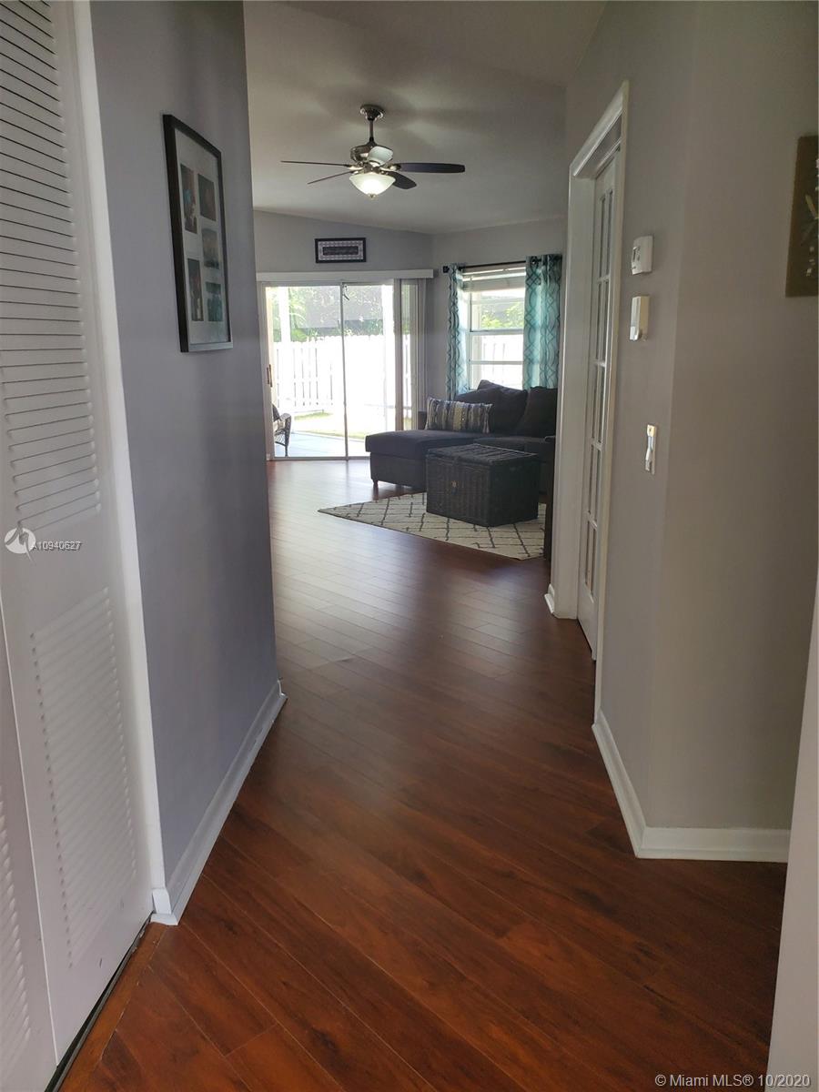 Beautiful, bright 3 bedrooms single family home sitting in a cul-de-sac. 1 car garage. Wood floors throughout the home, updated kitchen with granite countertop and stainless steal appliances. Bathrooms with updated cabinets. Very spacious backyard with screened patio and fenced. Accordion shutters. Community pool. Impeccable condition!