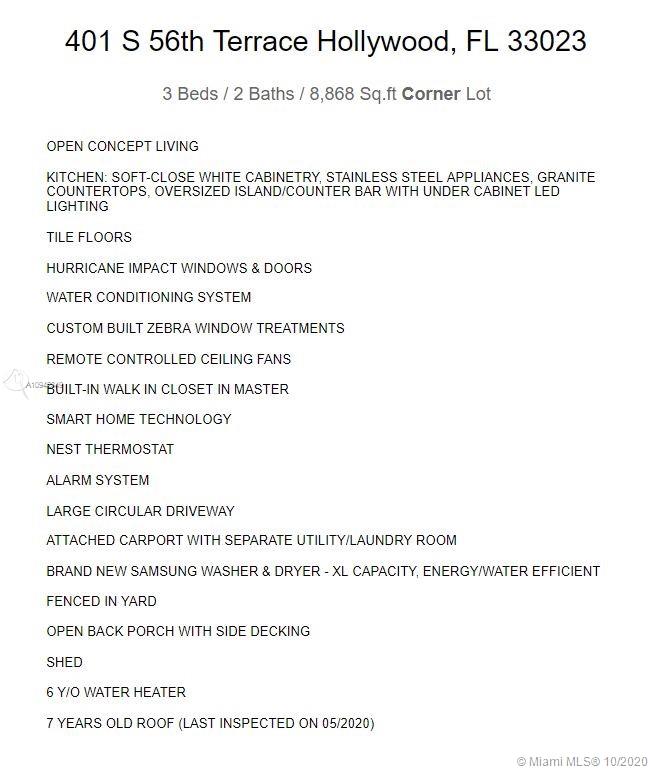 HIGHLY UPGRADED 3 BED/2BATH SMART HOME ON AN OVERSIZED CORNER LOT BOASTING A LARGE CIRCULAR DRIVEWAY, ATTACHED CARPORT AND GREAT CURB APPEAL. THE OPEN FLOOR PLAN IS HIGHLIGHTED BY WOOD-LIKE TILE FLOORS, A LARGE OPEN KITCHEN WITH SOFT-CLOSE WHITE CABINETRY, STAINLESS STEEL APPLIANCES, GRANITE COUNTERTOPS AND OVERSIZED ISLAND/COUNTER BAR. ADDITIONAL UPGRADES INCLUDE HURRICANE IMPACT WINDOWS & DOORS, CUSTOM BUILT WINDOW TREATMENTS, WATER CONDITIONING SYSTEM AND NEST THERMOSTAT. FENCED IN FOR ADDED PRIVACY , OPEN BACK PORCH WITH SIDE DECKING, SHED, BRAND NEW X-LARGE AND ENERGY/WATER EFFICIENT W/D. CONVENIENTLY LOCATED BY MEMORIAL REGIONAL HOSPITAL BETWEEN I-95 AND TURNPIKE. MINS FROM THE BEACH AND YOUNG CIRCLE WHICH IS HOME TO FOOD TRUCKS, ARTSPARK, AMPHITHEATER, LOTS OF SHOPS AND FINE DINING.
