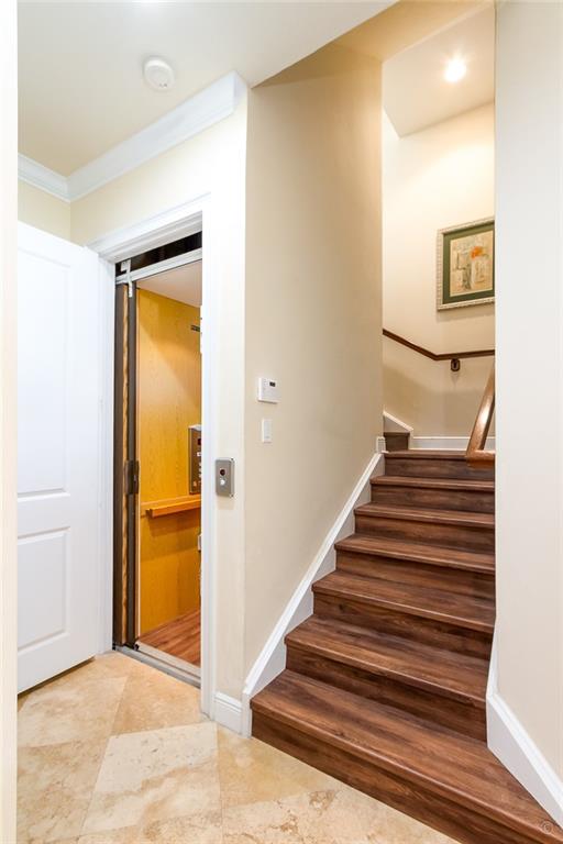 WATCH THE TOUR. Spectacular Builder’s Model. Tri-level, fee simple townhouse in the heart of East Boca. A boutique, Coral Gables style gated community 3 miles from the beach & under 5 miles to Mizner Park. Best location in the community, a corner unit across from the resort-style pool and away from busy roads. This one features a private elevator, impact windows & doors, 3-yr-old Carrier Performance 5 Ton AC, travertine flooring in the main living areas, luxury vinyl planking on the stairway & 3rd flr hallway. This one has all the upgrades you’d expect from a builder’s showcase model. Gourmet kitchen, beautiful bathrooms, crown molding, his & her walk-in closets w/built-ins, central vac, cove lighting in the master, Jacuzzi tub, the HOA is even putting on new roofs at no cost to the buyer!