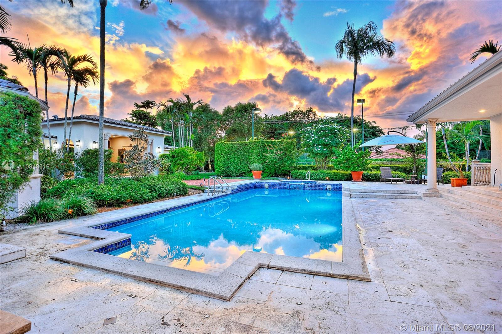 Situated on a prestigious street in Pinecrest, find this custom-built home that sits on a 61,000 sf lot & boasts 8,500+ sf. The impressive home is set back nicely from the street w/ electric gates & circular drive. Enter from its grand porte-cochere to the foyer brilliantly overlooking the formal liv & din areas. Built in 1991 it boasts generous entertaining spaces inside & out, high ceilings, built ins, all impact glass, lit tennis ct, 5 BR+ office inside & 2 outside BRs as part of pool house w/ summer kit, oversized fam rm w/ wet bar, plantation shutters & too much more to mention. Outdoor covered spaces serve as add’l liv areas. Gracious principal suite w/ sitting area, updated bath w/ double vanity, freestanding tub, large shower, dressing rm & 2 walk in closets. 3 car gar, laundry rm.