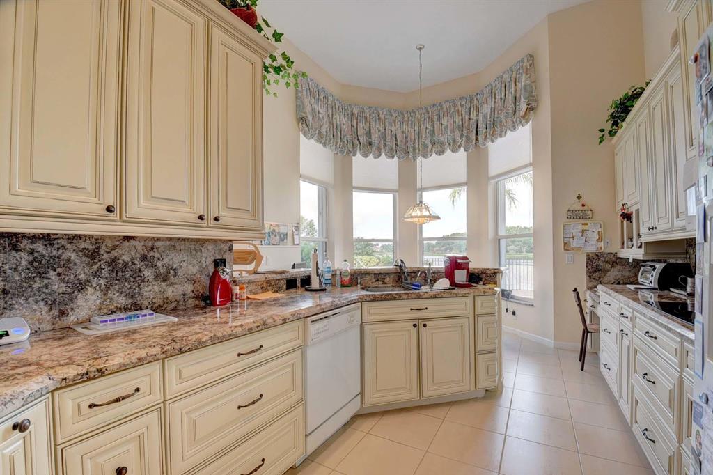 Location! Location! Location! One-story pool home with wide lake vistas! Nestled on a beautiful lake lot, this lovely one-story home of 3 bedrooms & 3 baths is spacious & open featuring volume ceilings with speakers; neutral tile floors throughout; a remodeled kitchen with 42'' ivory cabinetry with roll-outs & self-closing drawers, granite countertops & backsplash & a charming breakfast nook with a bay window. The bathrooms offer higher vanities & granite countertops. Air conditioning system - 2019. The inviting patio offers a covered lanai and an open area with a pool overlooking the lake! The front double doors were replaced & the home offers accordion shutters & impact windows. This one will not last!