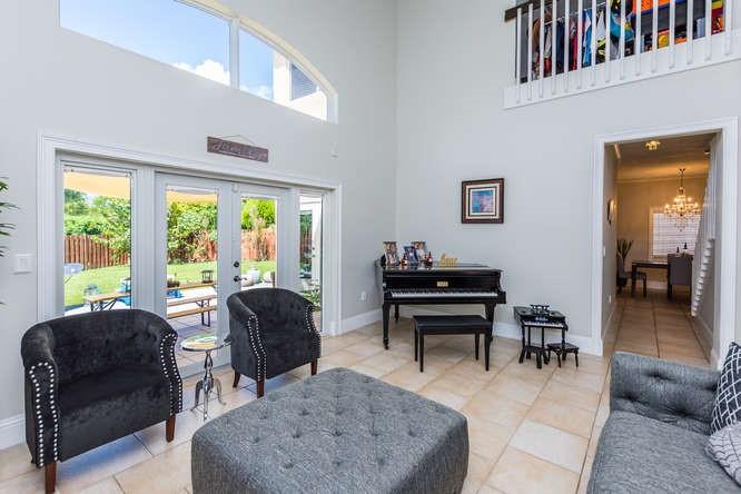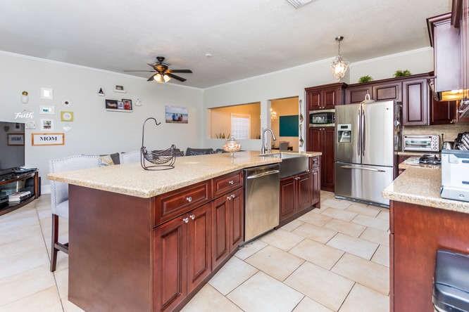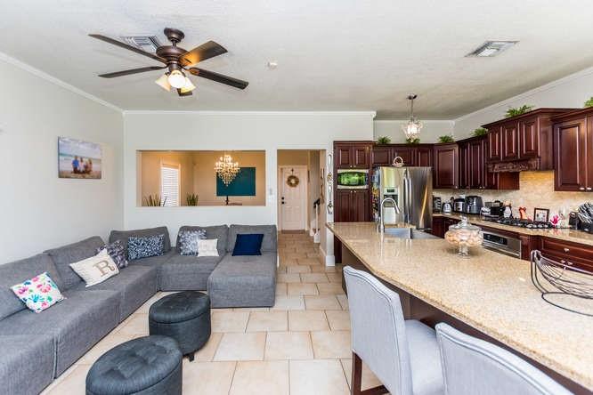 Shows like a model, 4/3 with over 2400 sq ft. Best location on cul-de-sac street, over sized fenced lot with extended cement patio. New kitchen, stainless steel appliances, impact windows and doors, redone master bath, knockdown ceilings, crown molding and custom baseboards. Natural gas dryer, range and water heater. One bedroom and bath downstairs. 24/7 security plus sprinkler and basic cable included in monthly maintenance. Close to schools and I75 in nicely maintained community.