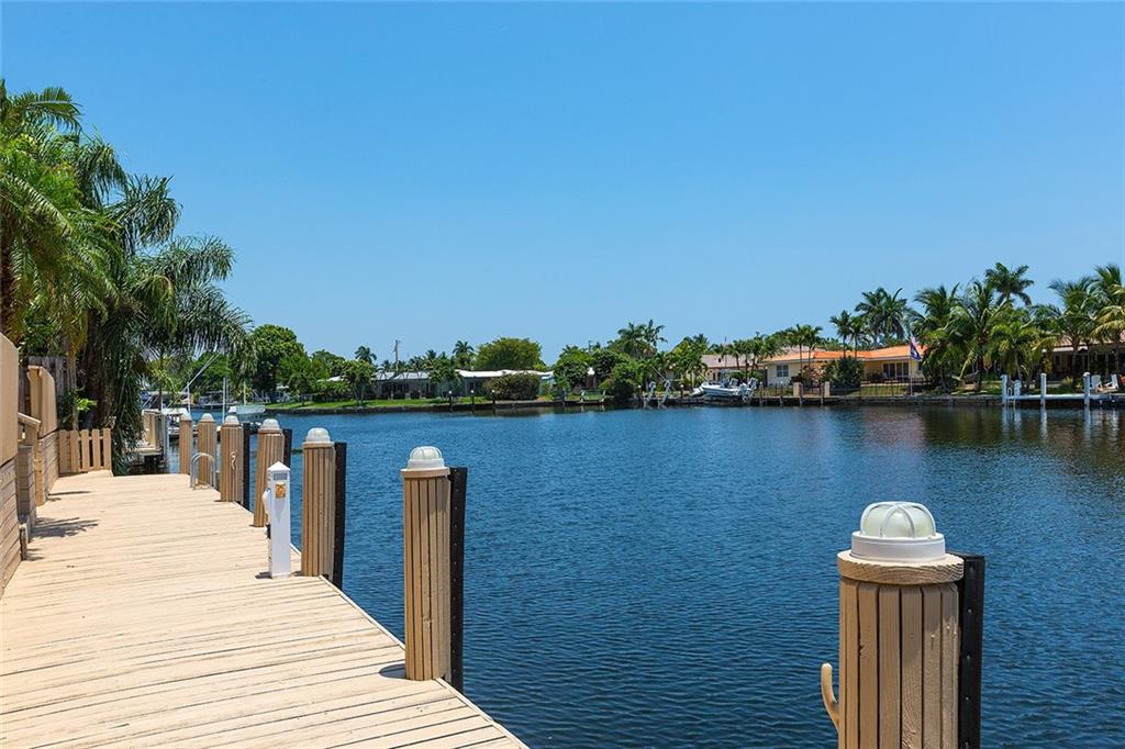 This spacious wide view waterfront home with one 11.5ft fixed bridge. Open floor plan, family and living spaces, center Chef's kitchen and formal dining area. Walls of sliding doors open to large terrace 50'x19' deck and heated pool. Quiet neighborhood, beautiful views and a lot of privacy. The full-service dock below measures 62'x 8'. Split floor plan offers a private master suite and access to terrace while the two guest bedrooms share a hall bath one enjoying it's own covered patio with waterway views. Well-landscaped with a circular driveway. Only blocks to shopping & cafes. Fifteen minute walk to the beach, close to all amenities. No association fees.