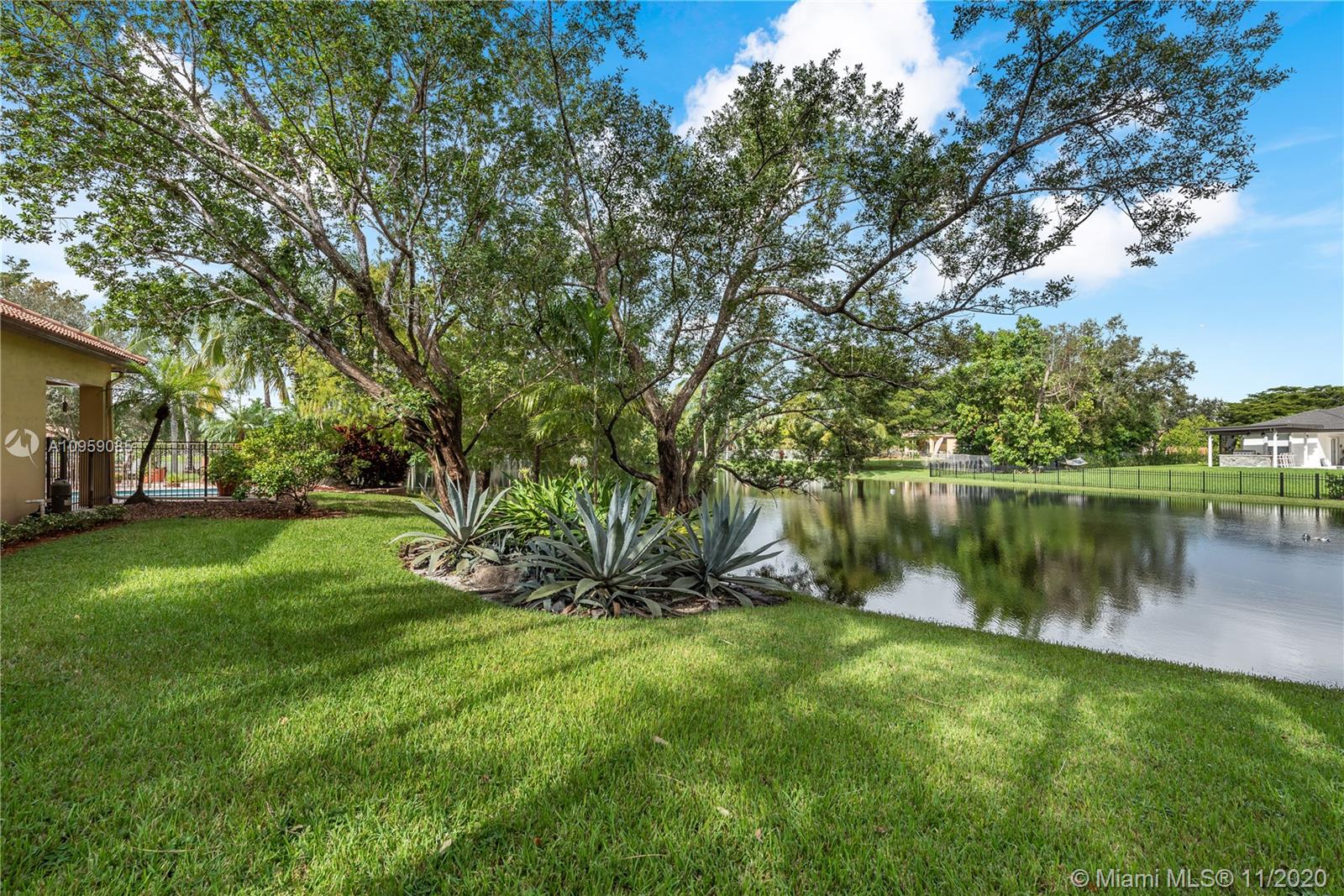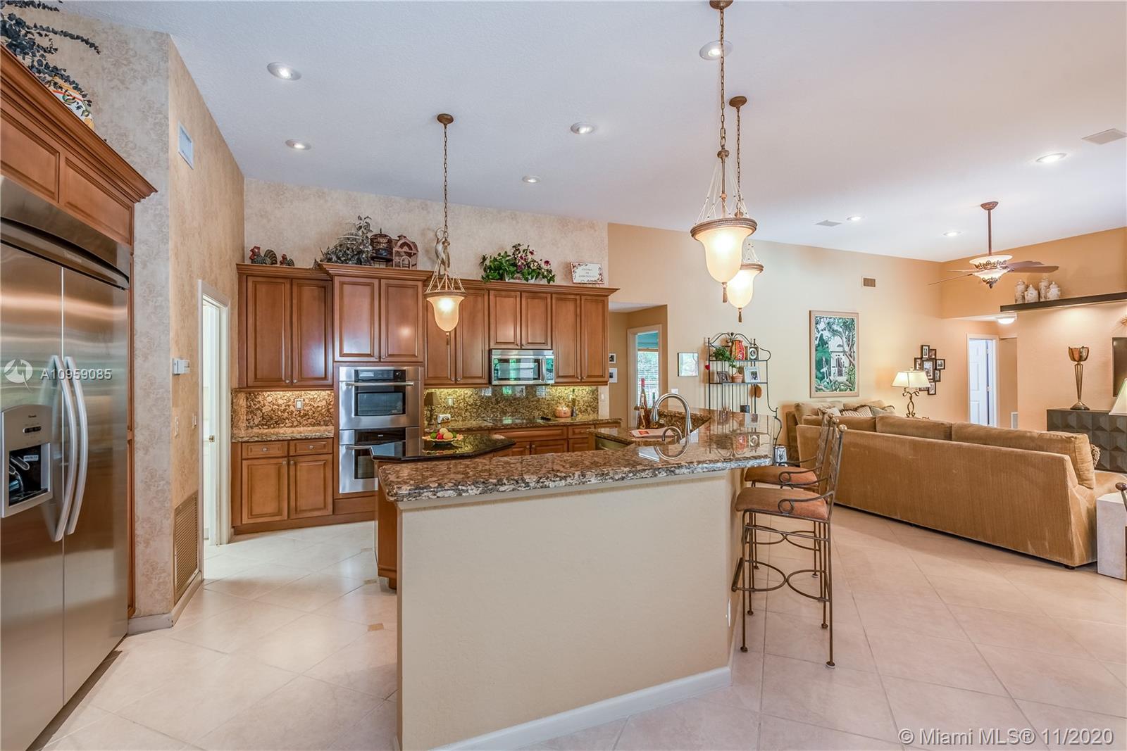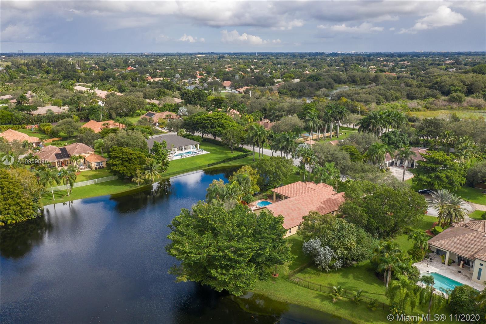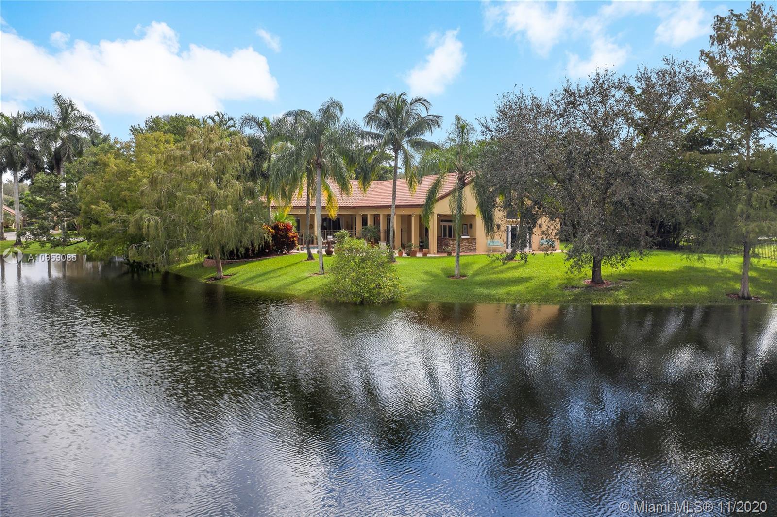 This is one of THE MOST BEAUTIFUL cul de sac lots in all of Davie! Surrounded by water & a park like setting, this outdoor oasis offers stunning peaceful views, large sparkling pool, outdoor kitchen & builder's acre private lot. Step inside to professionally decorated home with over $280,000 in upgrades & features. Huge beautiful kitchen with wood cabinetry, granite & built in fridge. 20x20 porcelain tiles, wet bar, textured ceilings, built-ins & more. Master retreat and upgraded master bath. 5th room is an office with custom cabinetry. HUGE addition complete with recreation & entertaining areas. Interior laundry room AND a mud room off garage. Home Gym. Carlton Ranches is a small boutique gated community with access to biking/walking trails, great schools & highways. This is a HOME RUN!