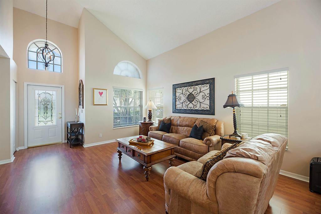 Spacious & light two story pool home on large corner, fenced lot in the guard gated community of Meadow Lakes. Resort style backyard makes you feel like you're on vacation w/plenty of room for kids or pets to play. Open living/dining room w/high ceilings has laminate floors. Kitchen & family room have beautiful porcelain tile. Pretty powder room w/wood vanity & vessel sink. Eat-in kitchen w/stainless steel appliances, lots of corian counters, updated cabinets, snack bar, pantry & recessed lighting overlooks screened porch & family room. Accordion shutters. Impact front door. Master Suite upstairs has laminate floors, walk-in closet, double sinks, soaking tub & separate shower. NEW AC in July. NEW LG washer & dryer approx 1 year. Exterior painted 2020. Community pool, tennis & play area.