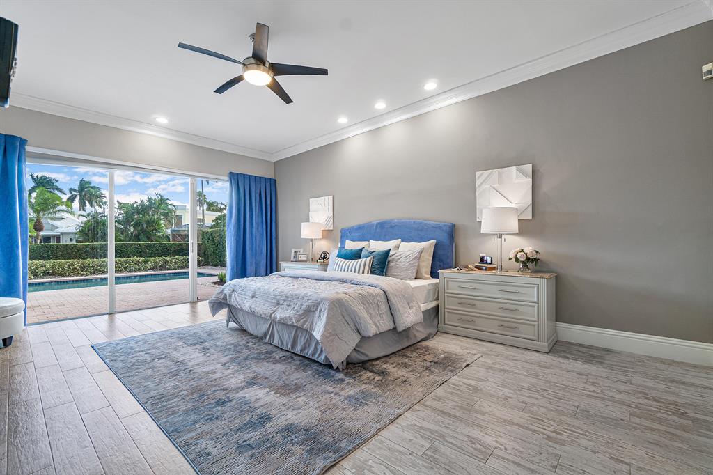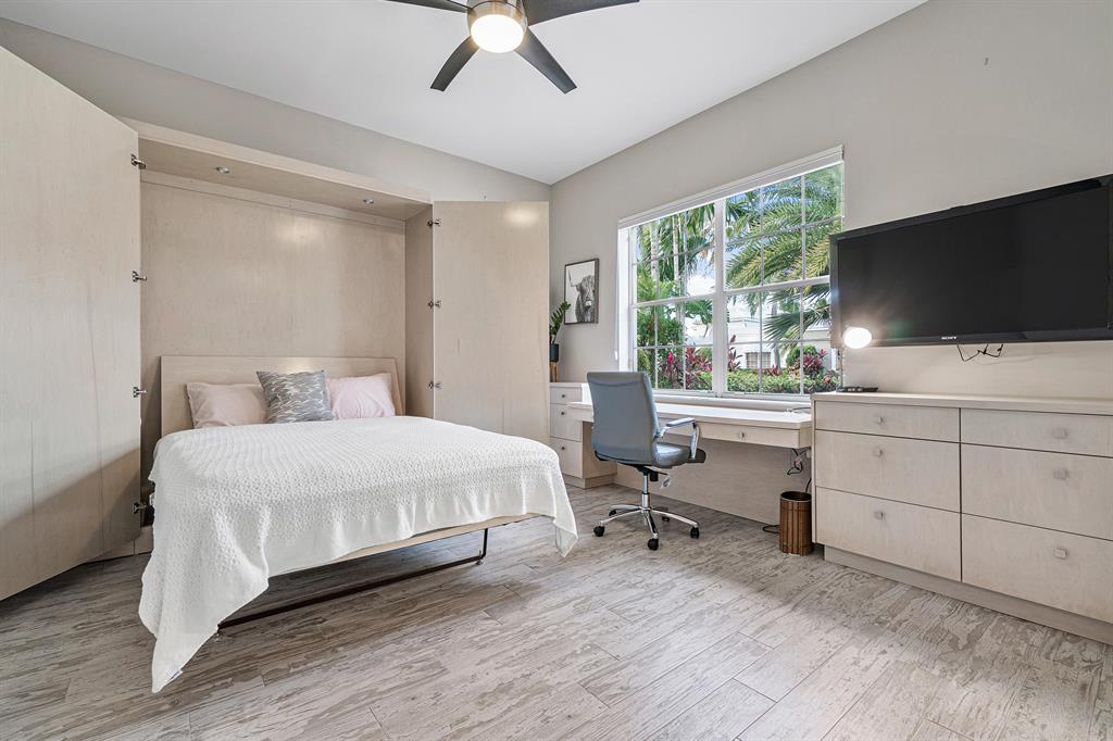 Nestled between lush landscaping and a shimmering lake you will find this renovated one-story gem. Upon entering this stunning sun filled home you are greeted with voluminous ceiling heights and a modified and reimagined open concept floor plan. The modern elements of the architectural kitchen design feature a large peninsula countertop, immense storage, and stainless steel appliances that also includes a wine cooler. Boasting an oversized master bedroom retreat that features two separate and spacious walk-in closets, a private bathroom, and a jacuzzi tub. This versatile split floor plan offers a beautifully designed built-in home office that dually serves as a guest bedroom suite to include a Murphy bed. The third bedroom is large in scale and provides a private en-suite bathroom. Take ->