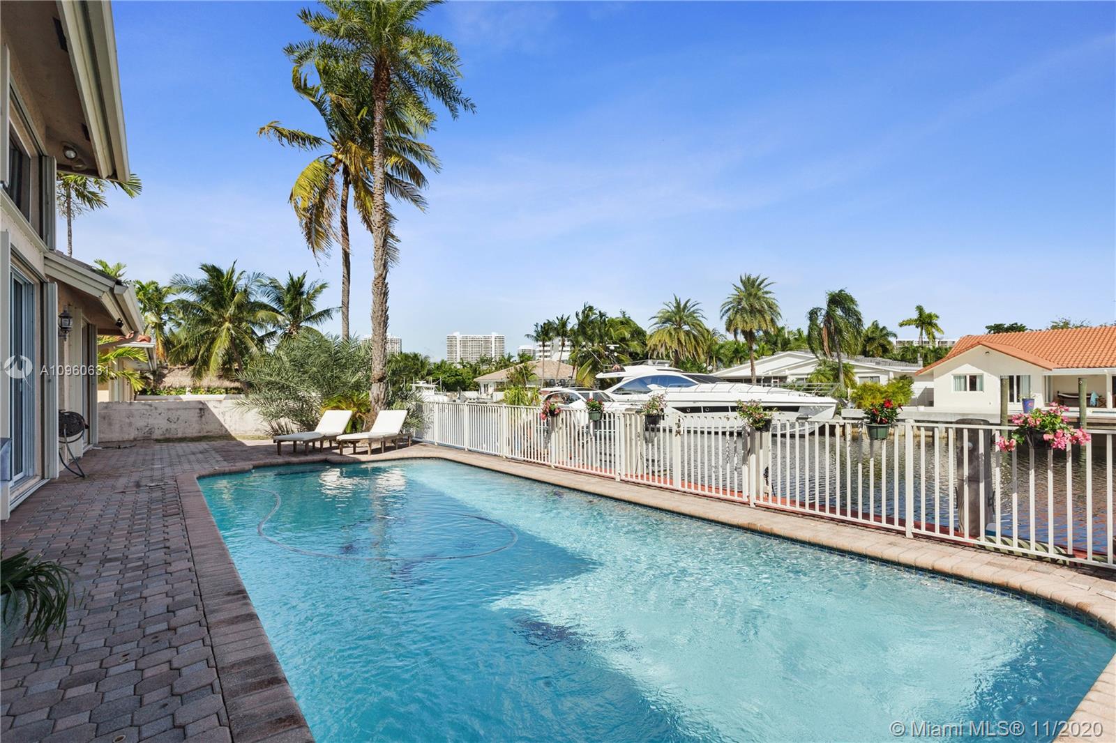 Beautiful waterfront home in the prestigious gated community of Eastern Shores. This spacious 3 Bed / 3 Bath is the ideal home for entertaining. Incredible open floor plan w/ Soaring 16 Ft High ceilings. The outdoor area features a large patio, swimming pool, and 80 ft of waterfront frontage w/boat dock and 13,000 LB lift included. Boaters Dream! 2 car Garage. Excellent location, close to shops, dining, Sunny Isles, Bal Harbour, and Aventura.