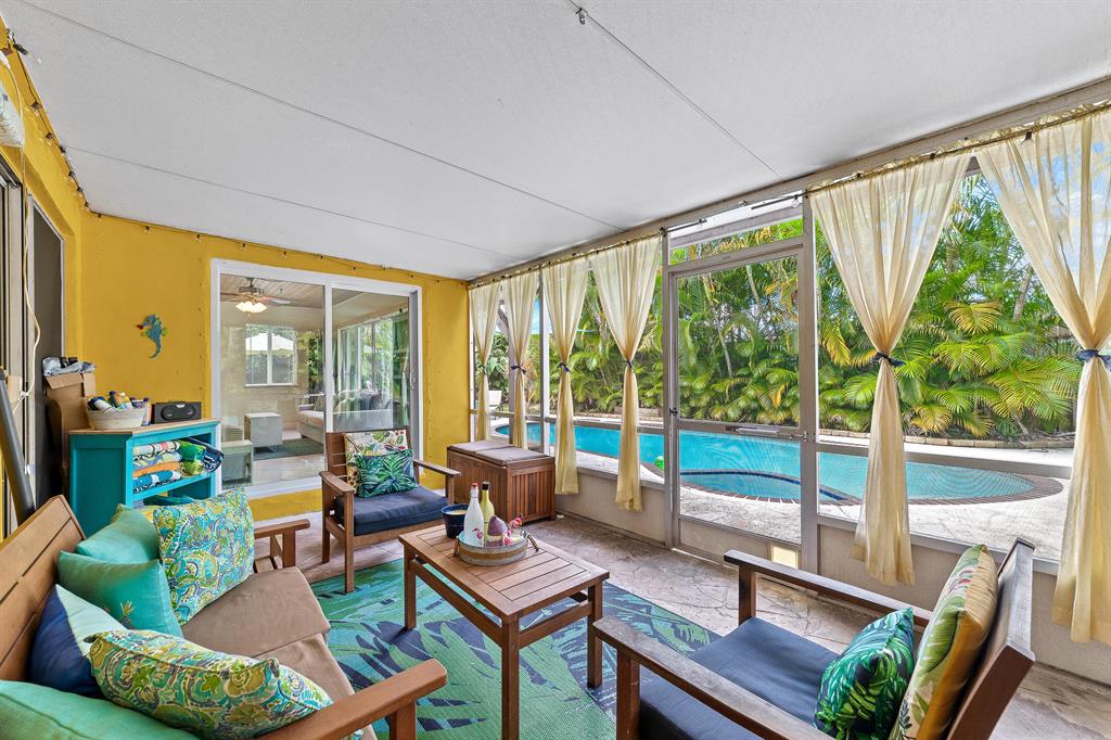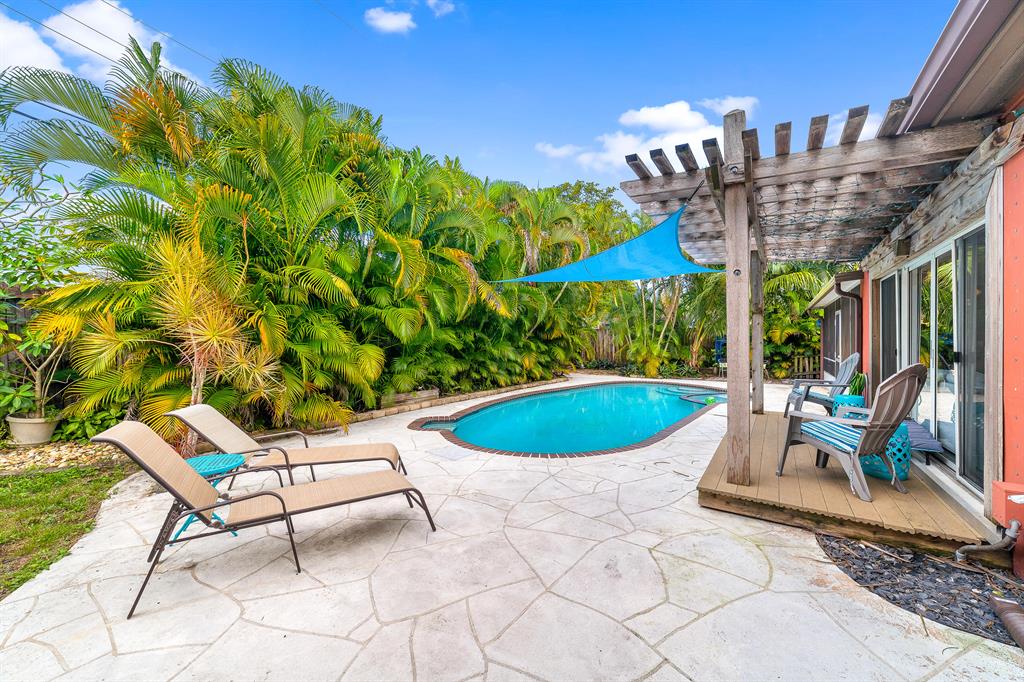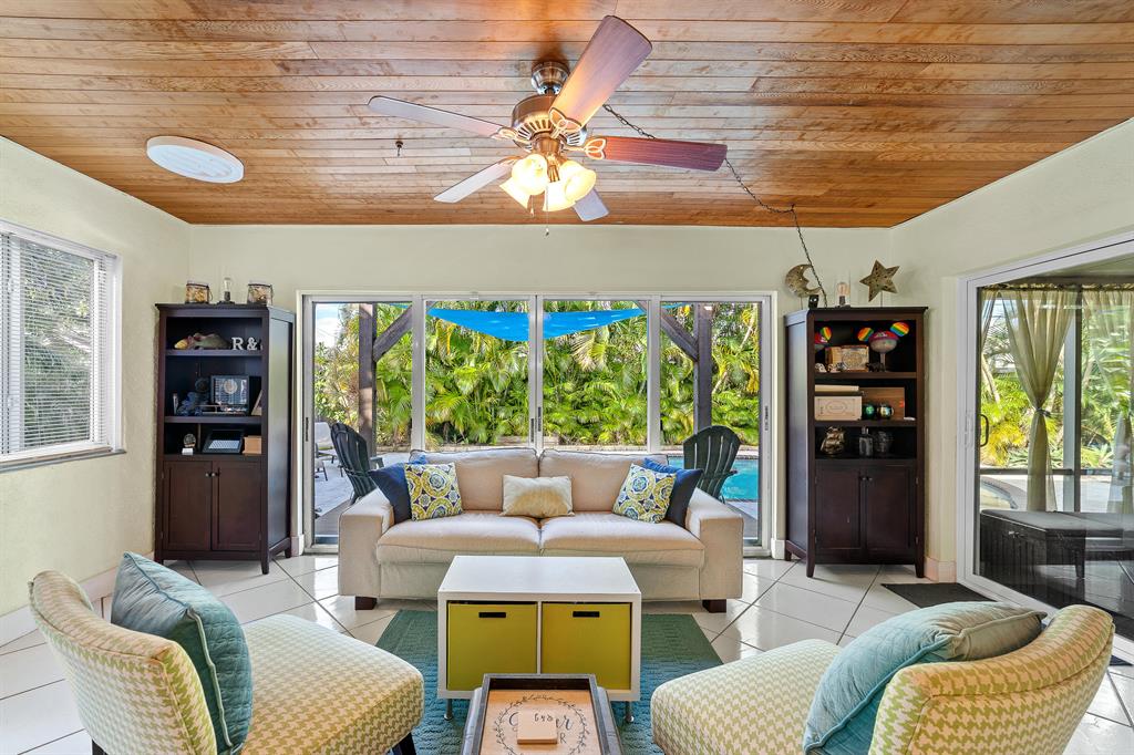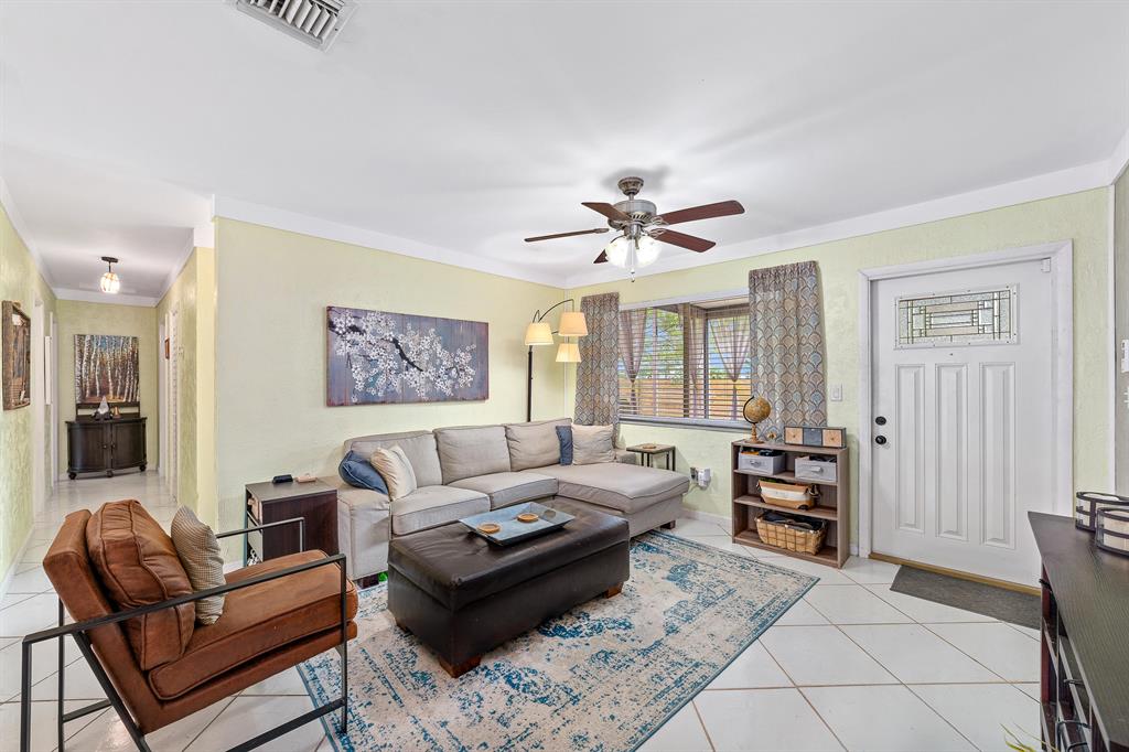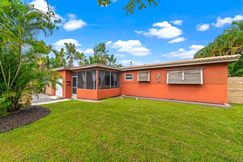This charming Fort Lauderdale home features lush landscaping with a private front yard, ample driveway parking, a one car garage and comfortable front porch. The home has a modern beachy feel and is extremely well maintained. The property boasts an updated kitchen with newer stainless steel appliances and white cabinetry. The open concept tiled living room opens up into the dining room on through to a cozy seating area. Both secondary bedrooms overlook the pool and private backyard and have wood flooring. The primary bedroom has newer carpeting and plenty of space. Both bathrooms have been updated. The backyard has a tropical feel with large pool and total privacy. The large rear screened porch has ample room for entertaining and relaxing. The home has some impact windows and the