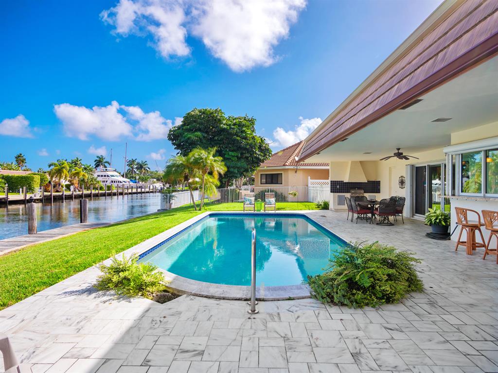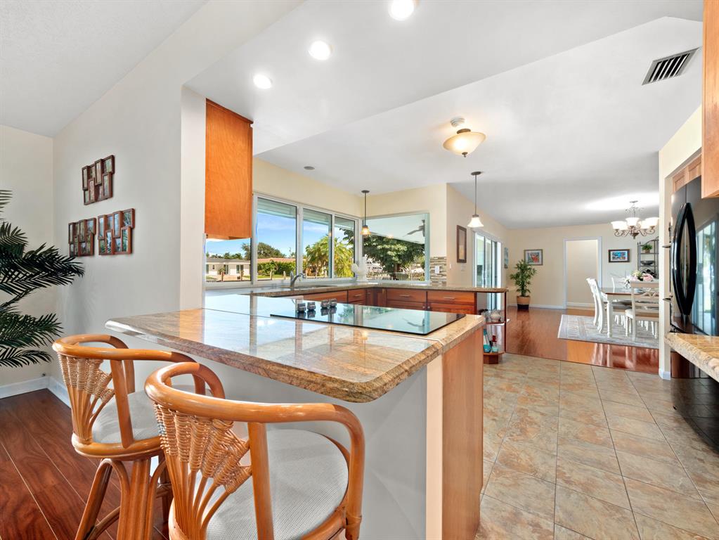 Motivated Seller! Make sure you bring your clients to this charming American ranch-style waterfront house with no fixed bridges, a 106 feet long seawall, and with its own boat dock. Located in the wonderful exclusive neighborhood of Fort Lauderdale known as The Landings, this 4,175 square foot, 4 bedrooms and 4 full bathrooms, house has a great location with a spectacular view from both the living room and kitchen. The kitchen features genuine wood cabinetry, granite counter tops, and has windows that open to conveniently serve as a bar area with outdoor seating.