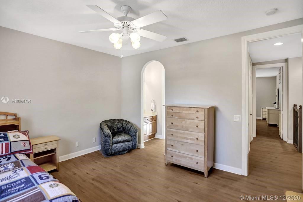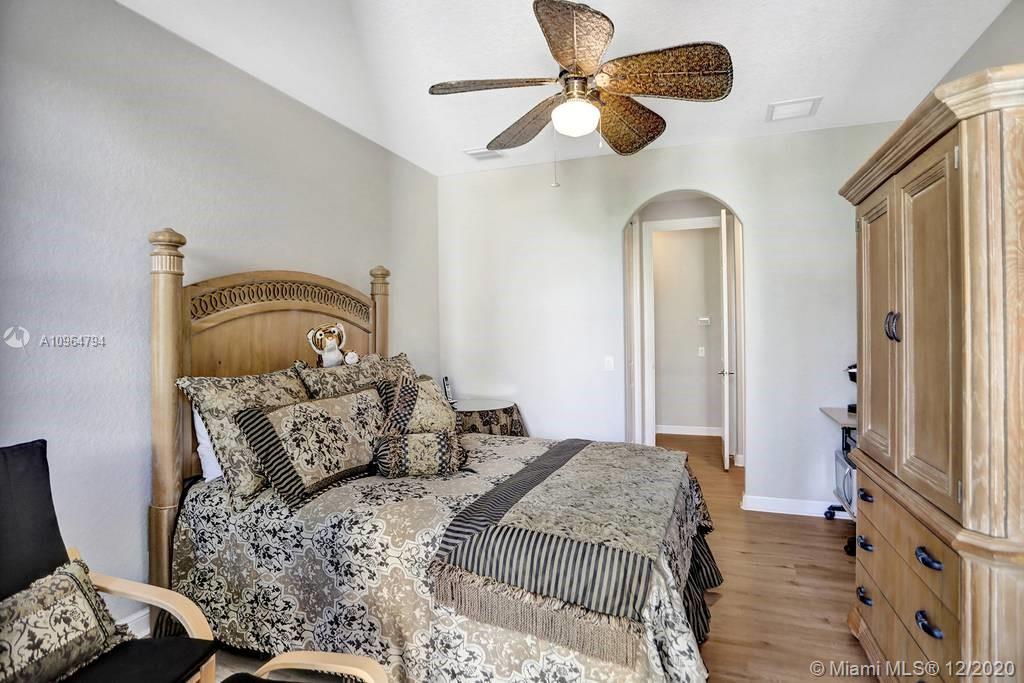 PRICE DROP Popular Sanibel model tucked on a royal palm tree-lined street in gated community of Weston Hills. Fresh neutral paint with real wood floors grace the living areas. 6 bedrooms, 5.5 bathrooms + office (built-in wood cabinets and desk) + 20x14 playroom and loft (could be 6th bedroom) span 5365 sq ft (inclusive of 1/1 guest house). Grand entry with volume ceiling and elegant custom staircase. White kitchen with center island and breakfast nook overlooks the family room. Luxurious owners wing w/sitting area features 300 sq ft balcony. New flooring upstairs in all bedrooms. The resort-style backyard features an expansive paver patio with a covered patio with rolling screens that open and close with a remote. Fully fenced privacy hedged. Full house generator, accordion protection