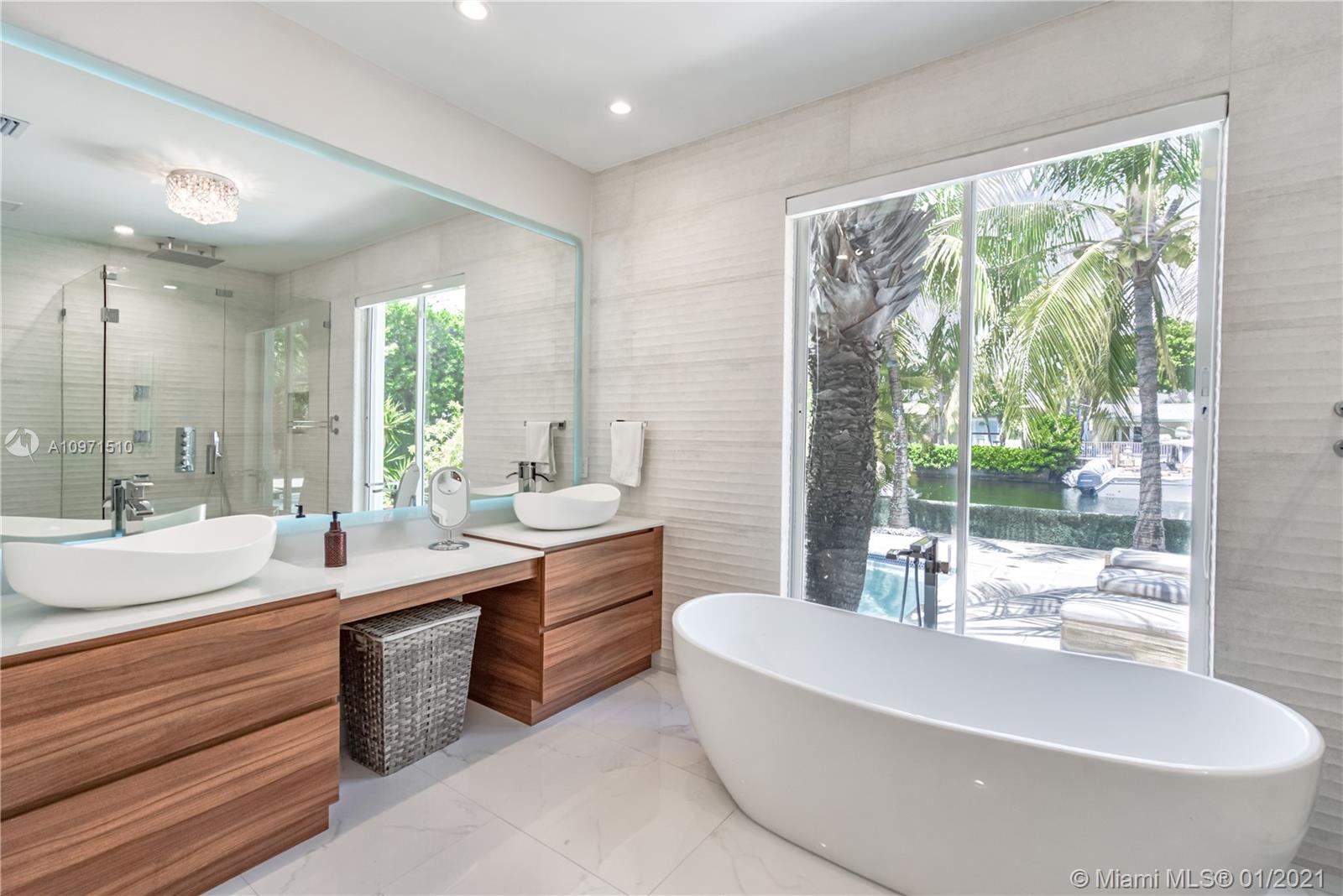Keystone Island, Miami features 5 bedrooms,4 ½ baths. 78ft on deep water ocean access canal. Only 3 mins to Bay–No bridges. Bright, airy open kitchen concept with Bosch Appliances. Primary bedroom w/large walk-in closet & huge bathroom, relax in soaking tub overlooking pool & water or wash the stress away in separate shower with rain-head & body sprays. Outdoor covered patio (32’X16’) & shaded palm trees are the perfect combination for entertaining pool side. 2 New AC units. For boaters: 78 ft w/davits & dock power to accommodate most boats, room for jet skis, kayaks & paddle boards. Quiet Cul-de-sac street. 24hr Guard Gate.