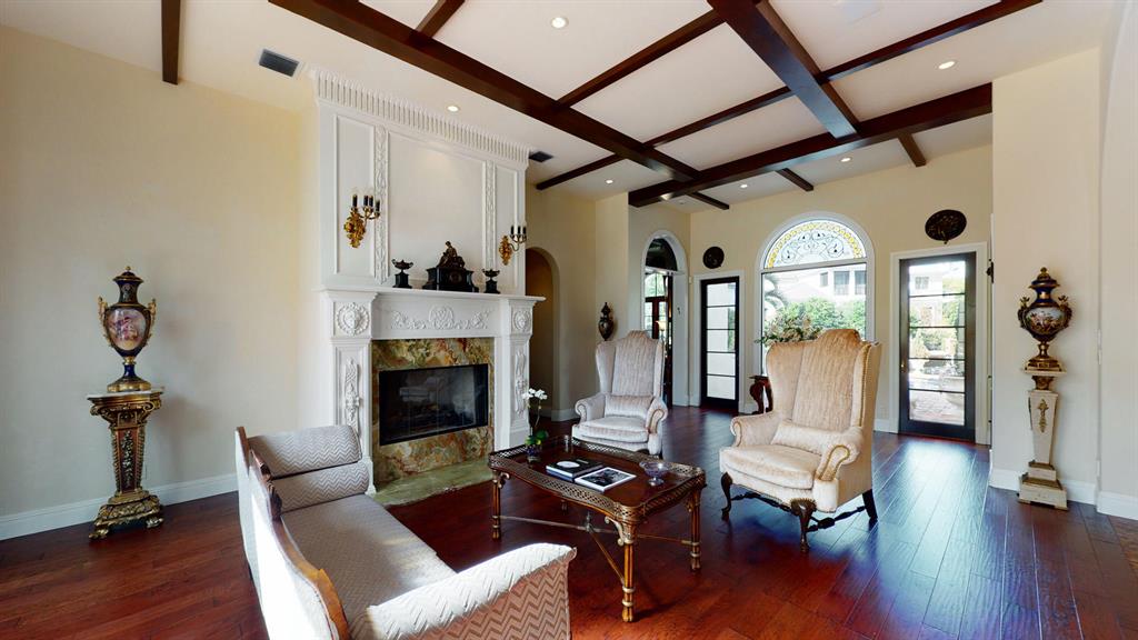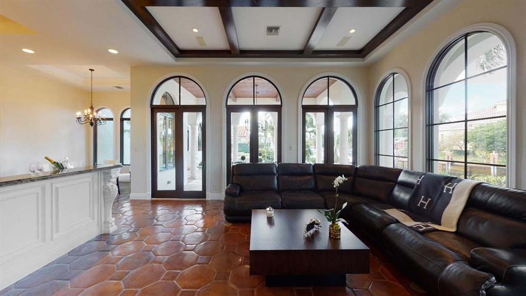 A beautifully landscaped brick motor court and a welcoming gated inner courtyard with a fountain introduce this impressive residence. With 100+/- feet on the waterfront and a deep-water full-service dock, this legacy property offers beautiful partial views down the canal to a nature preserve. Sundrenched and serene, with mature low-maintenance landscaping providing privacy, a dining loggia and a summer-kitchen loggia overlook the free-form waterfall pool and Jacuzzi set within a bricked terrace, and a walkway leads to the private sauna. Shown by appt. only.