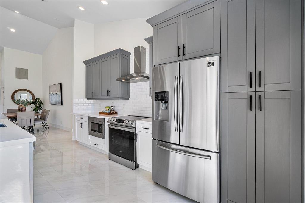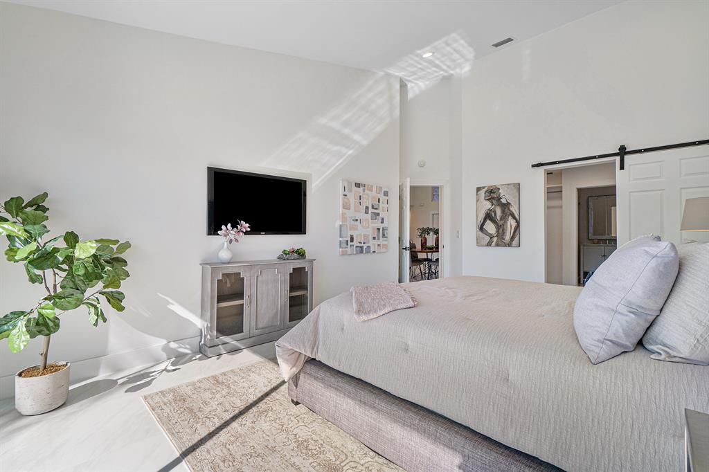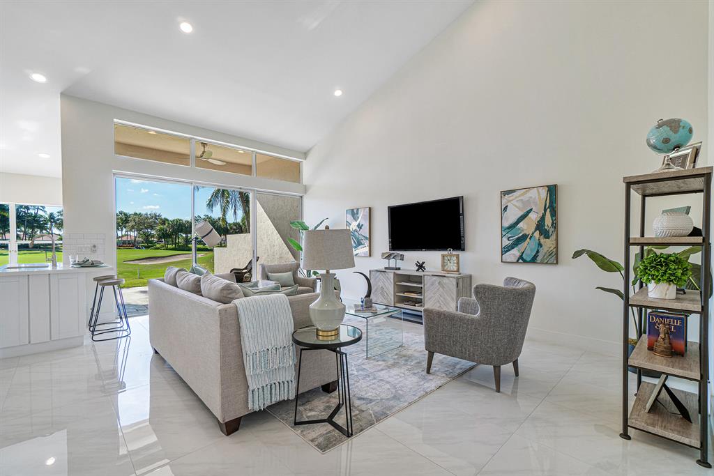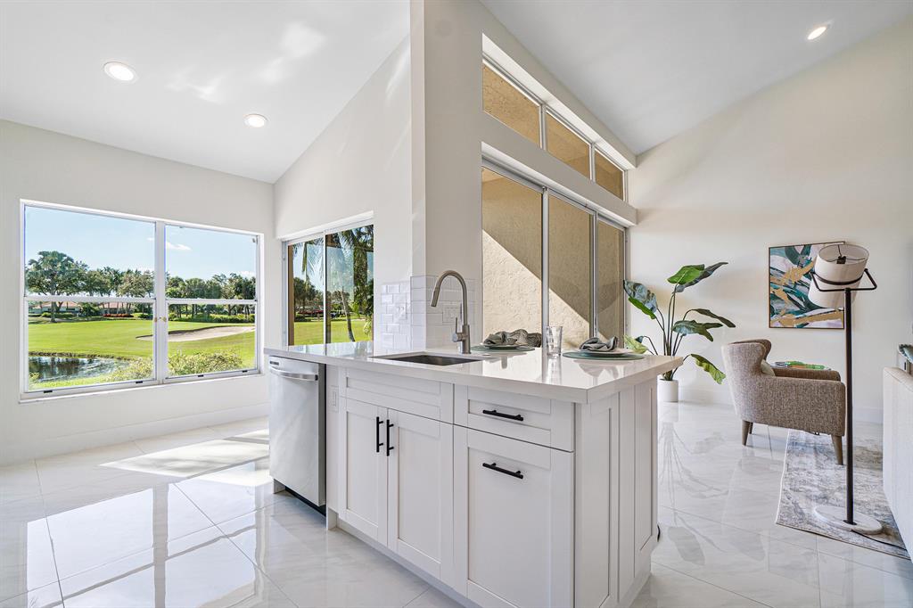 Pristine picturesque lake and golf course views set the stage for this completely renovated, single-story townhouse. The open-concept design offers great flow between the dining room, double-height ceiling living room, and kitchen. The modern kitchen has sleek stainless steel appliances, a convenient eat-in area, and access to the patio. A split bedroom floor plan offers complete privacy for all. The master suite offers stunning views, immense closet space, and a spa-like bath. Two secondary bedrooms are both generous in size. Desirable southern exposure allows for ample daylight outside on the spacious patio. Additional features include a separate laundry room, a two-car garage, a new roof, and a freshly painted exterior. Located in the award-winning Polo Club Country Club where mandatory