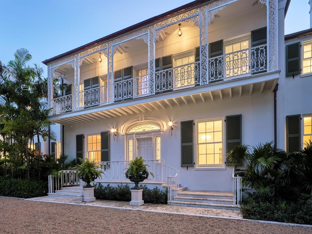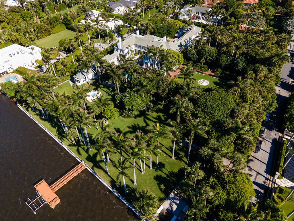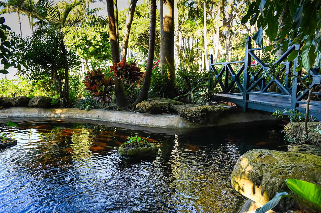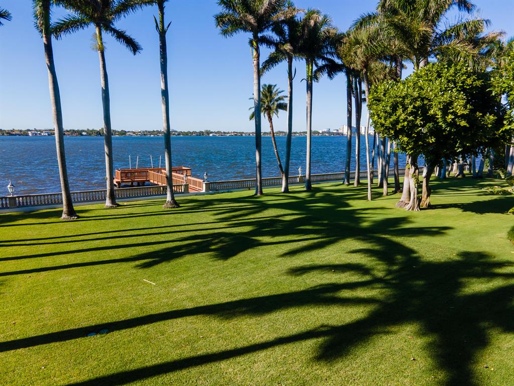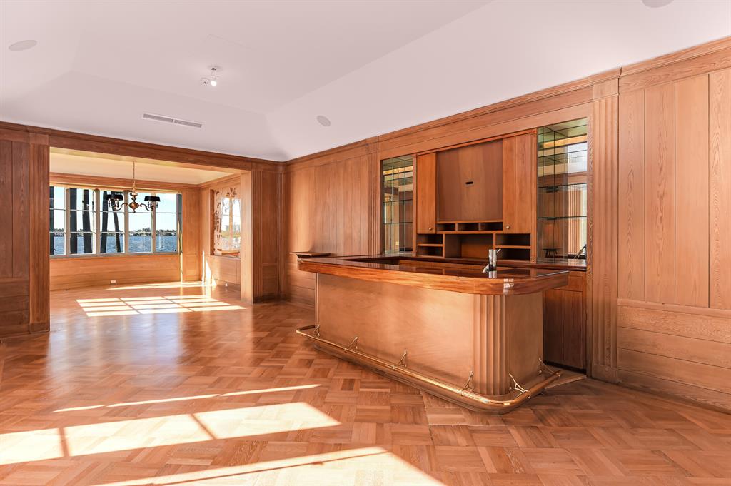 Palm Beach Grandeur- Direct waterfront compound on exceptional, rare 3+ acre estate. Located along the Intracoastal in the Estate Section, this home features stunning sunset views, boat dock, and tennis court with viewers' terrace. Landmarked home designed by Marion Sims Wyeth with 9 bedrooms, 10 full baths, and 6 powder rooms. Fantastic outdoor spaces include stunning landscaping, welcoming motor court, terraces, outdoor kitchen, beautiful koi ponds with garden bridge, and waterfront pool. Highlights include gorgeous European detailing, paneled library, elevator, and 6 car garage. Gym with built-in bar, and spa with changing room, steam shower, custom sauna, and powder room., Theater features drop-down movie screen, integrated speakers, wood paneling, and large bar.