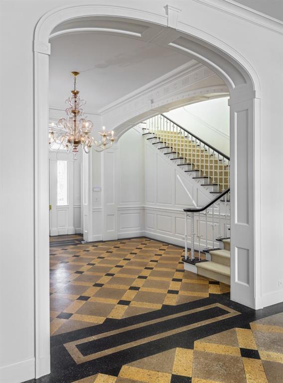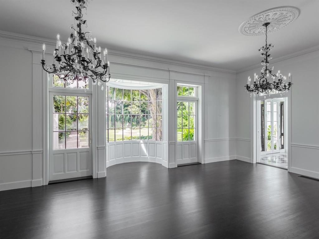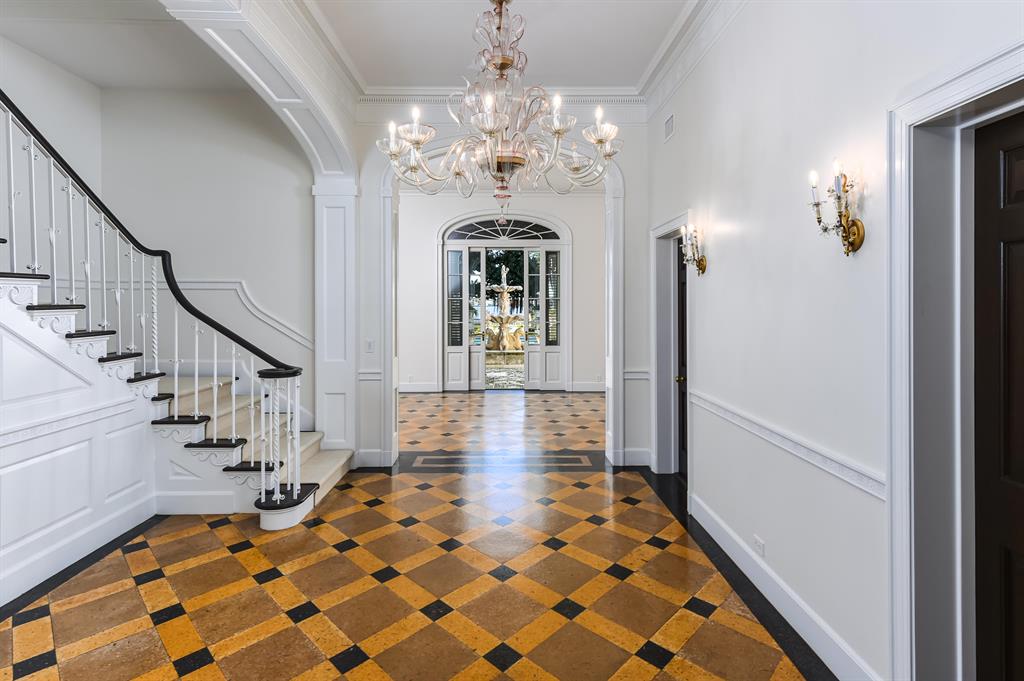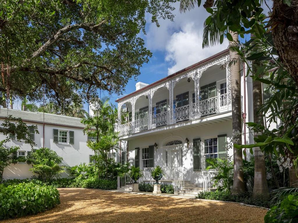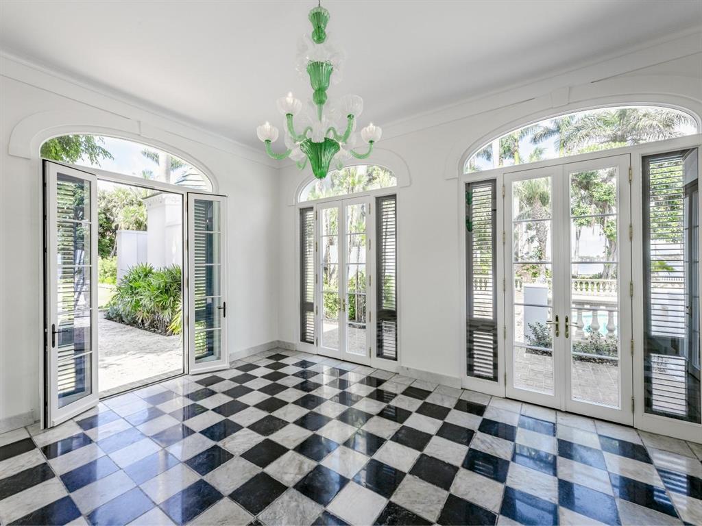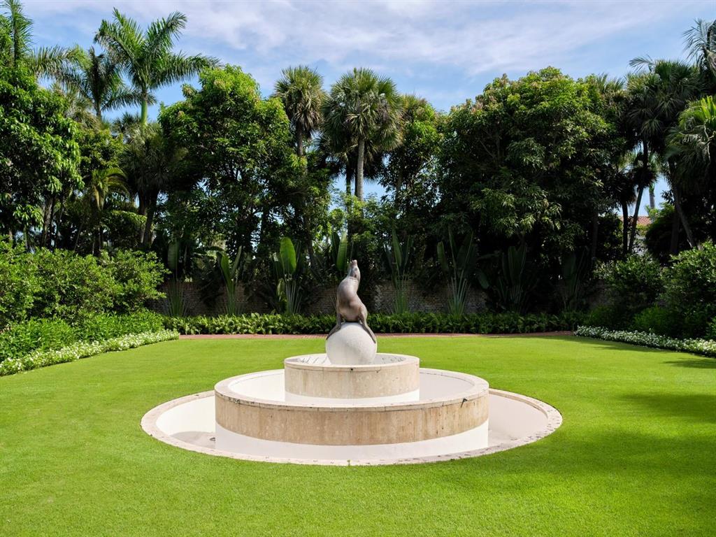 Palm Beach Grandeur- Direct waterfront compound on exceptional, rare 3+ acre estate. Located along the Intracoastal in the Estate Section, this home features stunning sunset views, boat dock, and tennis court with viewers' terrace. Landmarked home designed by Marion Sims Wyeth with 9 bedrooms, 10 full baths, and 6 powder rooms. Fantastic outdoor spaces include stunning landscaping, welcoming motor court, terraces, outdoor kitchen, beautiful koi ponds with garden bridge, and waterfront pool. Highlights include gorgeous European detailing, paneled library, elevator, and 6 car garage. Gym with built-in bar, and spa with changing room, steam shower, custom sauna, and powder room., Theater features drop-down movie screen, integrated speakers, wood paneling, and large bar.