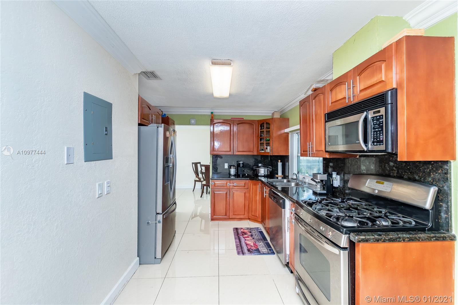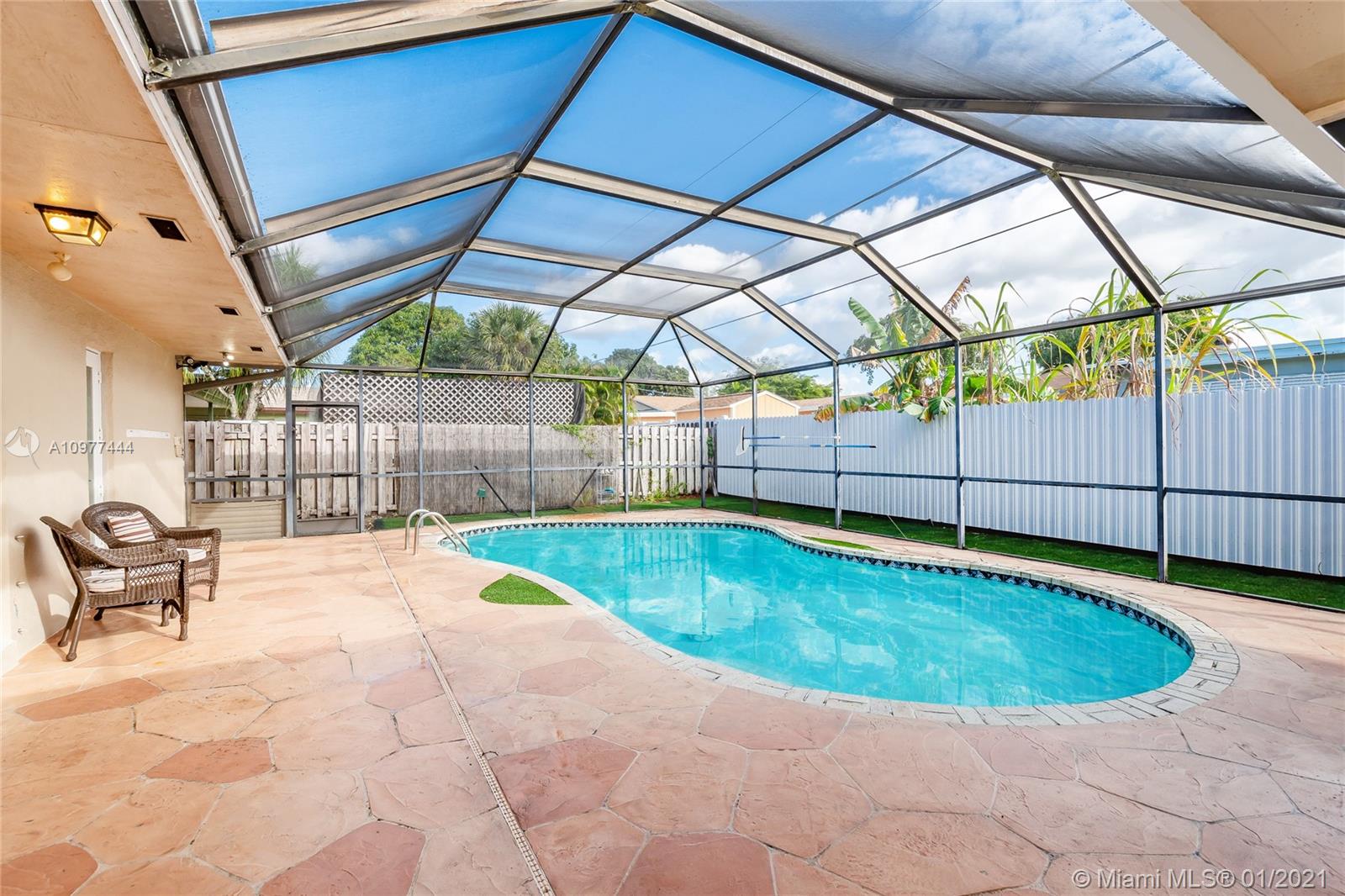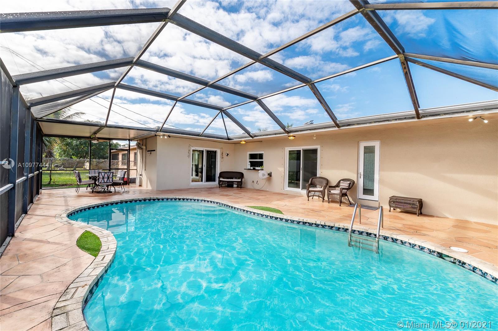 Beautiful immaculate condition house: 3 bed/2 baths with awesome Pool. Custom kitchen cabinets, granite countertops, stainless-steel appliances, gas stove. Renovated bathrooms. Ceramic tile floor throughout the house. Central A/C with wireless thermostat. Security Camera System included. Lots of outdoor and entertainment area, swimming pool screened in, pool salt chlorinator, automated pool vacuum for easy maintenance. High impact windows / garage door. Covered garage with lots of storage space. Enjoy family with BBQ area, additional outside eat/relax/play covered area. Den can easily be converted to 4th bedroom. Close to everything: stores, services, restaurants, supermarkets. 3 min. driving to FL Turnpike. No HOA fees. Ready to move in. Showings By Appointment Only Mon-Wed. 9am to 4pm.