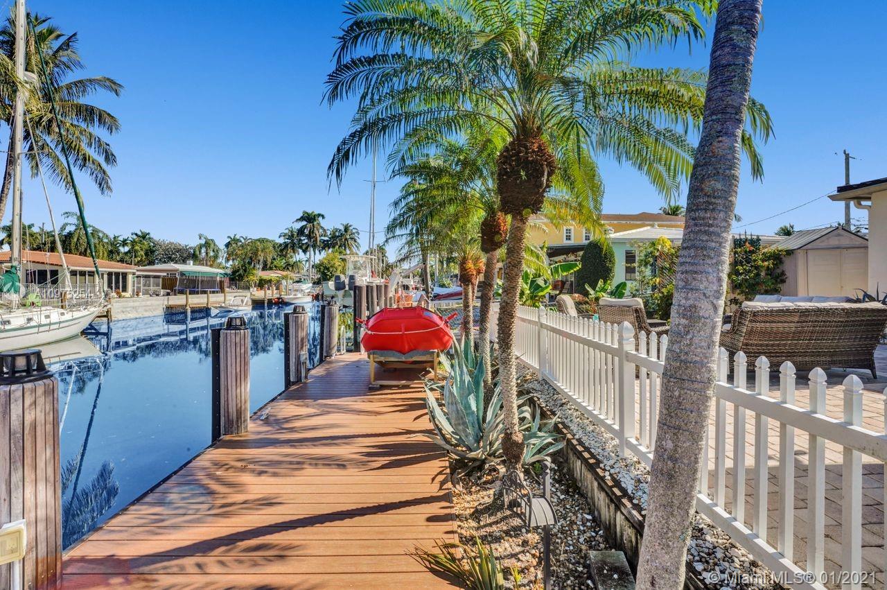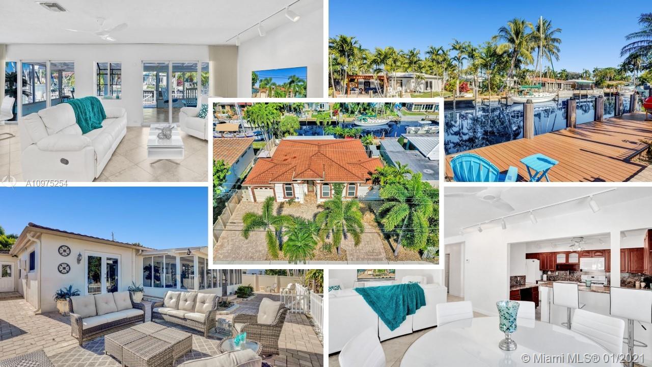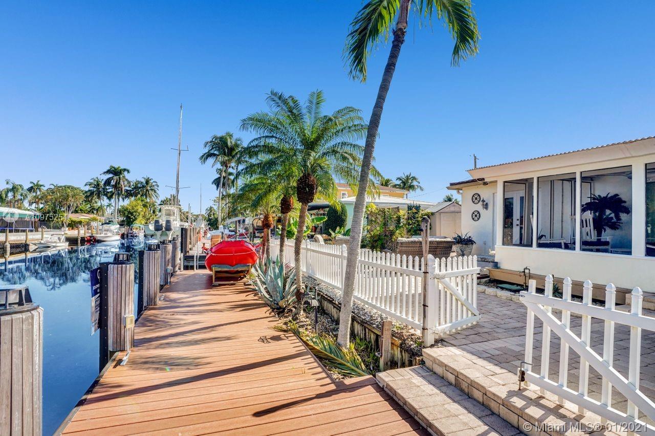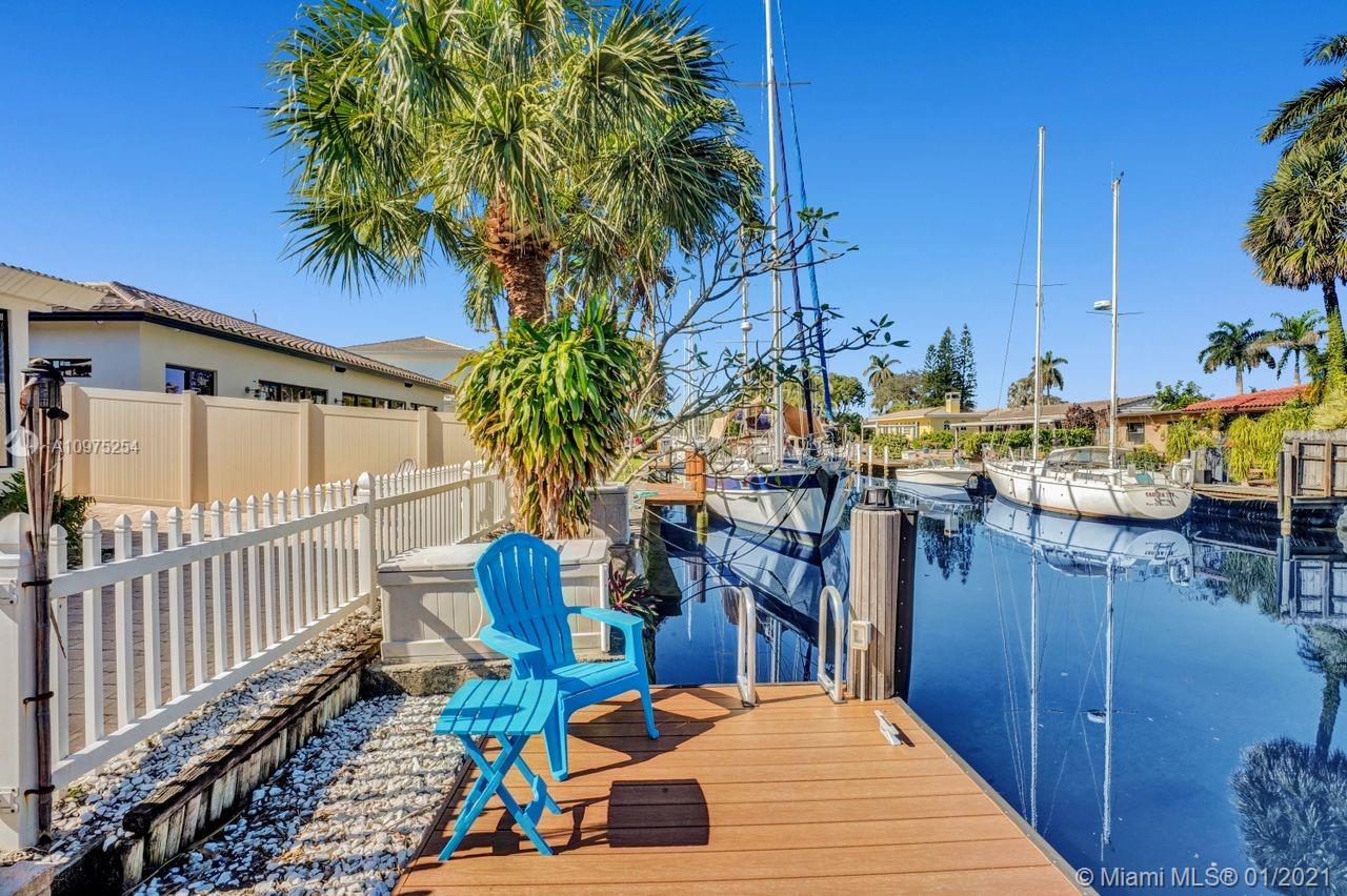 Bring your boat-waterfront beauty- -doubled in size in 2008 2,220+SF. 3 bed + den/office & 2 1/2 bath. Impact doors & windows, pavered circular driveway w/1-car garage & large rear screened-in patio. Dock/seawall & new Dingy in great condition -65' on water, in-water color accent lights. Fully fenced, space to entertain, BBQ gazebo w/pass-thru to kitchen, shed w/power outlets & outdoor shower. BIG master suite w/walk-in closet, high ceilings, ensuite bathroom w/Jacuzzi tub, shower, toilet room & vanity. Open kitchen w/wood cabinets, desk, counter bar & gas stove. Big Florida Room w/wall of windows out to dock. ADT security, 2 ACs. NOT A TEARDOWN. Laundry in epoxy floor garage w/TV. Office was 2nd car garage. Ocean access, no fixed bridges. Galvanized roof. Larger than SF on record