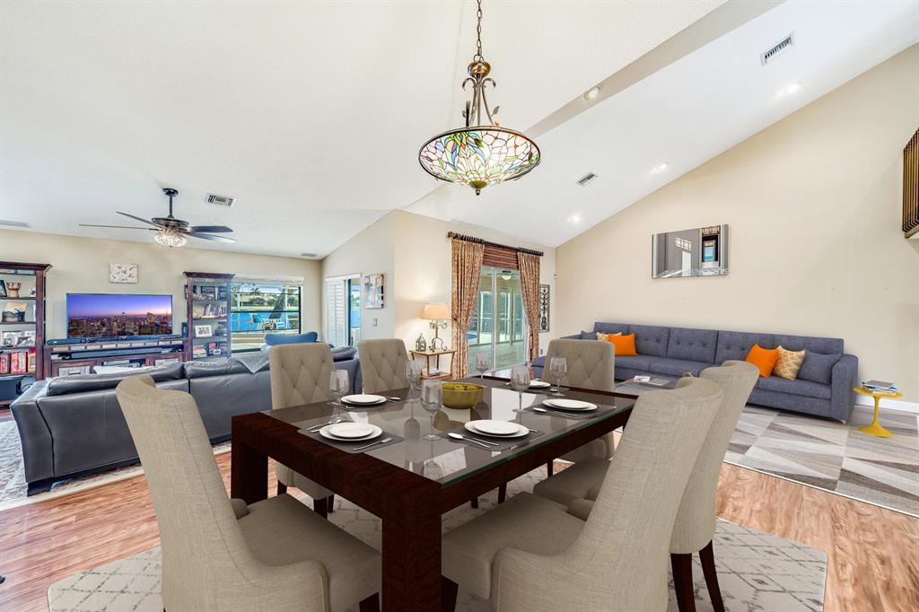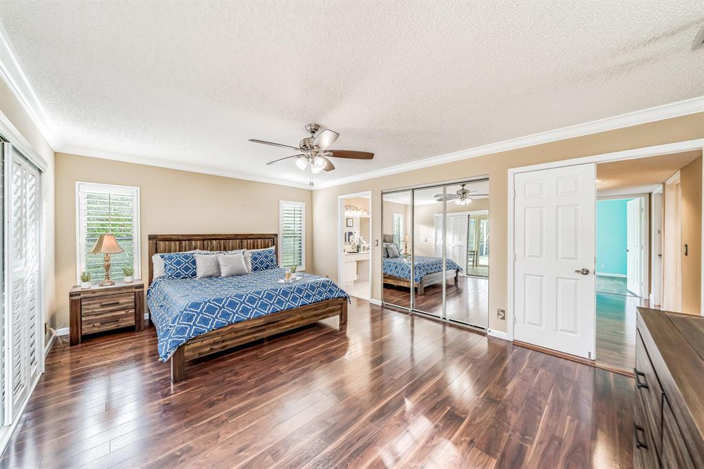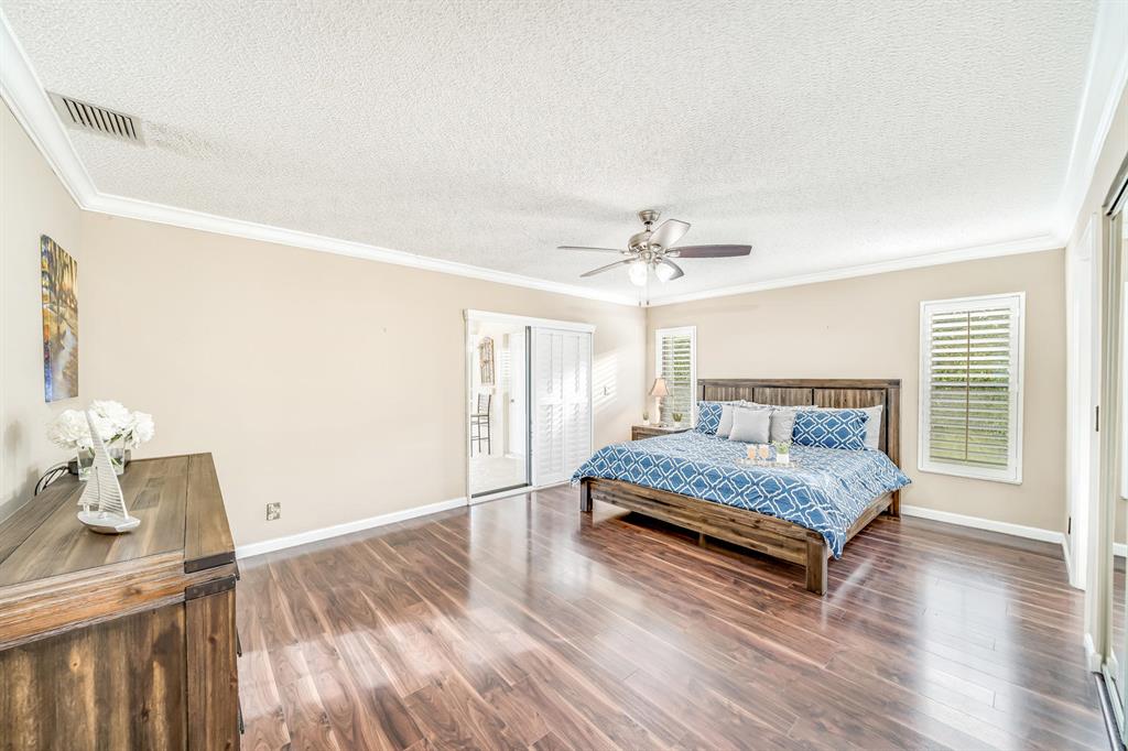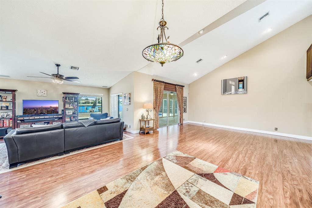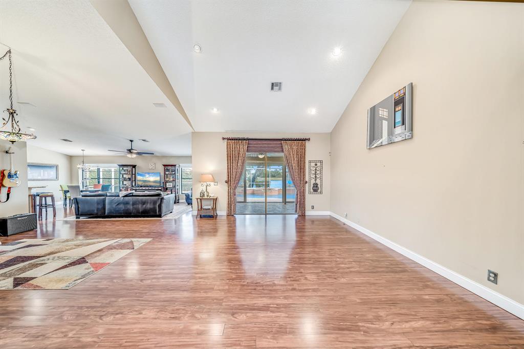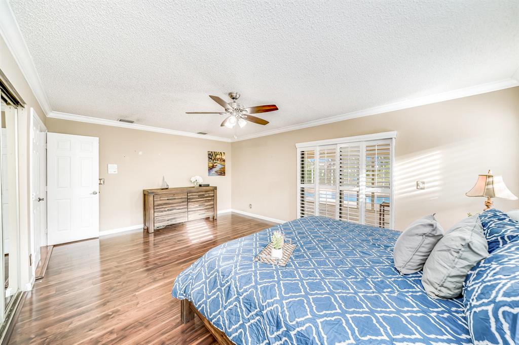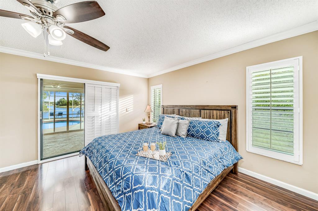 Island Lakes Waterfront Pool Home on a Huge Corner Lot with almost a half acre Plus magnificent lake views. Five true spacious bedrooms, 3.5 baths & 3 car garage, w/soaring cathedral ceilings, open floor plan w/laminate flooring throughout home & tile in the bathrooms. A very rare find-master bedroom and 2nd bedroom on the ground level and other 3 bedrooms on 2nd level. Crown molding, plantation shutters, & recessed lighting. Gourmet kitchen features SS appliances including French door fridge, wall oven and microwave, glass cooktop with stainless hood vent, granite countertops, pantry and more! Eat in area & expansive family room off the kitchen. Large Living and dining room as well. Large master suite features huge walk in closet, a large master bath &