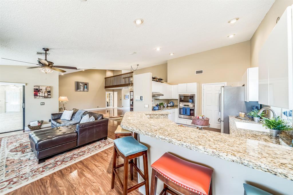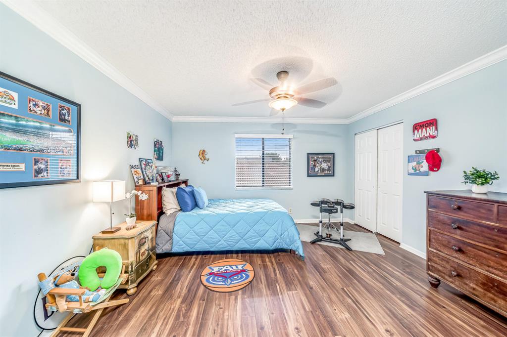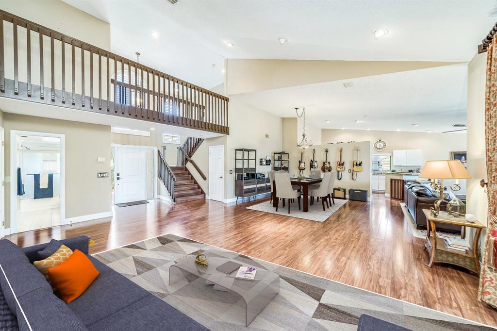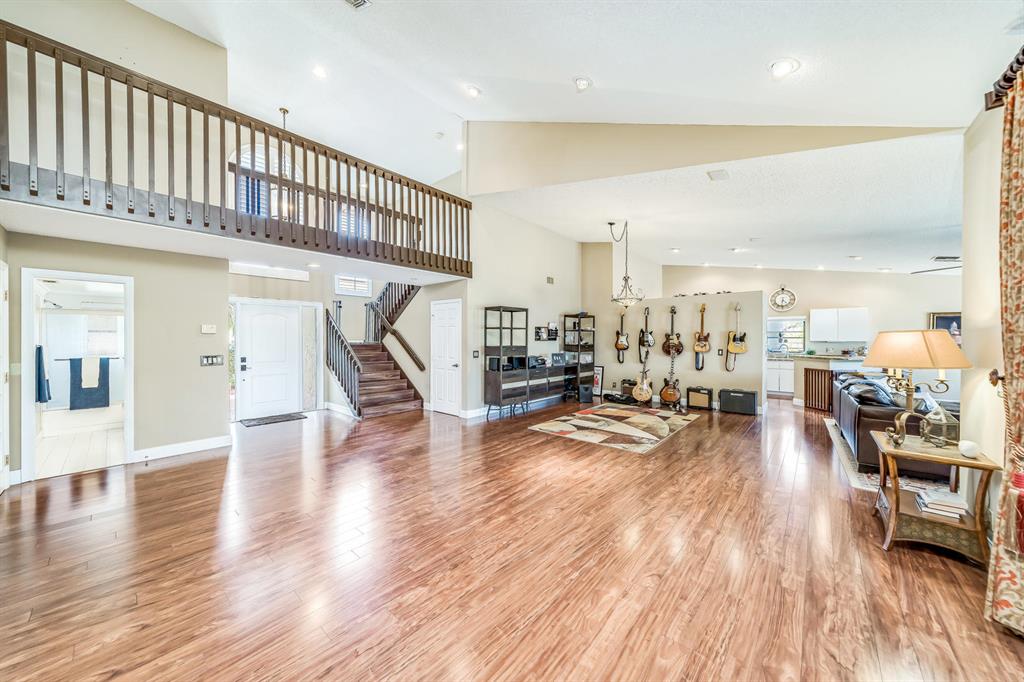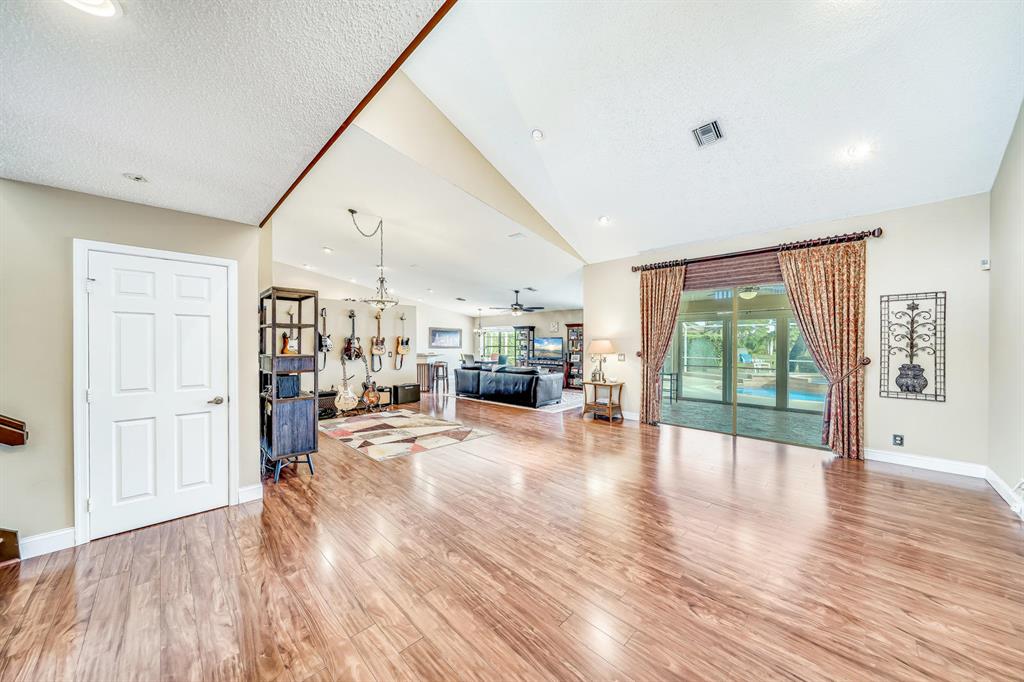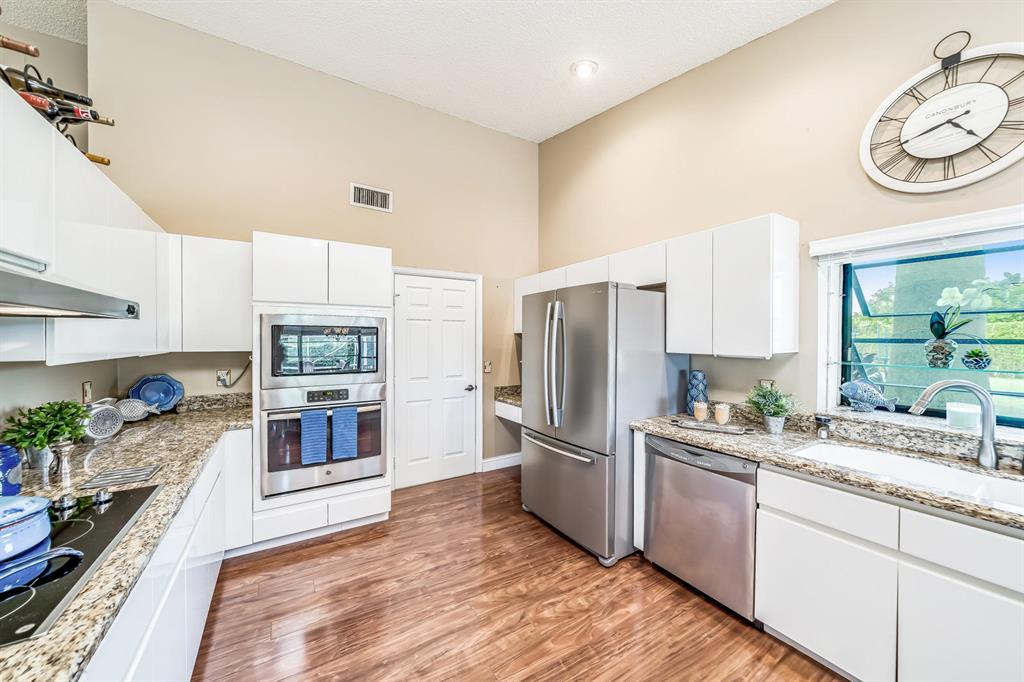 Island Lakes Waterfront Pool Home on a Huge Corner Lot with almost a half acre Plus magnificent lake views. Five true spacious bedrooms, 3.5 baths & 3 car garage, w/soaring cathedral ceilings, open floor plan w/laminate flooring throughout home & tile in the bathrooms. A very rare find-master bedroom and 2nd bedroom on the ground level and other 3 bedrooms on 2nd level. Crown molding, plantation shutters, & recessed lighting. Gourmet kitchen features SS appliances including French door fridge, wall oven and microwave, glass cooktop with stainless hood vent, granite countertops, pantry and more! Eat in area & expansive family room off the kitchen. Large Living and dining room as well. Large master suite features huge walk in closet, a large master bath &