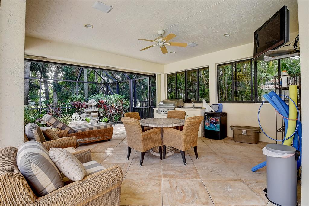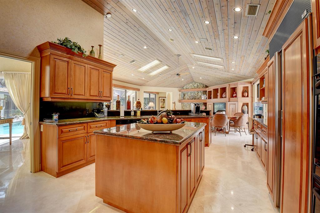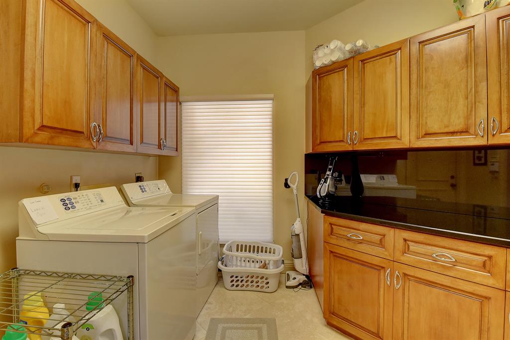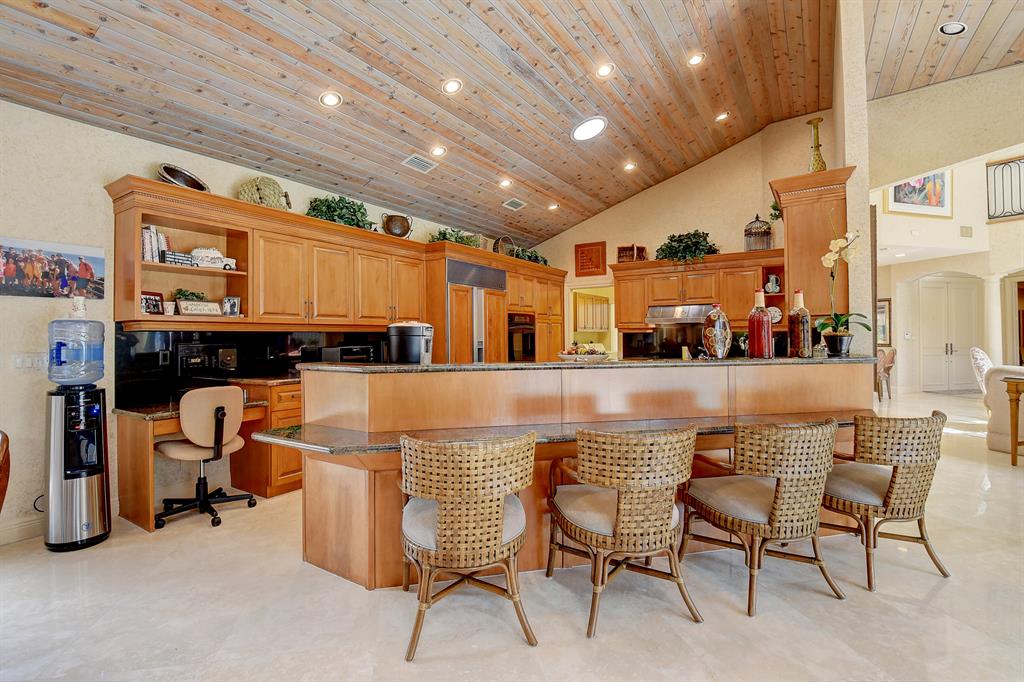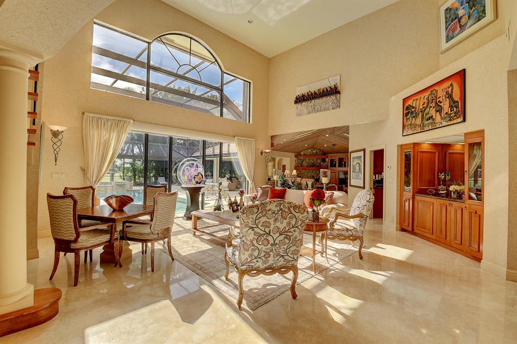 Magnificent custom built 5 bedroom plus office, 5 bath + 2 half baths, 2 story home on choice oversized golf course lot. Southern exposure. Large screened in pool + spa/patio area. Separate covered entertainment area. Main level master bedroom has separate his and her bathrooms each with their own large closet. Separate office with full bath that could be used as an additional bedroom. Open kitchen to the family room with a fire place, large screen TV and breakfast area. Separate living room and formal dining room with bar. Stereo system with speakers throughout the house. Impact windows throughout. Outside covered entertainment area with hurricane shutters. Full two car garage with golf cart area. Large circular driveway. A very light and bright contemporary home with lots of windows.