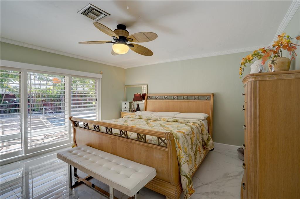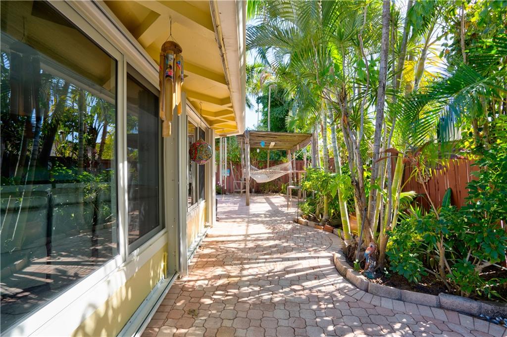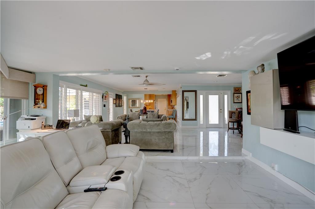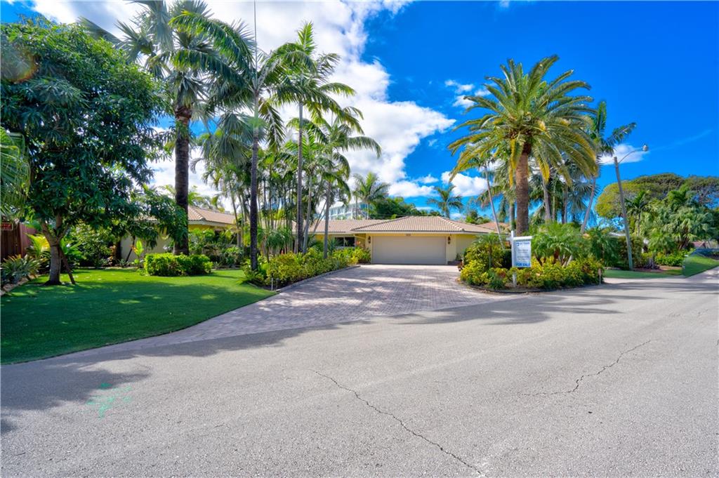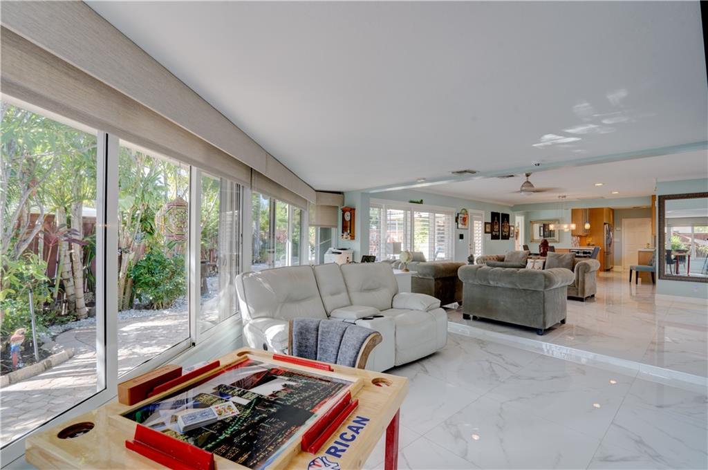 Welcome home to this terrific Coral Ridge home, located on a very low traffic street, yet walking distance to movies, shopping, restaurants and more. This home features a great open floor plan with split bedrooms, 32x32 porcelain tile throughout and plenty of space to entertain. All bedrooms are spacious with good closet space and the outdoor areas are designed for low maintenance with great hidden niches designed to allow you to enjoy the outdoors and beat the heat. The pool gets year round sunshine and there's a private outdoor shower. Impact windows with accordion shutters give dual protection, whole house generator and water purification system, too. 2 car garage with lots of parking and a short bike ride to the beach, this location is so private yet in the middle of everything!