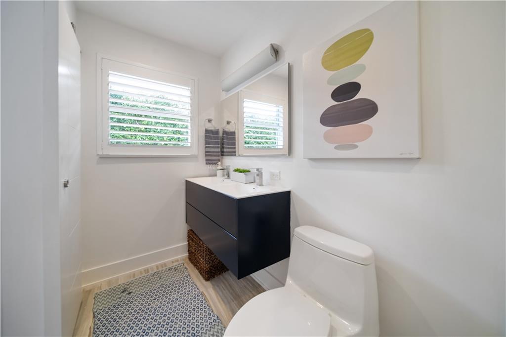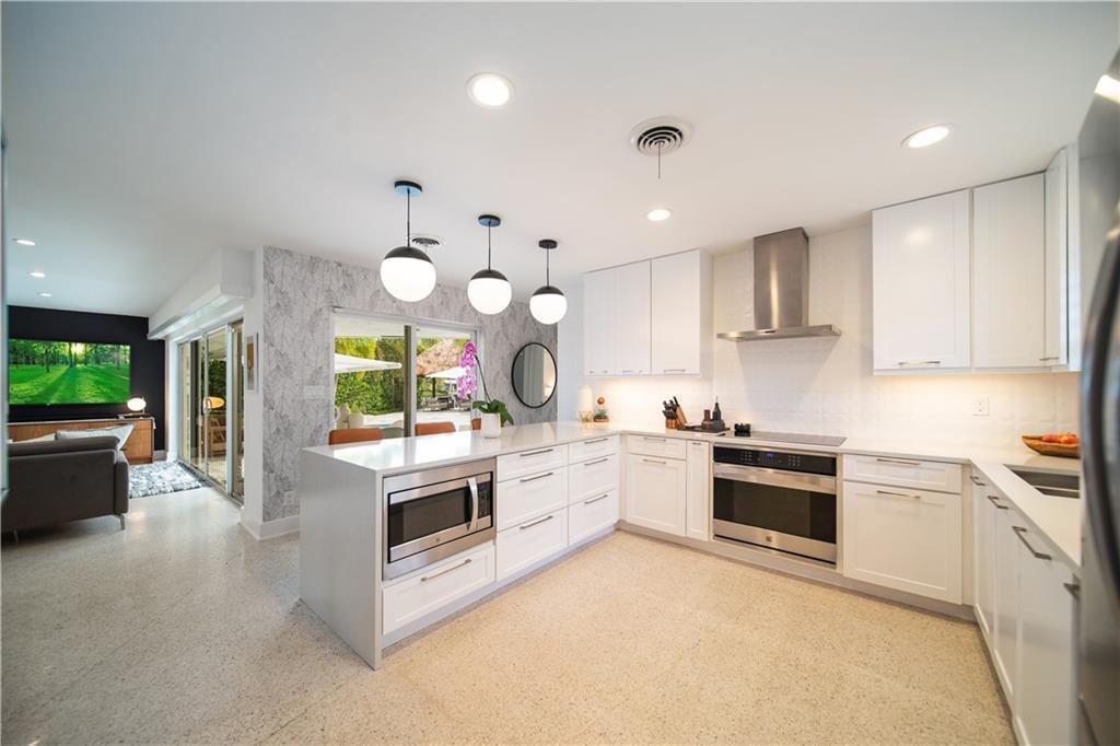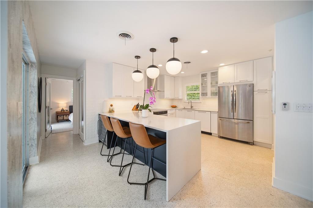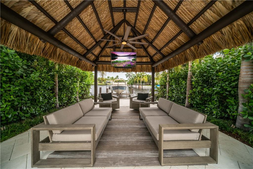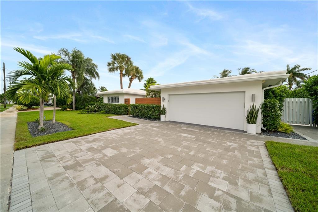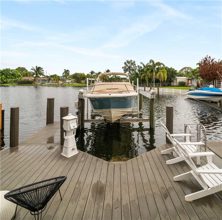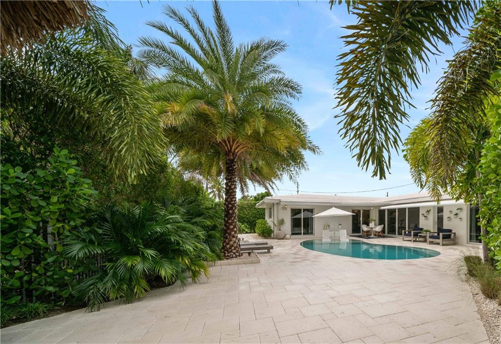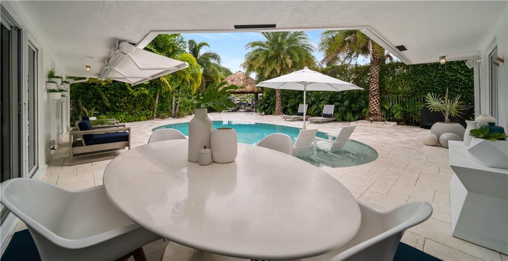 Modern luxury is uniquely embodied in this beautiful waterfront home. Entertain in style in the generously sized living room & dining room that open up to a jaw-dropping one-of-a-kind backyard with lush & mature landscaping, resort-style saltwater pool, tumbled limestone pavers, new large tiki hut, long water views & ocean access. This lot is unique, offering outdoor space & privacy (not typically found with waterfront lots). Every detail was carefully selected... highlights include a high-end chef’s kitchen (custom white wood shaker cabinets, Porcelanosa tile, quartz waterfall countertops & professional-grade appliances), newer composite dock and boat lift, beautifully restored terrazzo floors, tons of natural light & stylish finishes throughout. Only 3 miles from the beach!