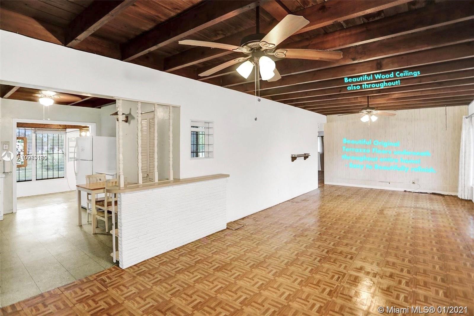 GORGEOUS HOME in a Charming North Miami Beach. This home is in excellent condition, very well maintained and loved over the years. ORIGINAL TERRAZZO FLOORS THROUGHOUT entire home that can be beautifully refinished. Wooden beam ceilings that are lovely. Big, Beautiful home with incredible living spaces, bright natural light, and high ceilings. Great bedrooms, huge master suite. Adorable original kitchen in perfect condition (wow!) with nice pantry. HUGE BACKYARD with wide open view, COMPLETE PRIVACY. Fully fenced, PERFECT FOR PET OWNERS. This ORIGINAL OWNER built the house! Great condition. Additional Notes: Updated Electric, Roof 6 Years, Minor Repairs needed in 1 bath for shower pan + Valves. Room for Pool, entertainment space! Lovely Carport. OWNER PREFERS CASH OFFER.
