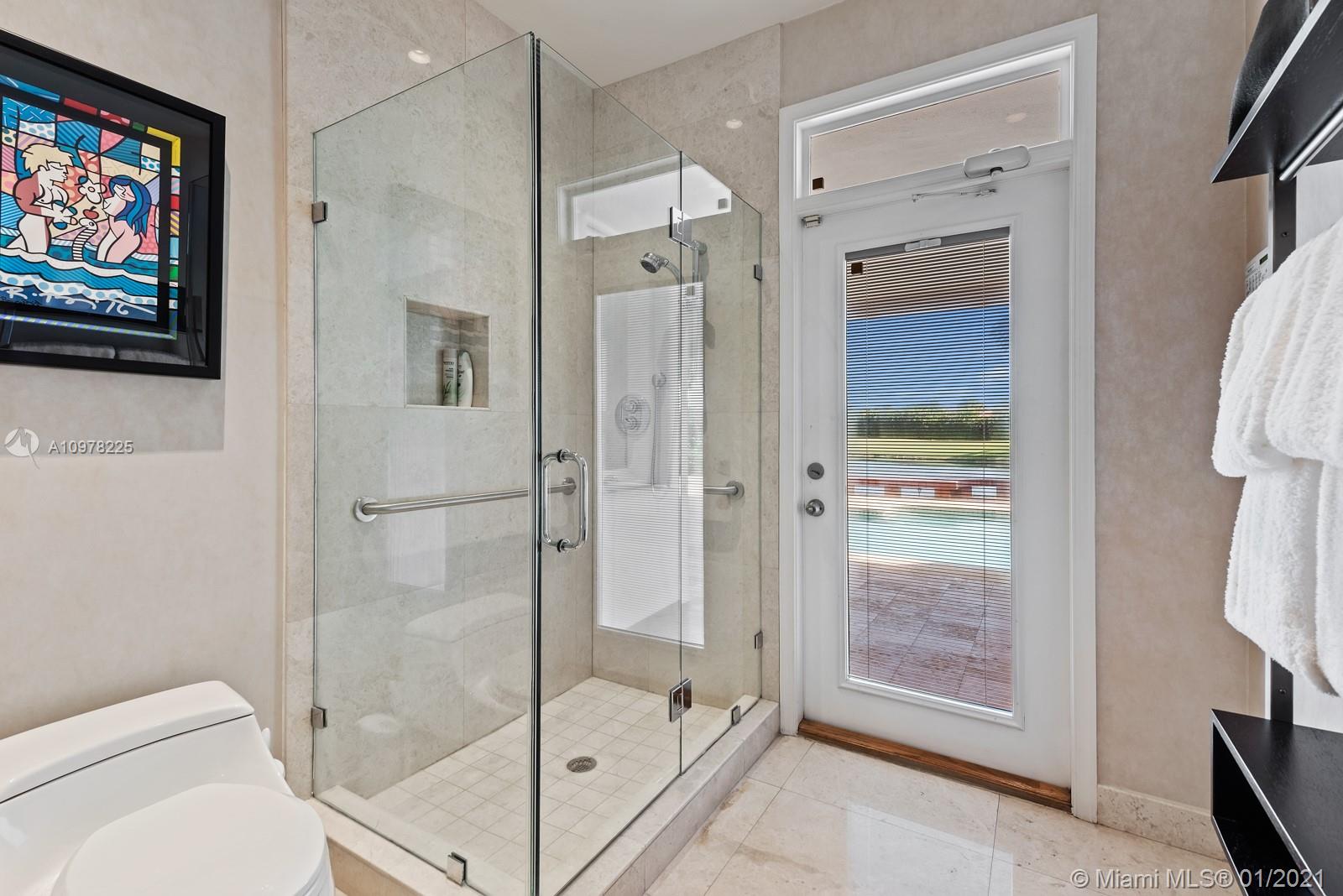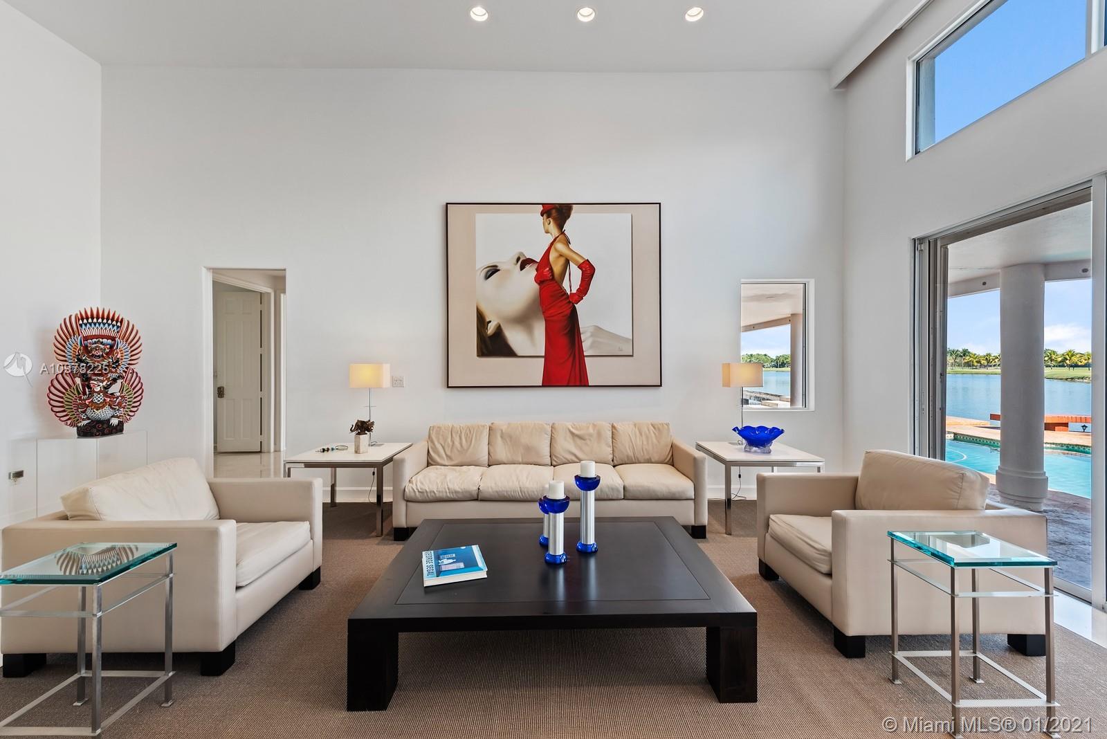 This Splendid Contemporary home is located in the exclusive guard-gated private community of Doral Estates. Generous 4 bedroom, 3 bath home has unobstructed views of both the lake and golf course. The spacious, Open Floor Plan with 14 ' ceilings and marble floors is an Entertainer's Dream! Gourmet kitchen features granite countertops and stainless steel appliances. Large Master Bedroom with en-suite whirlpool tub, separate shower and custom walk-in closets. Fabulous features include formal living & dining areas, complete wet bar, ice maker & wine cooler. Enjoy outdoor patio with heated pool, jacuzzi with waterfall features while you lookout onto the spectacular lake & golf course. Hurricane shutters & partial Impact Glass. 20KW, 150 gal. diesel whole house generator. Ready to move in!