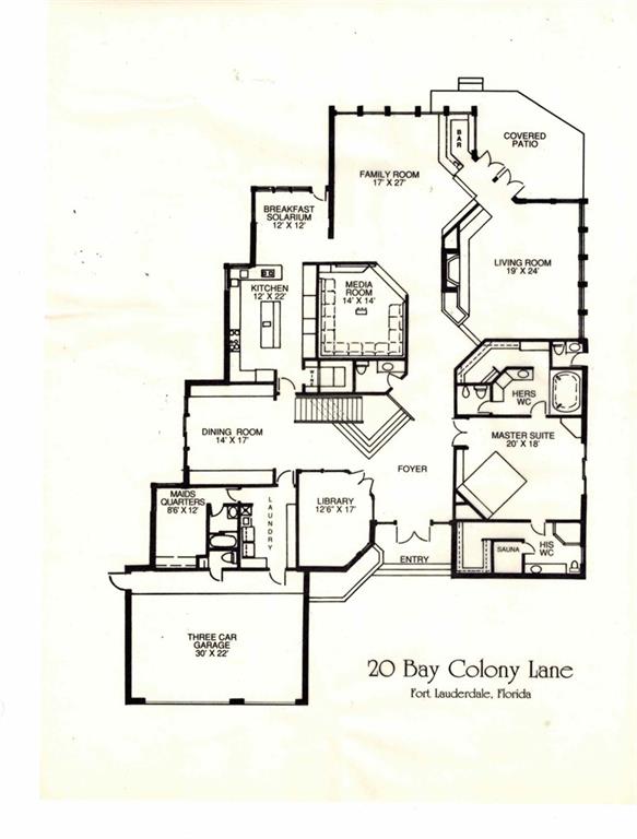 Bay Colony gem priced to sell! Approx 7000 sqft of living area, 3 car garage. Ocean access, no fixed bridges. Huge open floor plan with soaring ceilings, abundant light, marble flooring. Full floor plan in pictures. Beautiful natural coral walls, living room with fire place, family room w/wet bar, sunken acoustically insulated media room. Master bed w/ his/her baths, separate dress area/closets, sauna in his bath, roman tub jacuzzi & bidet in her bath. Rooms are very large w/private bathrooms & separate upstairs family room. Separate housekeeper's quarters. Downstairs common areas all have approx 22 ft ceiling height. Huge backyard with natural coral covered/open patio, & oversized pool. 185 feet total dock space, 75ft with house, 110ft adjacent for sale separately, lot 20a.