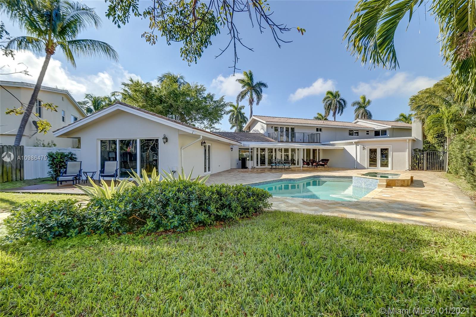 Tropical waterfront & lake views from this beautifully updated corner lot mansion in the coveted Lake Santa Barbara Shores area of Pompano Beach. This bright open concept 2-story pool home features abundant living space. Master suites both up & downstairs, each w/ private deck overlooking water. The huge chef's kitchen is fit for entertaining w/ 2 counter depth stainless refrigerators. Large driveway + oversized 2 car garage, spacious fenced-in patio w/ pool/spa, IMPACT windows & doors throughout, stone surround fireplace, private ELEVATOR, new professional landscaping & dockage for an approx 40ft boat. Zoned for A Rated McNab Elementary School. Northern Exposure for cool breezes. Minutes by boat to Hillsboro Inlet, a quick drive to Pompano Pier & dining, i95 & Ft. Lauderdale.