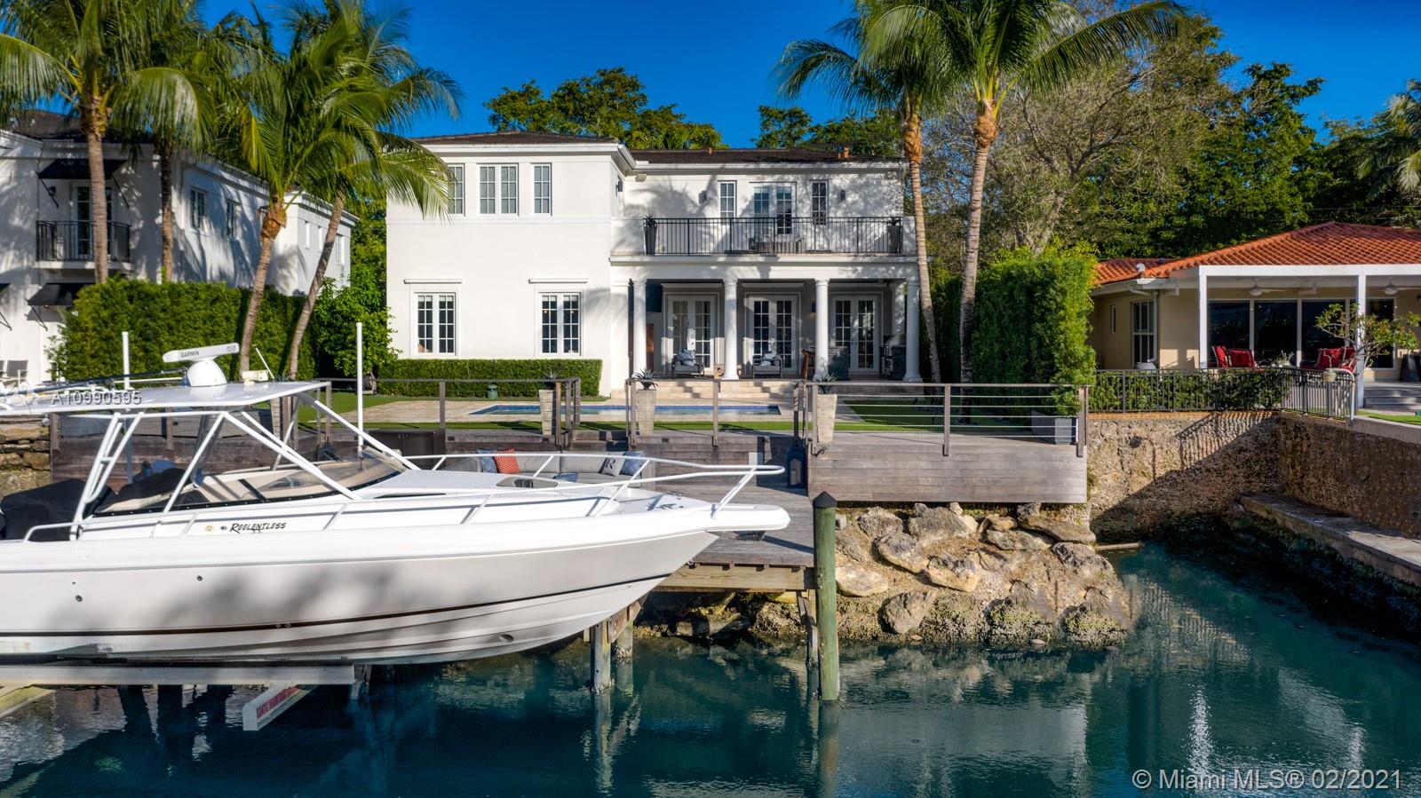 Gorgeous waterfront home located on the prestigious Coral Gables Waterway. It is a stunning contemporary French-inspired chateau on a 9,126 sf lot. The 4BR/4.5BA 4,078 total sf home includes hurricane impact windows and doors, marble floors, marble and granite countertops, high ceilings with recessed lighting, whole property sound system with zones, 13-camera security system, and wifi extenders. Less than 60' of water frontage, boat lift, and 600+ sq ft Brazilian Ipe dock with waterside seating area give access to Biscayne Bay. Gourmet eat-in kitchen is complemented by an outdoor summer kitchen complete with Lynx grill and side burner, icemaker, refrigerator and more, overlooking a sparkling saltwater pool. Generator with an underground propane tank will run the entire house for 4 days.