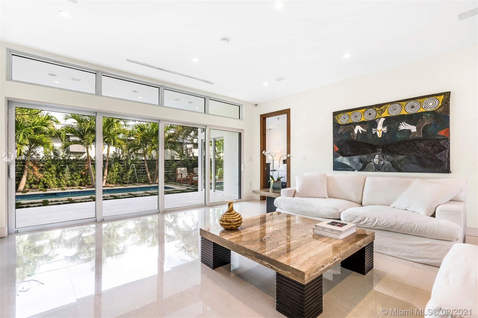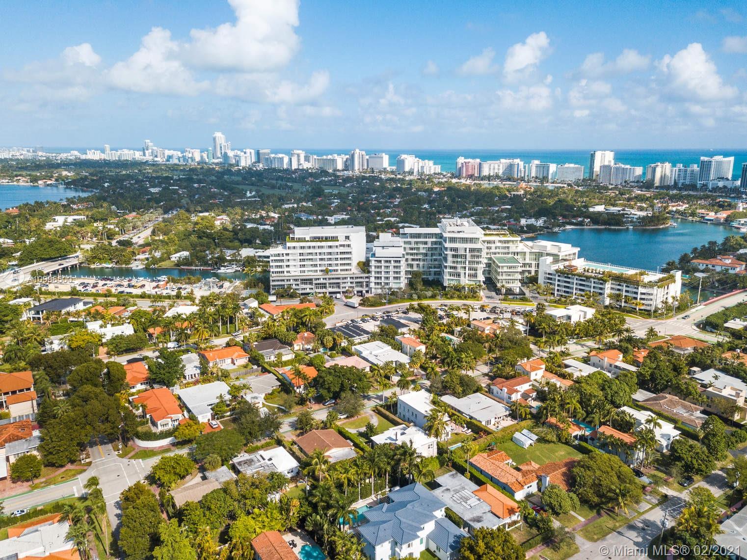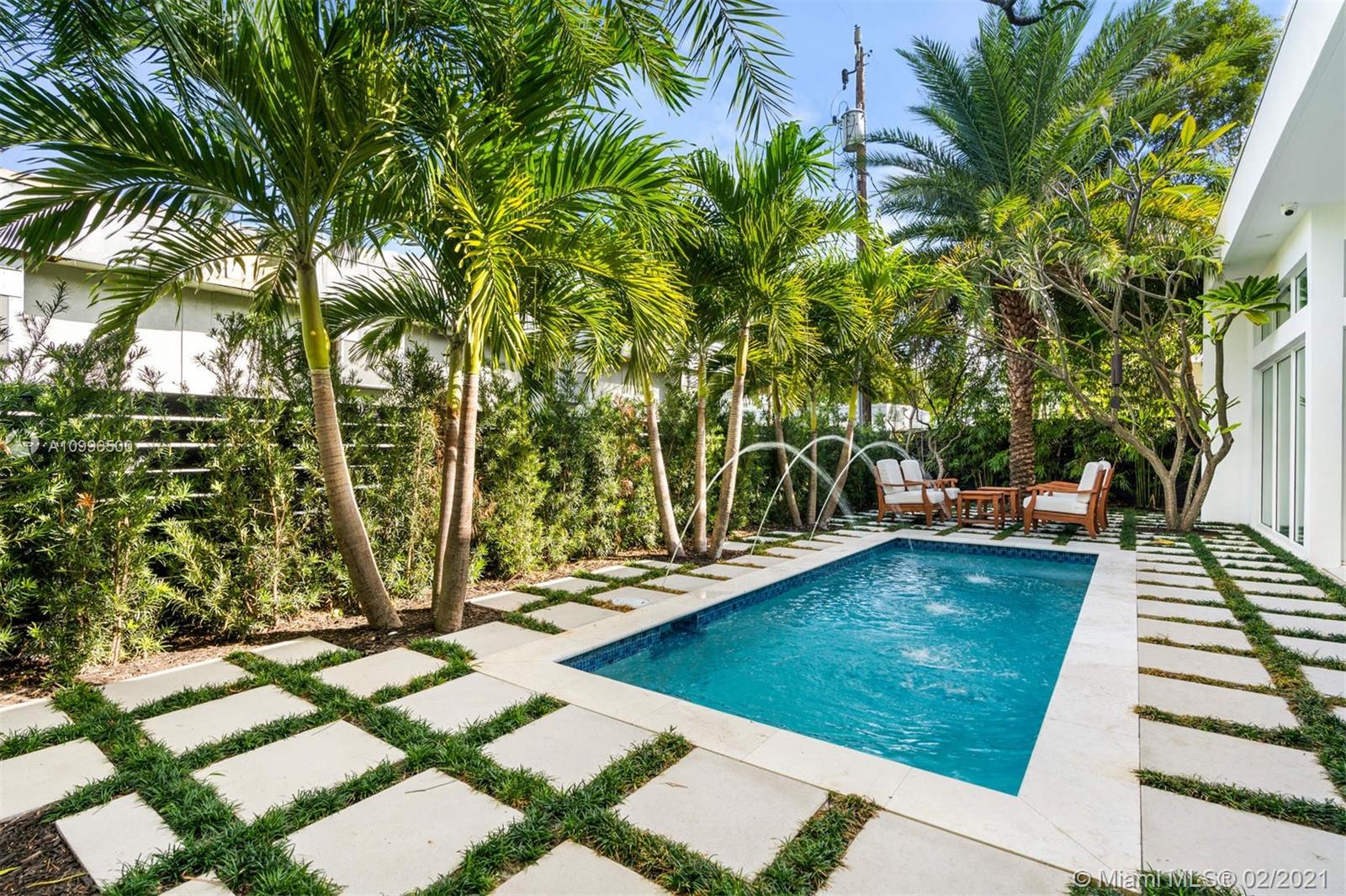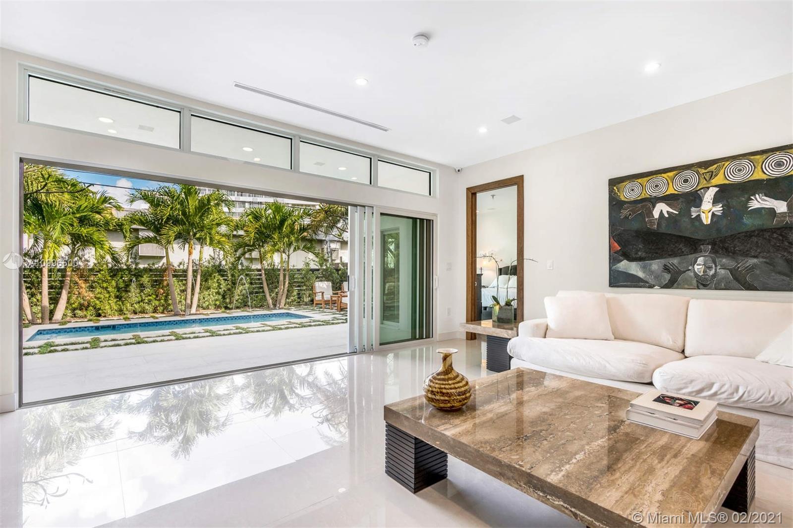New construction.Mid-century one story home adjacent to the newly finished Ritz-Carlton Residences in Miami Beach. Quiet residential neighborhood in the heart of Miami Beach. Grand reception areas with vaulted ceilings and comfortable open spaces leading to the landscaped patio featuring soothing sounds of the resort style pool with water fountain. Large master suite floor to ceiling windows. Spa inspired master bath with rain shower and steam. Open kitchen with Viking appliances and gas range. Separate guest quarters with private entrance and kitchenette. Functional floor plan. Modern comfort in an understated elegant feel for a perfect Miami Beach lifestyle.
