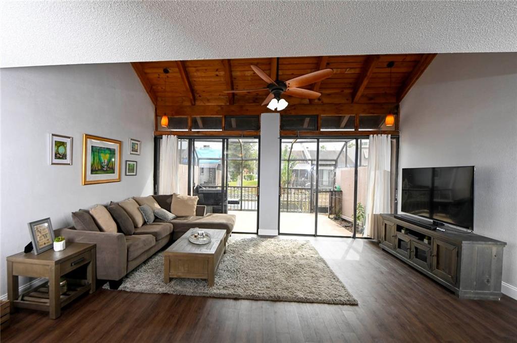 Spectacular waterfront 2 bedroom, 2 bathroom townhome in the sought after community of Villas Lakes. Welcoming spacious layout with vaulted wood ceilings and great views of the water. Vinyl wood flooring throughout the living area, with carpeting in the bedrooms. Large master bedroom with a loft and walk in closet. New stainless steel appliances in the kitchen (2016). Amenities include 24 hour patrol security, cable television, Olympic size pool, tennis courts, basketball and racquetball courts, two assigned parking spaces and plenty of guest parking. Enjoy the evening sky from the large screened in patio or on your very own outdoor dock! Brand New roof and Brand New AC.. This property is a must see!