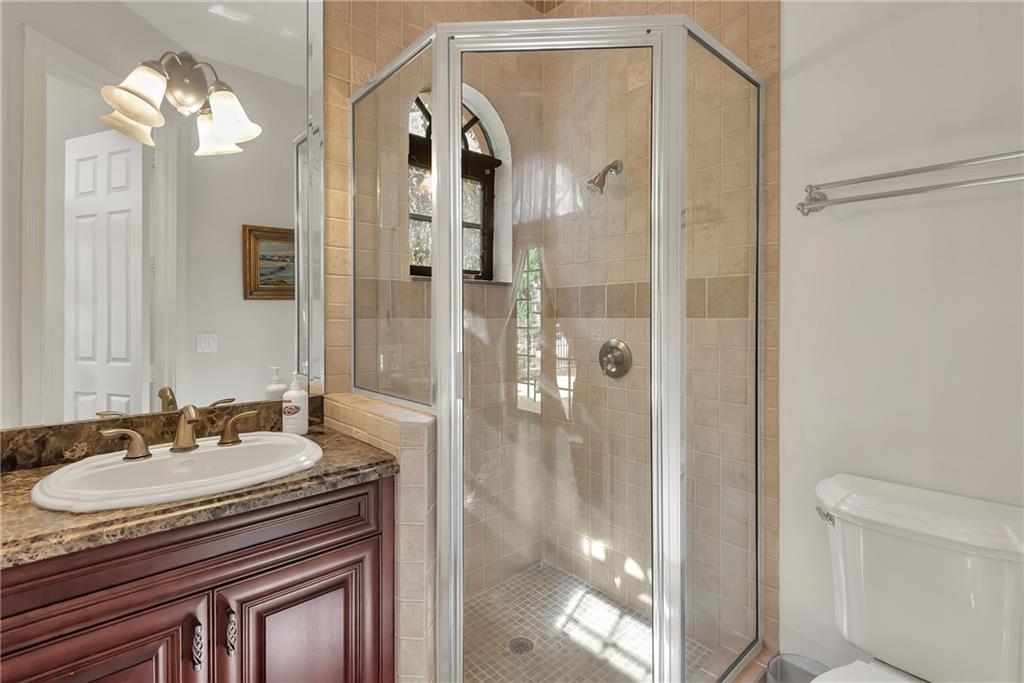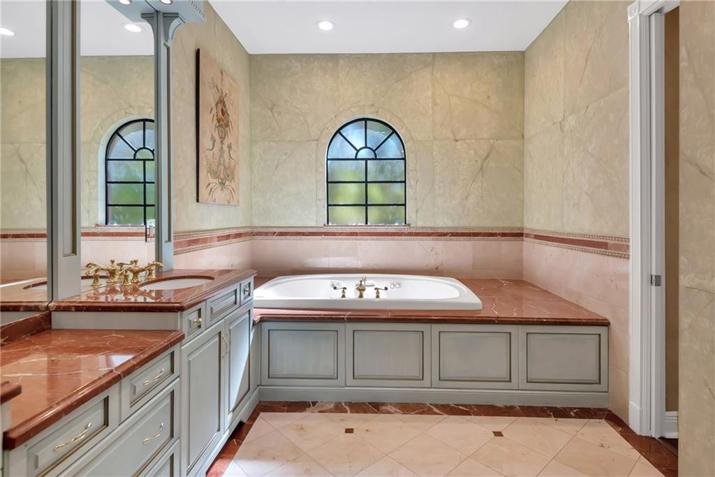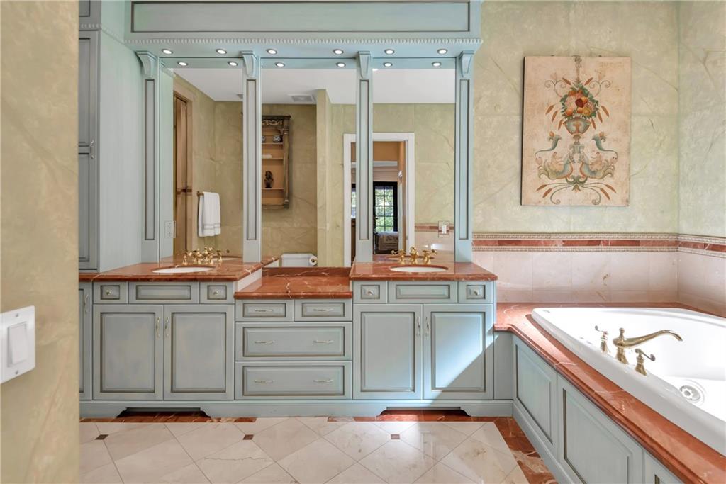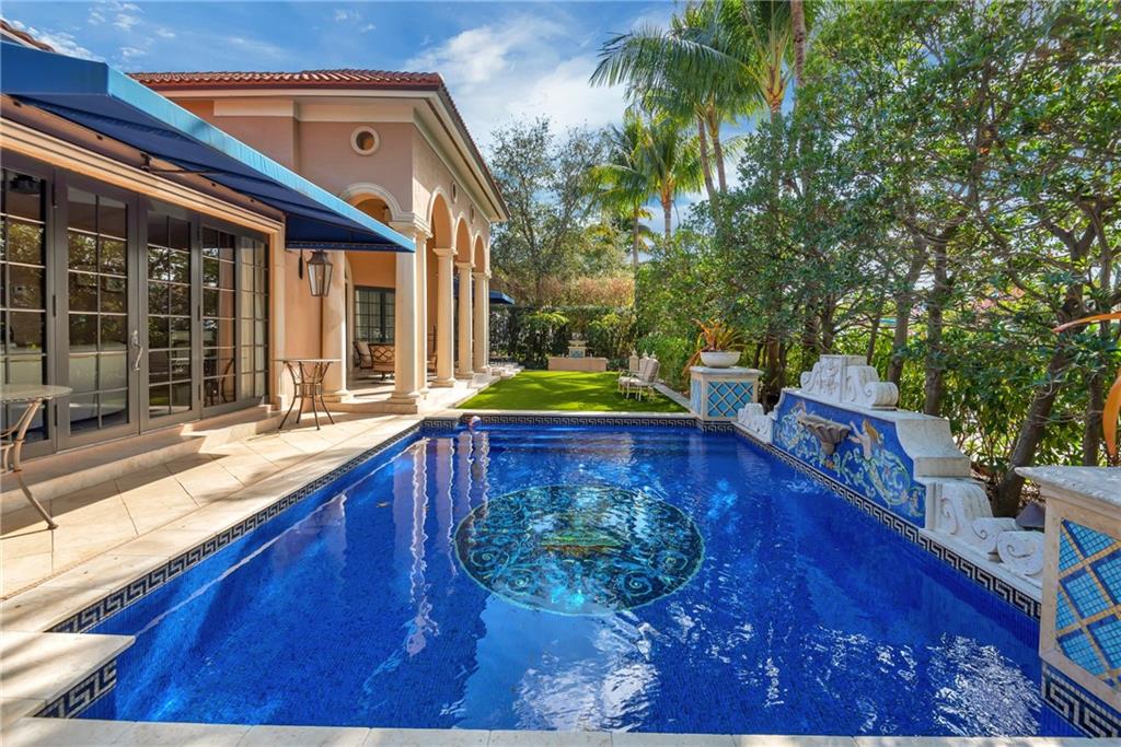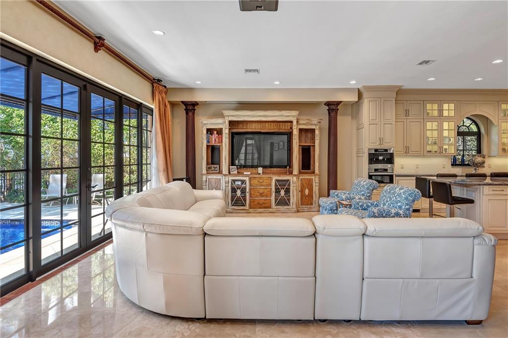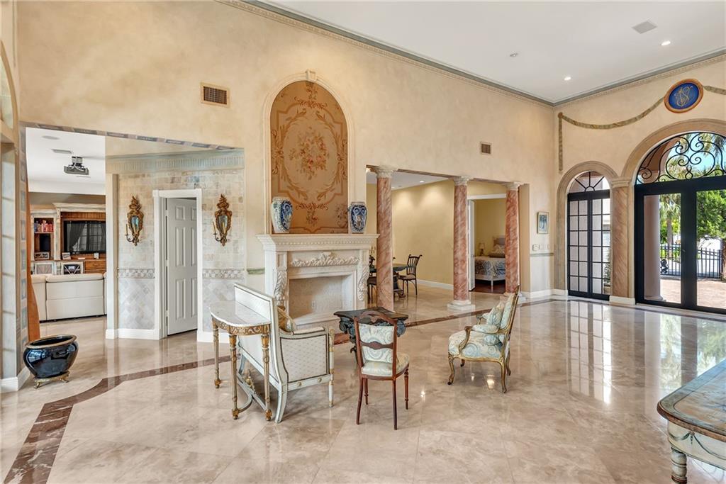 Elegant Mediterranean waterfront estate. E-Gated property features volume ceilings and architectural detail, with a light filled, warm ambiance. Marble and wood floors, granite countertops, chef's kitchen with Subzero Refrigerator and Wolfe gas range open to family room, beautiful Main Suite on 1st floor with expansive walk in closet and bath, separate entrance for Guest/In-Law Suite or Maids Quarters, UG propane tank, Gas Generator, 7 beds per County Records, one bed converted into large laundry/maids workplace, one bed used as Guest Suite's sitting area. Furniture negotiable.