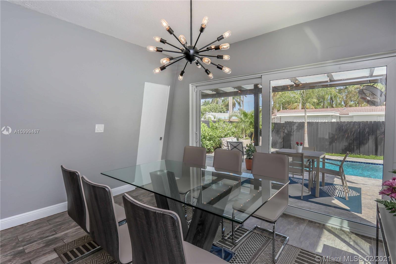 Contemporary 2 Bed/2 Bath residence with tropical landscaping and pool oasis. Featuring a circular drive, open porch, modern yet warm design elements. This superbly stylized layout continues with beautiful wood porcelain tile flooring, a sunlit living space and an open concept kitchen featuring custom island, concrete countertops, light cherry wood tone cabinetry, tile accents, ss appliances & gas stove leading to dining area. Oversized master bedroom/bath features a dual faucet sink with rainfall shower for a spa-like experience. An outdoor oasis awaits with a brand new saltwater pool perfect for entertaining. Features: Tankless Water Heater, Digital Nest Thermo, Pre-wired for ADT Camera System, Hurricane Impact Win/Shutters, Saltwater Pool, Deck, Landscaping & Lighting, Roof, AC, Shed.