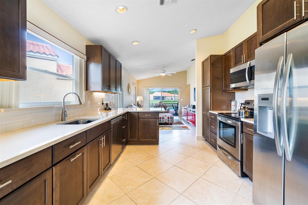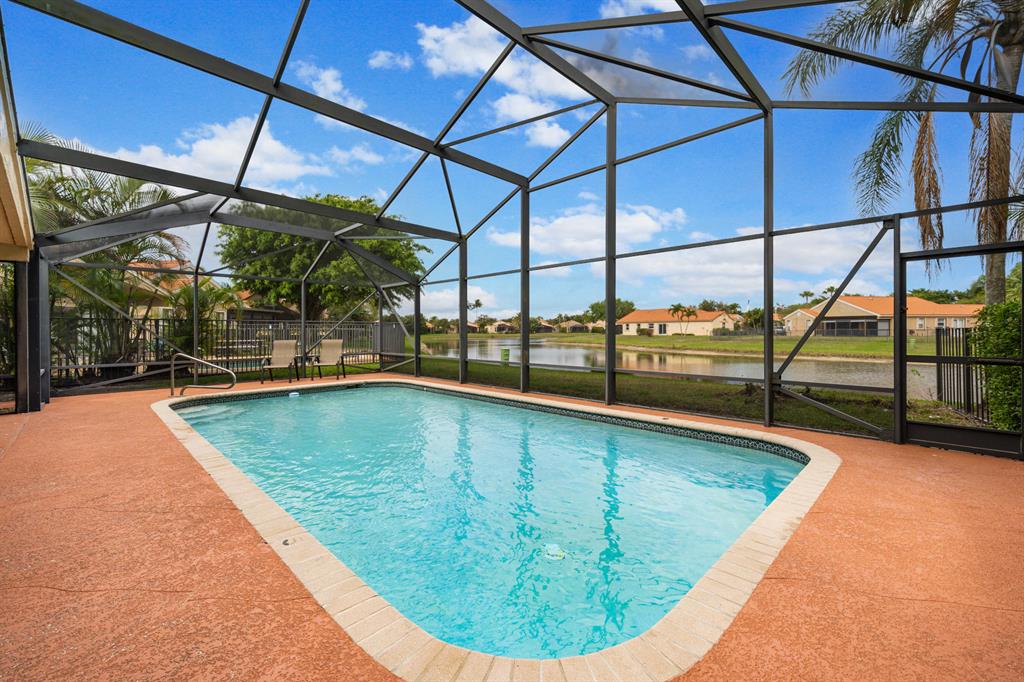 Welcome home to this highly desirable Aspen model lakefront home in Brentwood Estates. This beautifully updated 3 bedroom 2 bath Spanish/Mediterranean style pool home is awaiting your finishing touch! Features include recently updated kitchen cabinets with Silestone countertop (2019) with stainless steel appliances, spacious living room/dining room, eat-in-kitchen, familyroom, vaulted ceilings, as well as upgraded, neutral ceramic tile throughout. Enjoy the stunning wide lake view, from your private backyard. Additional features include a heated pool with screen enclosure, 2 car garage, alarm and sprinkler system. Most recent upgrades include A/C (2019), hurricane shutters (2019) and pool pump (2020).Continued....